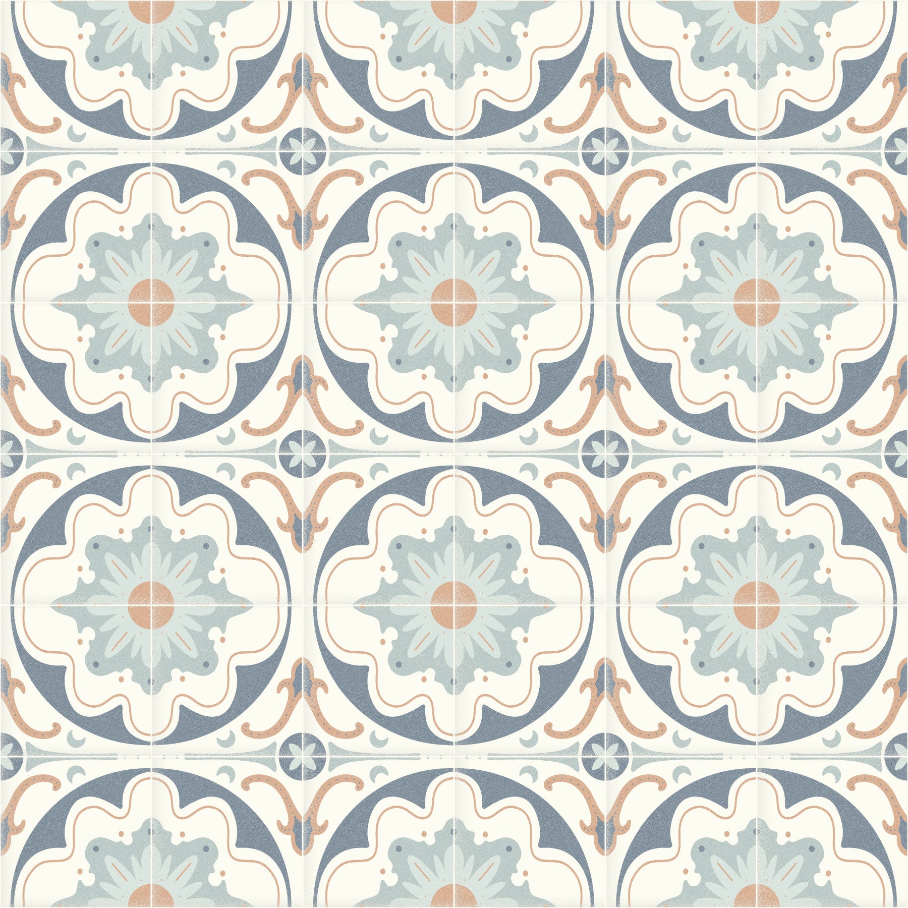 Evoke a sense of timeless charm with this stunning wallpaper, 'Aged Cement Tile Backsplashes - Navy'. This design captures the beauty of handcrafted cement tiles, showcasing a repeating pattern reminiscent of vintage kitchens and bathrooms. The intricate floral motifs are outlined in a soft, aged navy, creating a striking contrast against the subtle ivory background. A touch of muted terracotta adds warmth and depth to the design, enhancing its overall appeal. The slightly textured appearance mimics the look and feel of genuine cement, adding a touch of rustic elegance to any space. Perfect for adding a touch of old-world sophistication to modern interiors, this wallpaper brings a unique blend of classic design and contemporary style. Whether you’re looking to create a statement wall or simply add a subtle touch of character, this wallpaper is sure to transform any room into a haven of style and comfort.