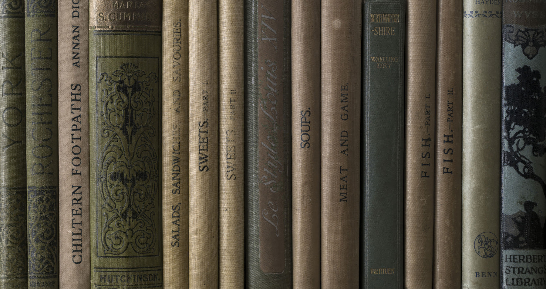 Old books on a shelf. Delve into a world of classic literature and gastronomic delight with this meticulously curated bookshelf wallpaper. Featuring vintage cookbooks and literary treasures, this image showcases a warm, inviting palette of muted greens, creams, and browns. Titles such as 'Salads, Sandwiches and Savouries' and 'Meat and Game' hint at a bygone era of culinary artistry, while works like 'Chiltern Footpaths' promise adventures beyond the kitchen. Perfect for creating a sophisticated and cozy ambiance in any room, this wallpaper evokes a sense of nostalgia and intellectual curiosity. Bring the charm of a well-loved library into your digital space, ideal for those who appreciate the finer things in life and seek a timeless aesthetic.