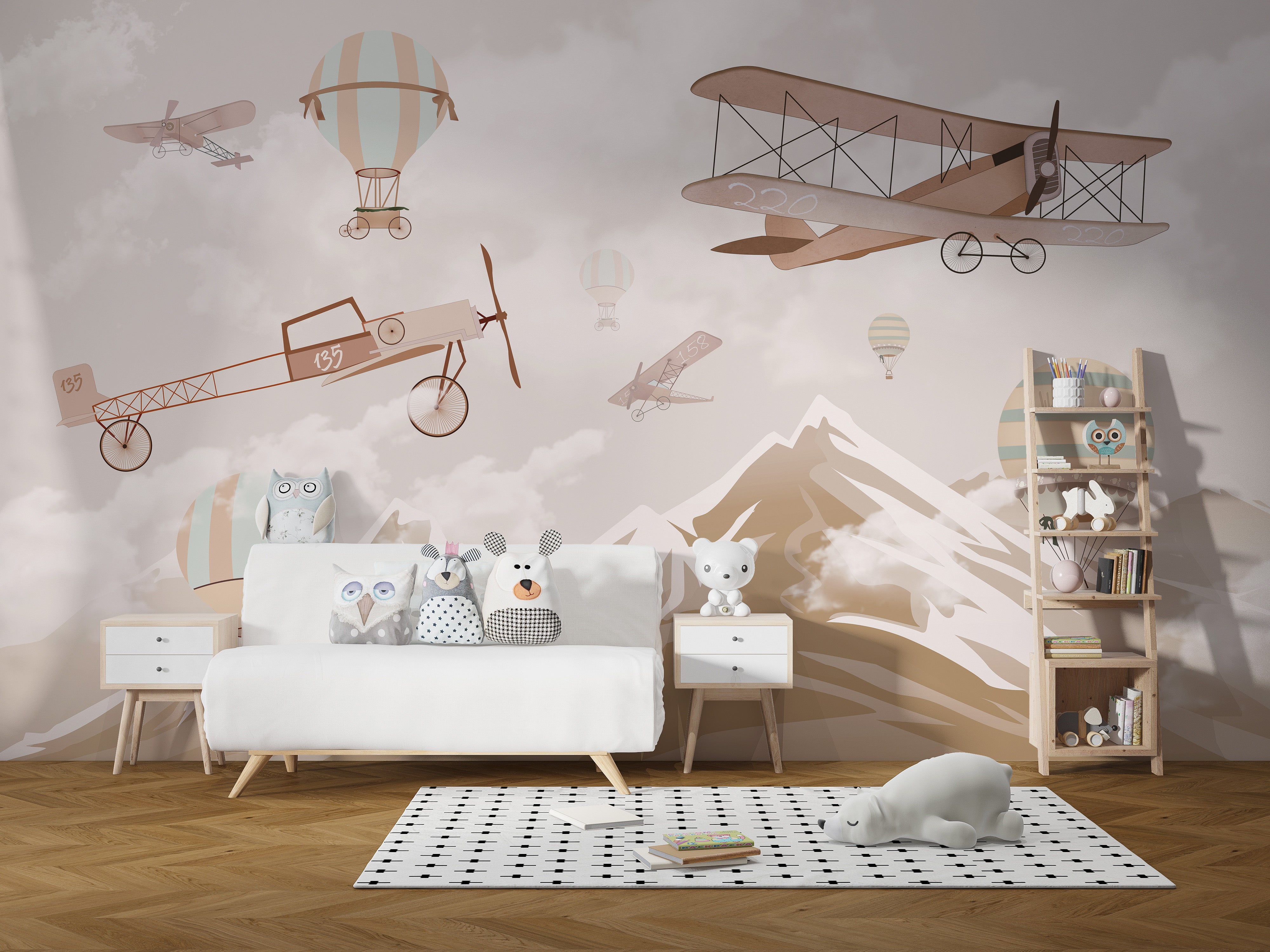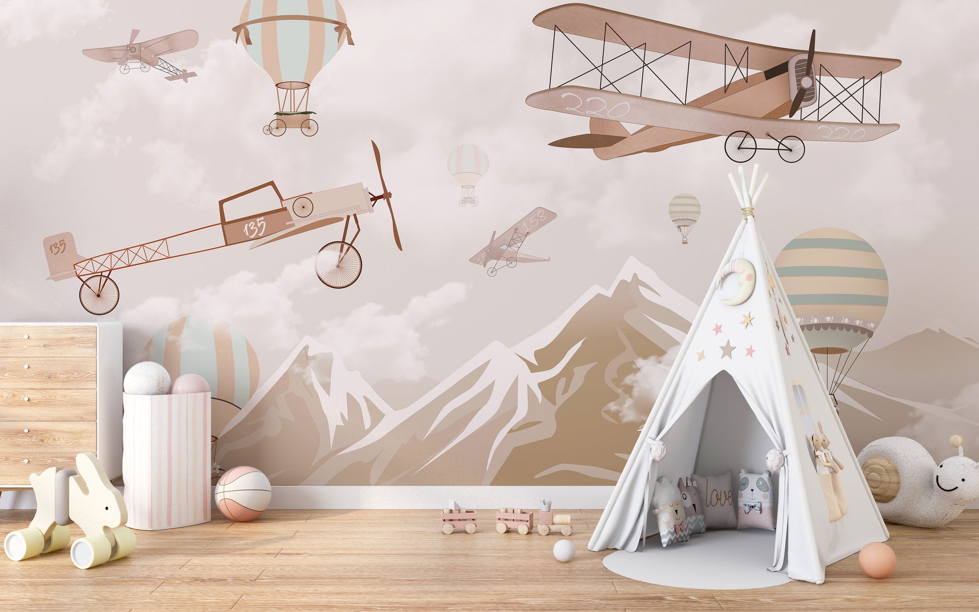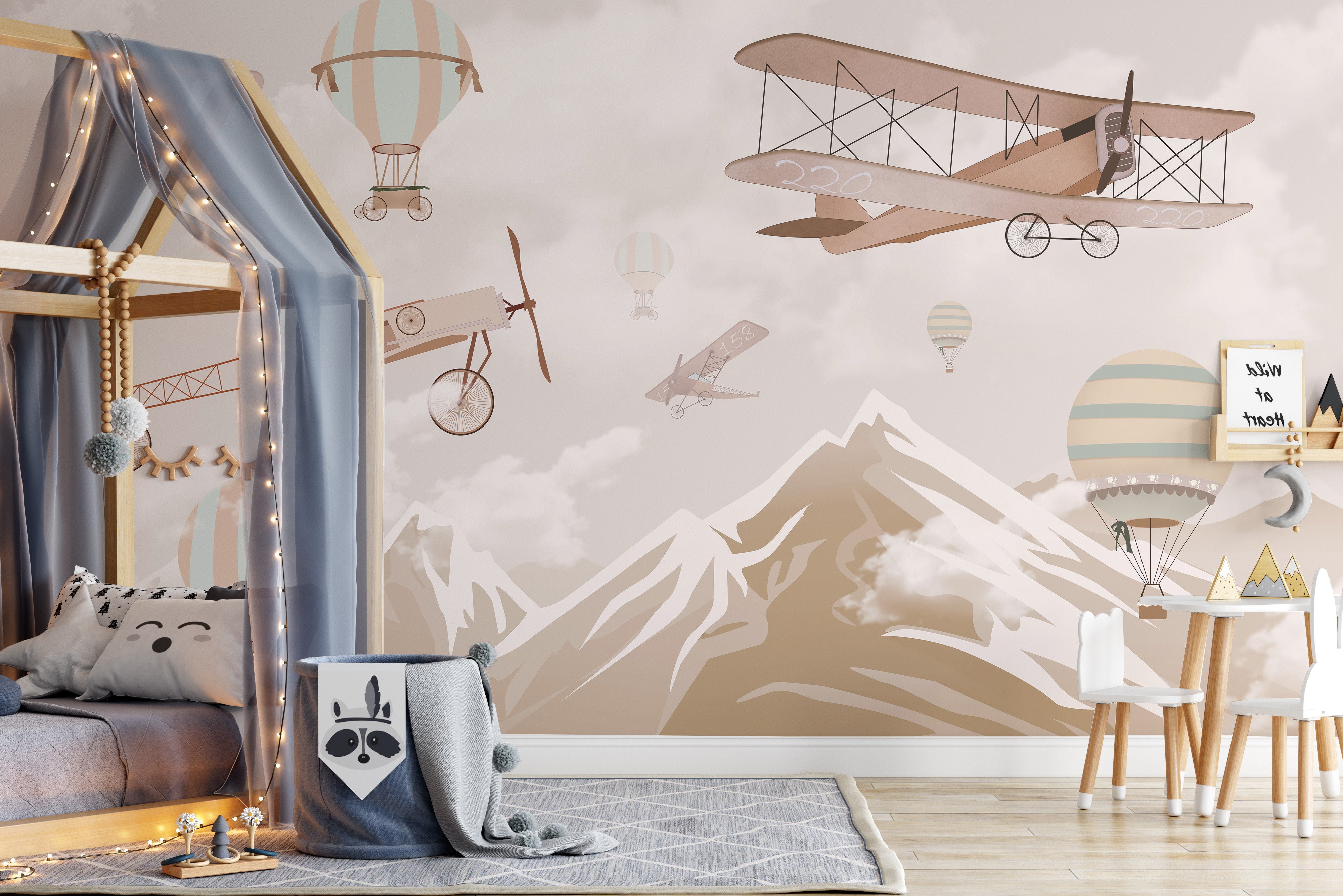 Transform your little one's space into a sky-high escape where stories take flight amidst the peaks and valleys of their very own mountain range. This airplane wallpaper for kids' rooms is more than just a decoration; it's an invitation to dream big and soar even higher. Watch as your child's eyes light up with wonder each time they step into their room, surrounded by the beauty of this mountain wallpaper crafted just for them.