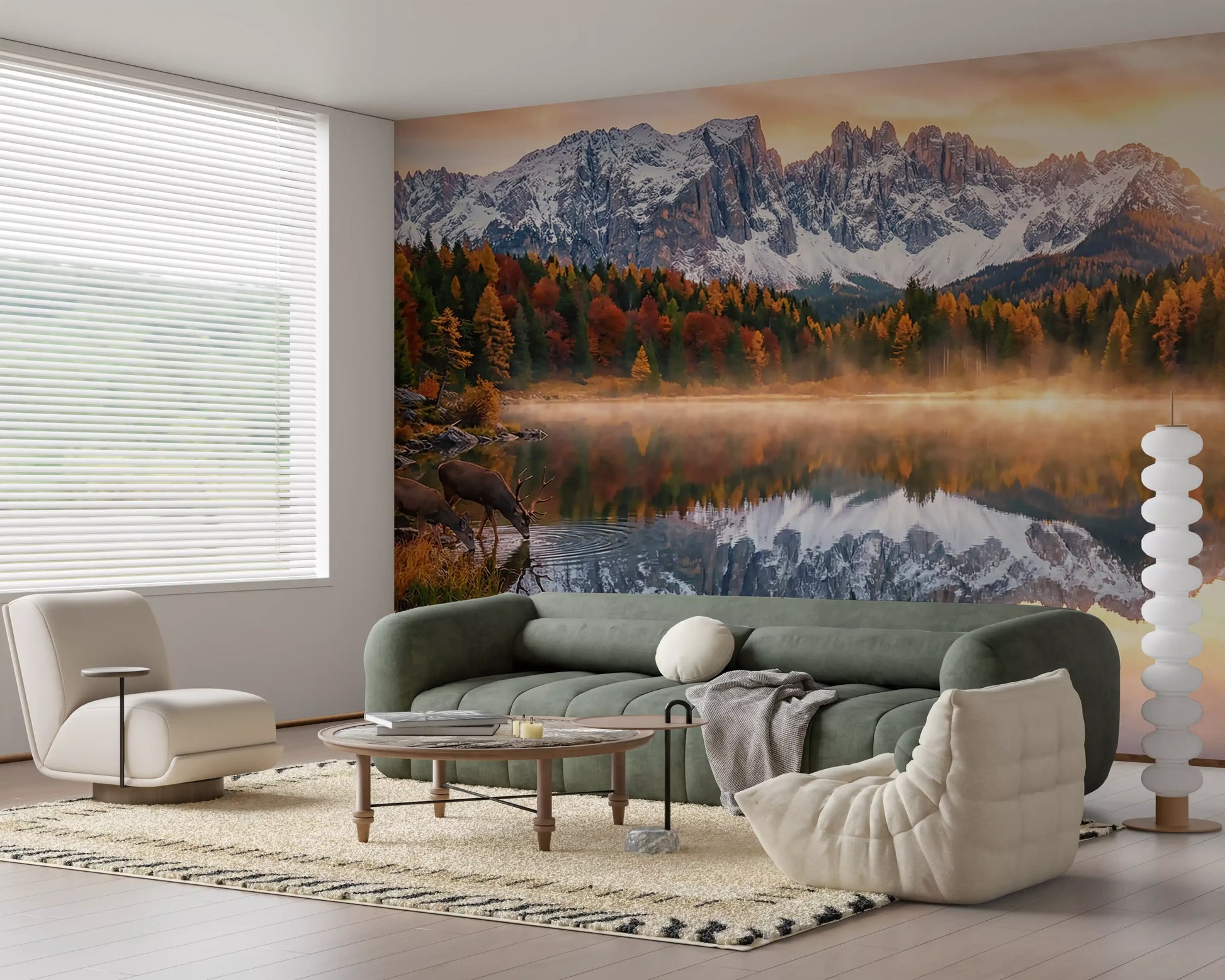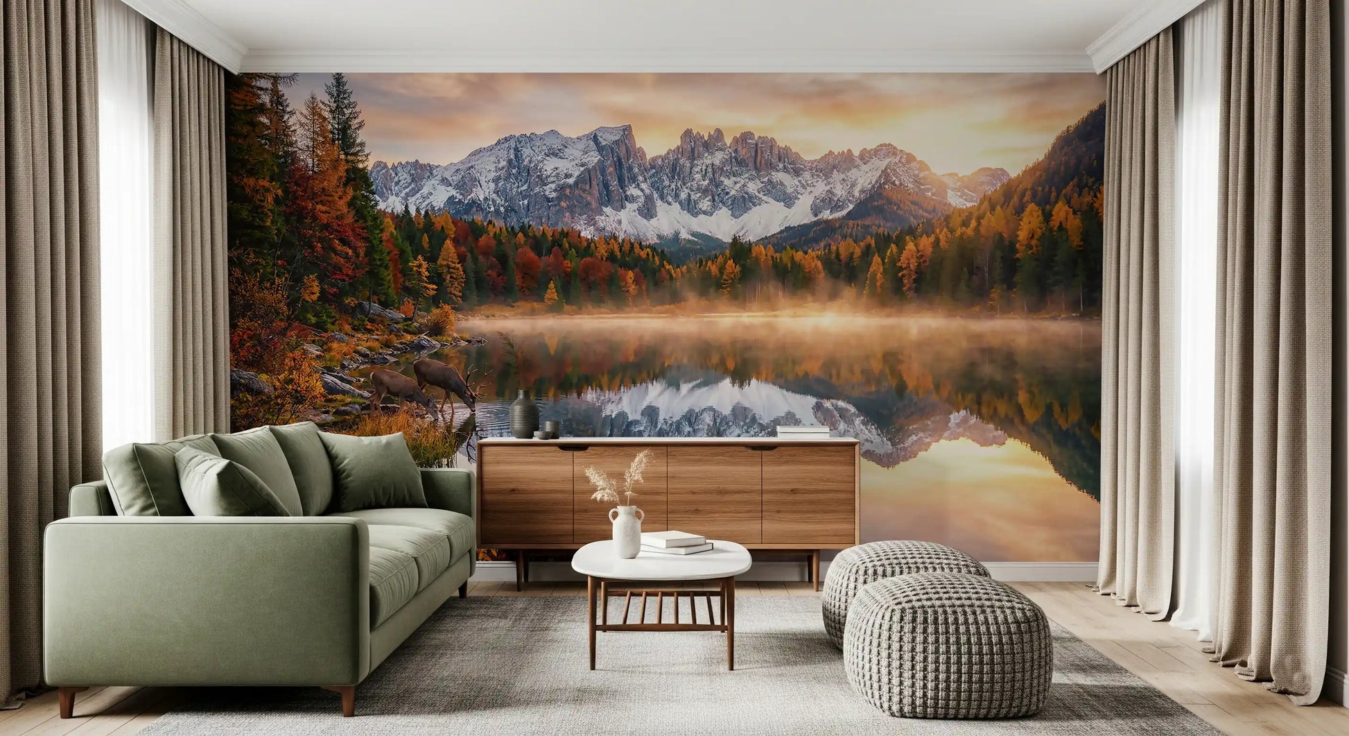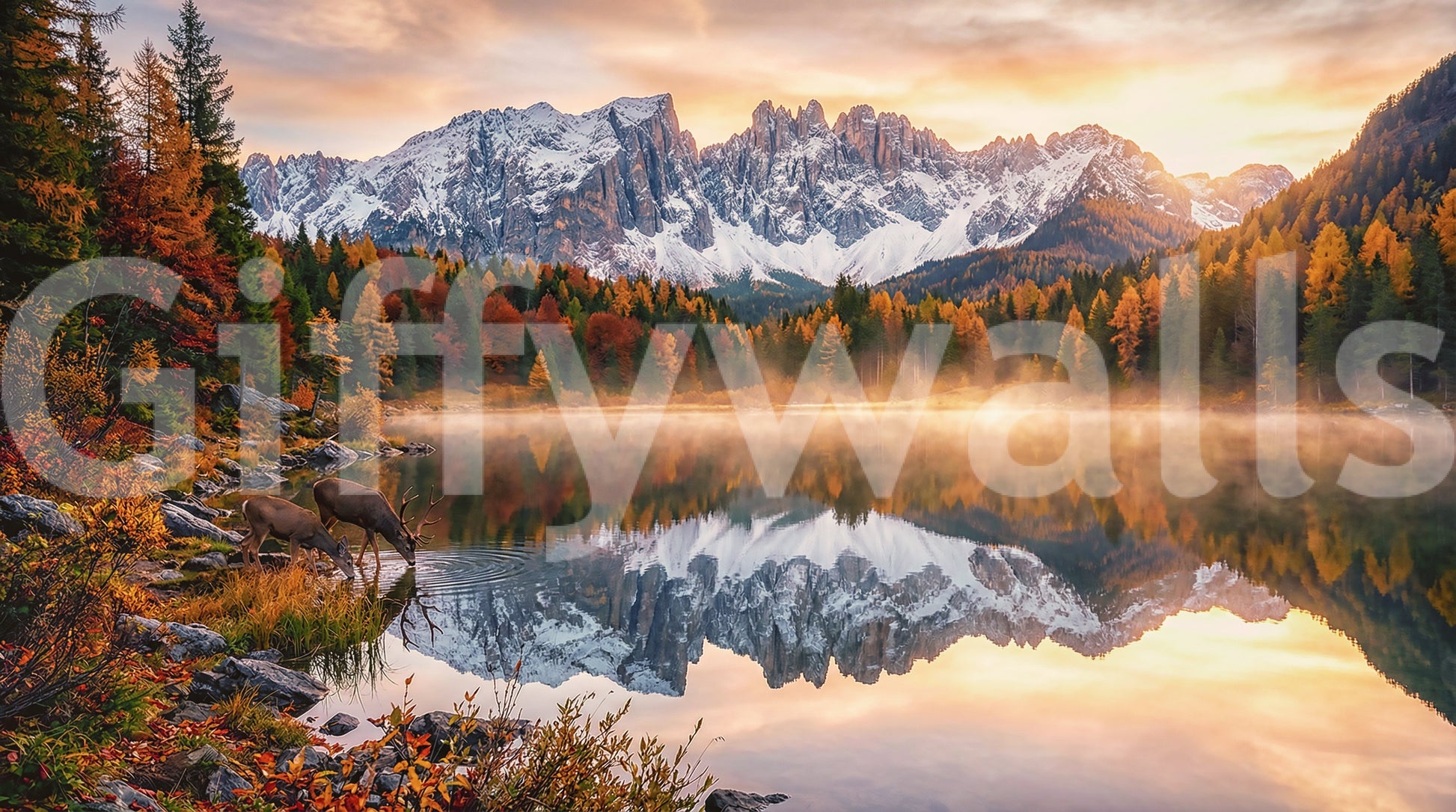 This stunning wallpaper for walls brings the breathtaking beauty of an alpine autumn indoors. Golden sunlight breaks through a misty morning, illuminating a tranquil lake where majestic deer drink peacefully. Rich autumn foliage in warm oranges, reds, and deep greens frames the scene, while rugged, snow-capped peaks dramatically reflect in the still, glassy water. The vibrant yet calming color palette creates a serene atmosphere, adding depth and visual interest to any space. This exquisite landscape design effortlessly enhances living rooms, bedrooms, dining areas, or studies, transforming walls into expansive windows overlooking a pristine natural world. It creates a captivating focal point, inviting quiet contemplation and a sense of escape within your home.