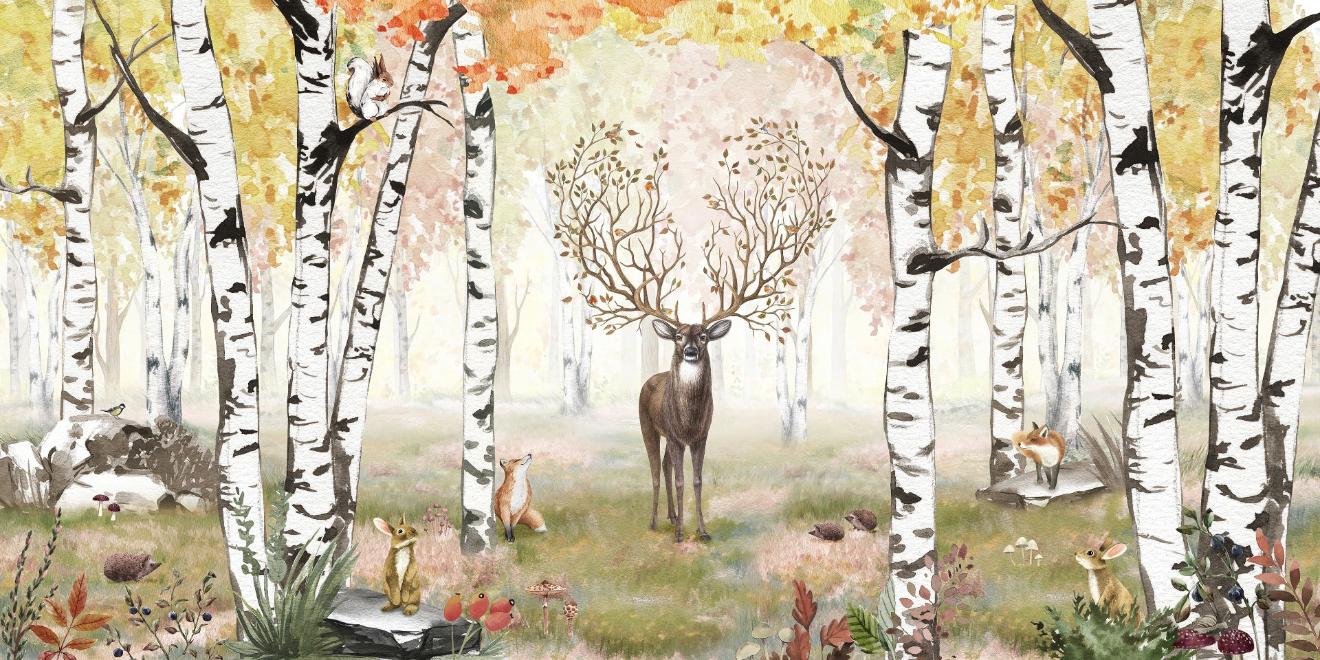 Step into a realm where the magic of the forest comes alive with our Amazing Antlers Autumn Wallpaper Mural! Designed to transform any child's room into an enchanted woodland retreat, this animal wallpaper mural invites your little ones into a world where majestic stags take center stage amidst a gathering of woodland friends. Crafted with exquisite watercolor touches, the mural blooms with hues of orange, yellow, and autumnal warmth, setting a scene straight out of a fairy tale. Each detail, from the bold antlers of noble deer to the curious eyes of hedgehogs, playful foxes, rabbits, and chirping birds, is rendered to spark imagination and wonder. Ideal for nurseries, playrooms, or bedrooms, this wallpaper is a gateway to adventures in nature. Embrace the charm of the forest and the joy of changing seasons. Let the Amazing Antlers Autumn Wallpaper Mural make every day an exploration of beauty and magic for your child.