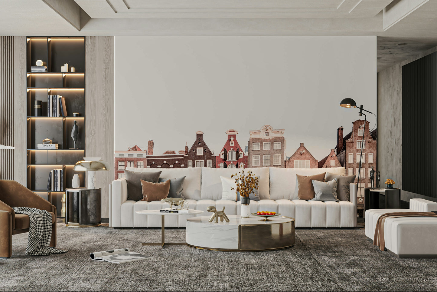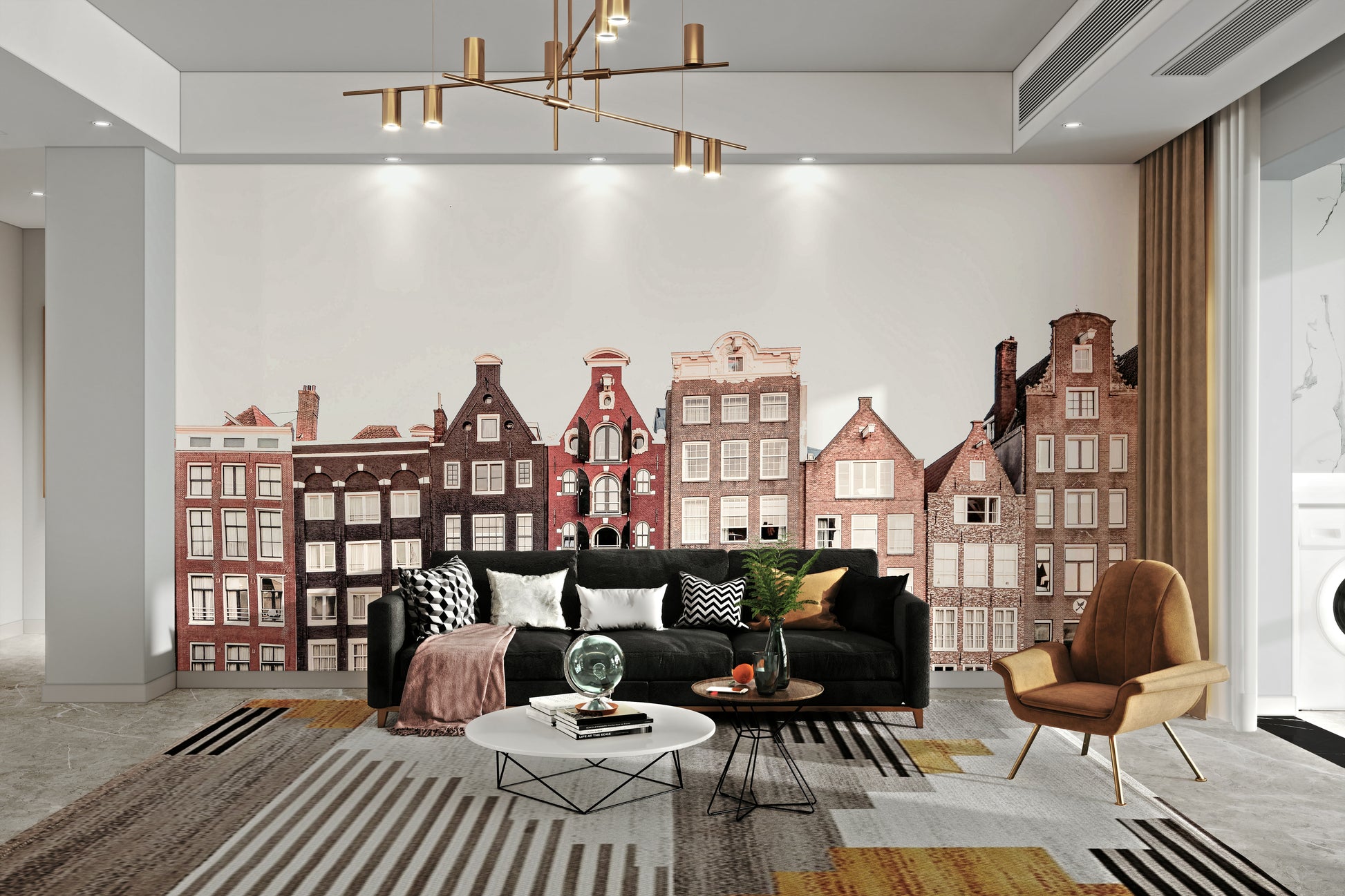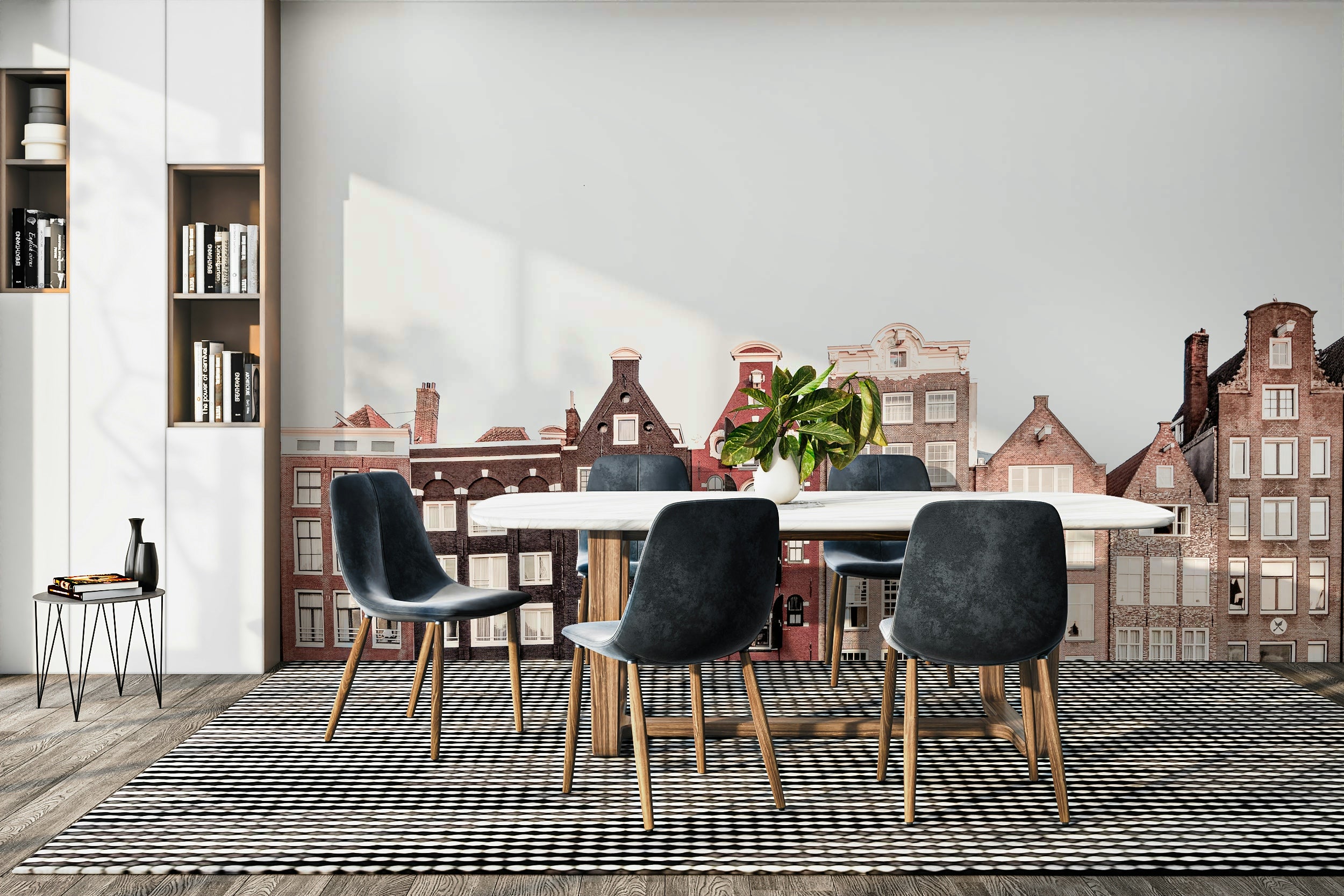 This wallpaper features a captivating row of charming canal houses, typical of Amsterdam's architecture. The image showcases a palette of warm, earthy tones, predominantly reds, browns, and blacks, creating a sense of classic European charm. The clean lines of the buildings and the minimalist white background highlight the architectural details of each unique house. It evokes a feeling of serenity and timeless elegance, perfect for adding a touch of sophisticated European style to any room.