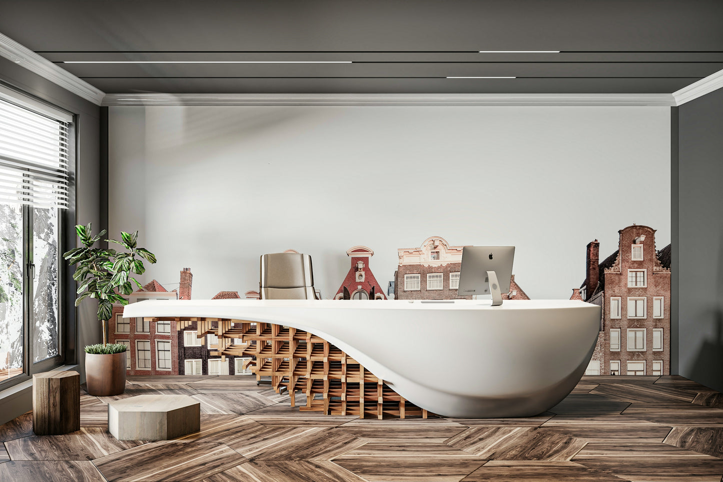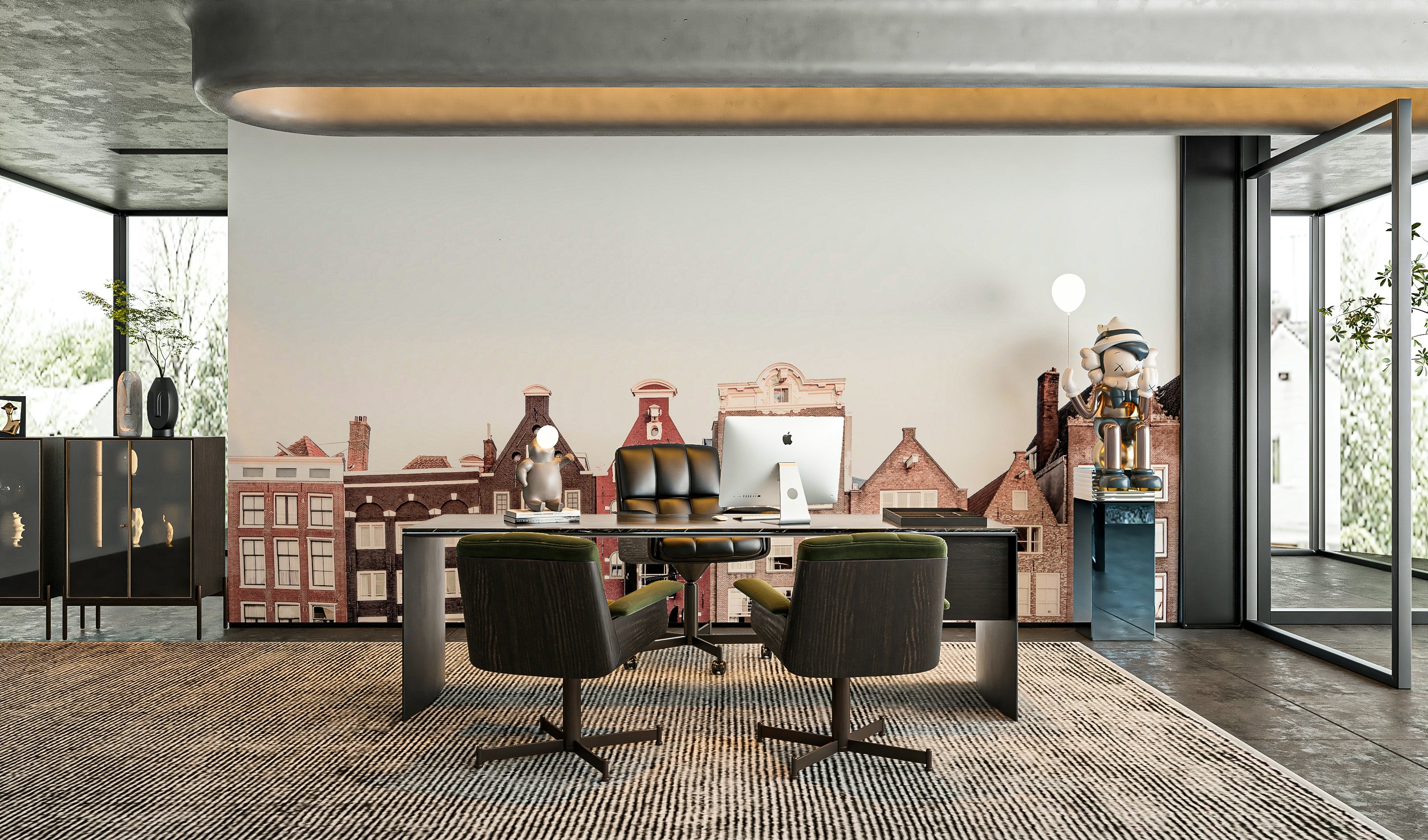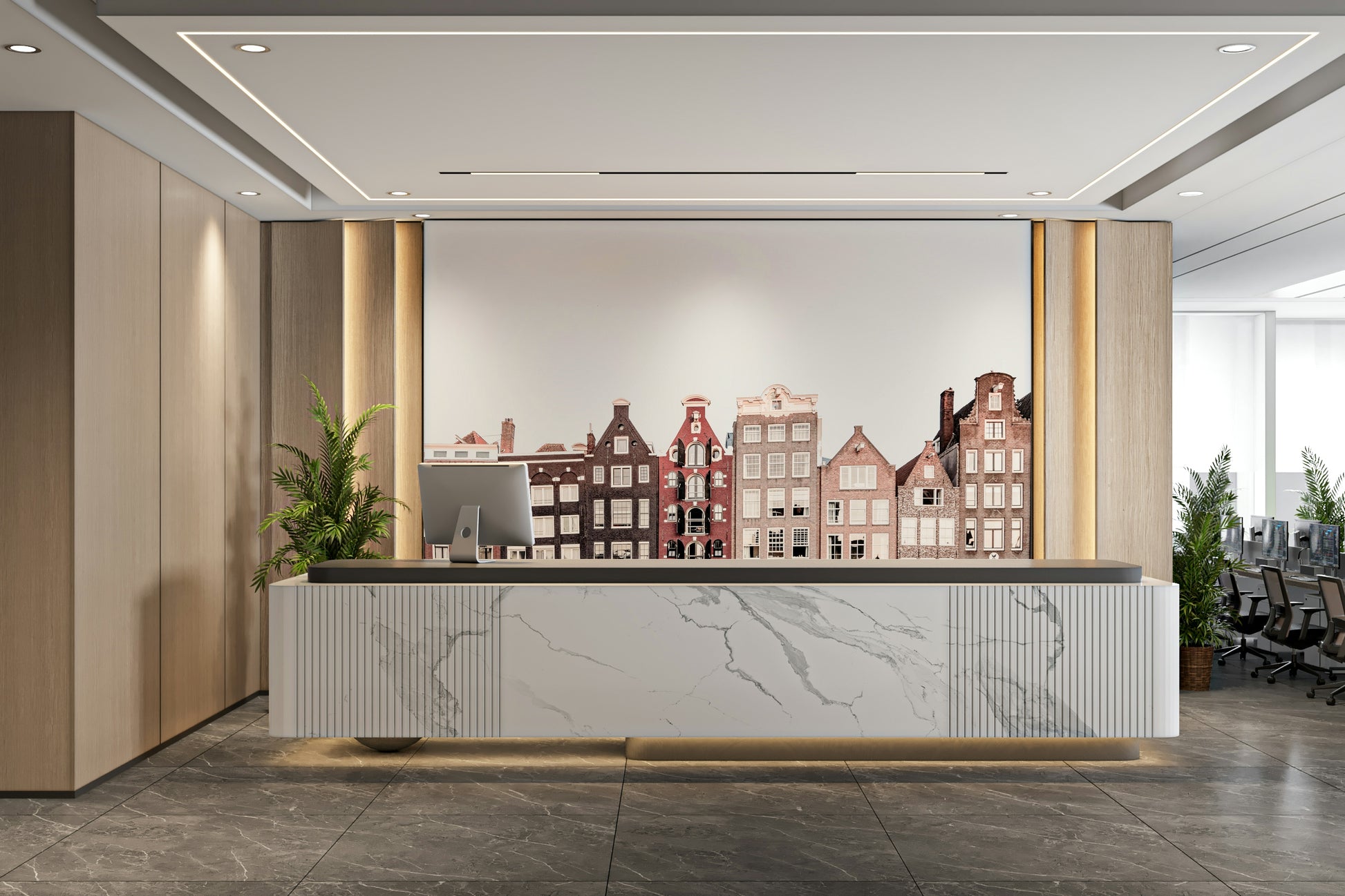 This wallpaper features a captivating row of charming canal houses, typical of Amsterdam's architecture. The image showcases a palette of warm, earthy tones, predominantly reds, browns, and blacks, creating a sense of classic European charm. The clean lines of the buildings and the minimalist white background highlight the architectural details of each unique house. It evokes a feeling of serenity and timeless elegance, perfect for adding a touch of sophisticated European style to any room.