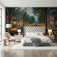 Transform any room with this evocative Amsterdam canal wallpaper for walls. The soft, ambient light reflecting on the water creates a sense of peaceful urban beauty. The architecture of the canal houses, lined by trees, adds depth and character. Golden light from the windows creates a warm glow against the dusky sky. This elegant design suits living rooms, dining areas, or hallways seeking a touch of European charm. The muted color palette and detailed rendering enrich interior spaces, generating an inviting atmosphere. Perfect for adding a sophisticated, calming focal point to your home.