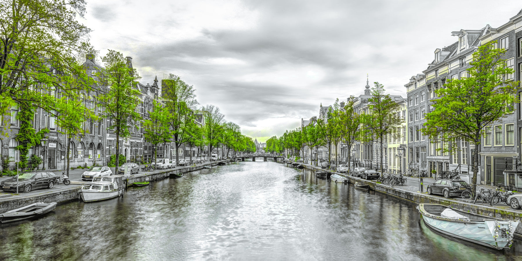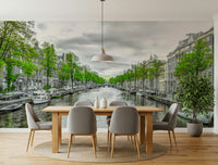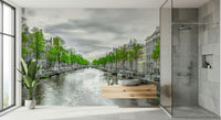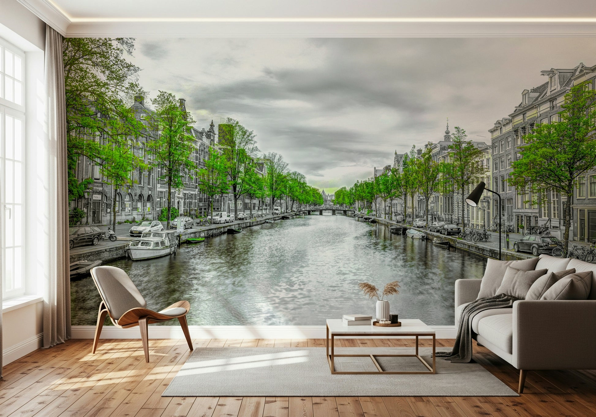 Amsterdam waterfront. Bring the serene beauty of Amsterdam's canals into your home with this calming wallpaper for walls. The design captures the tranquil waterways lined with historic buildings and lush green trees. The monochromatic color scheme, punctuated by vibrant greenery, adds a touch of sophistication to any room. This wallpaper creates a peaceful atmosphere in bedrooms, living rooms, or hallways. It complements both modern and classic interiors, lending a sense of European charm and timeless elegance. Transform your space into a tranquil escape with this stunning design.