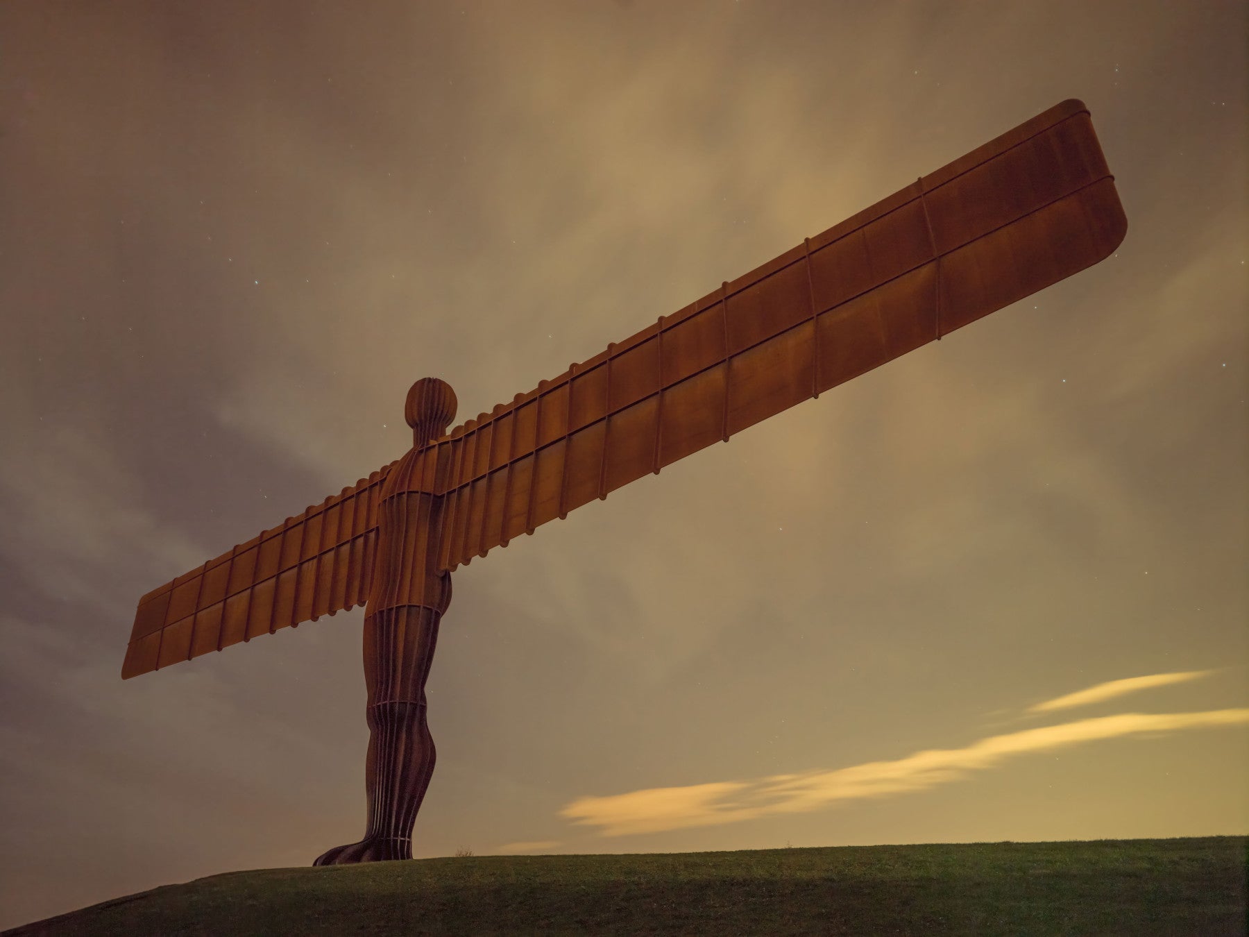 Angel of North landmark wall art, imposing iron figure, dramatic nocturnal view.