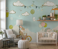 Let your imagination soar with this charming wallpaper for walls. Featuring whimsical animals on bikes and in gondolas, this design evokes a sense of carefree adventure. Birds flutter among puffy clouds and festive bunting against a soft blue backdrop. The playful color palette and hand-drawn style create a cheerful ambiance perfect for a kids' room or nursery. This design complements interiors seeking a lighthearted and imaginative touch.