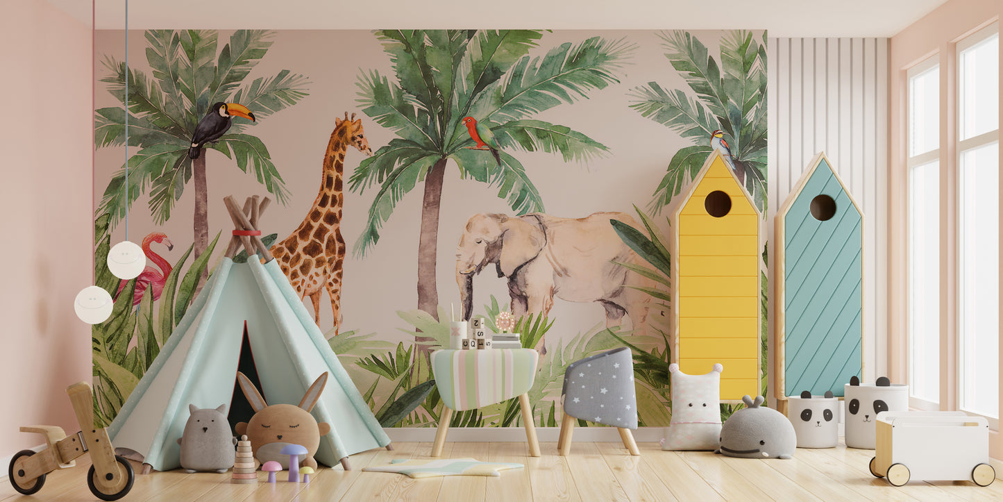 Bring the beauty of the wild into your child's playroom with this stunning, vibrant wildlife, serene kids room mural wallpaper. The watercolor wallpaper will captivate your child's imagination with its strikingly detailed illustrations of different animals in their natural habitat. From graceful deer to majestic lions, this wildlife wallpaper is perfect for creating a serene environment that will entertain your child for hours. This mural's vivid colors and intricate details transform your child's play area into an immersive jungle adventure they'll never want to leave.