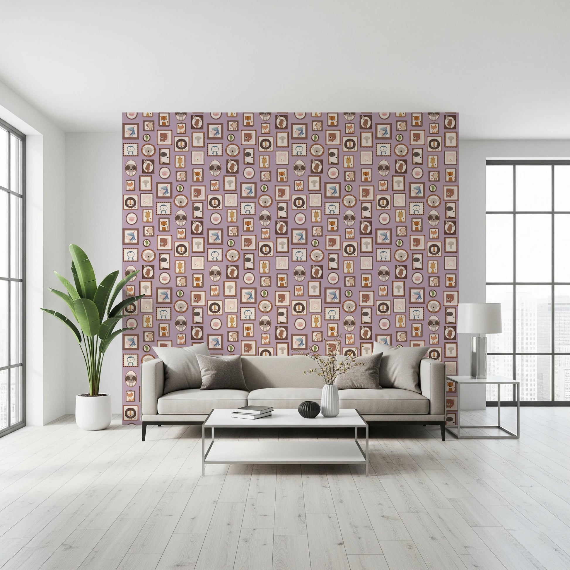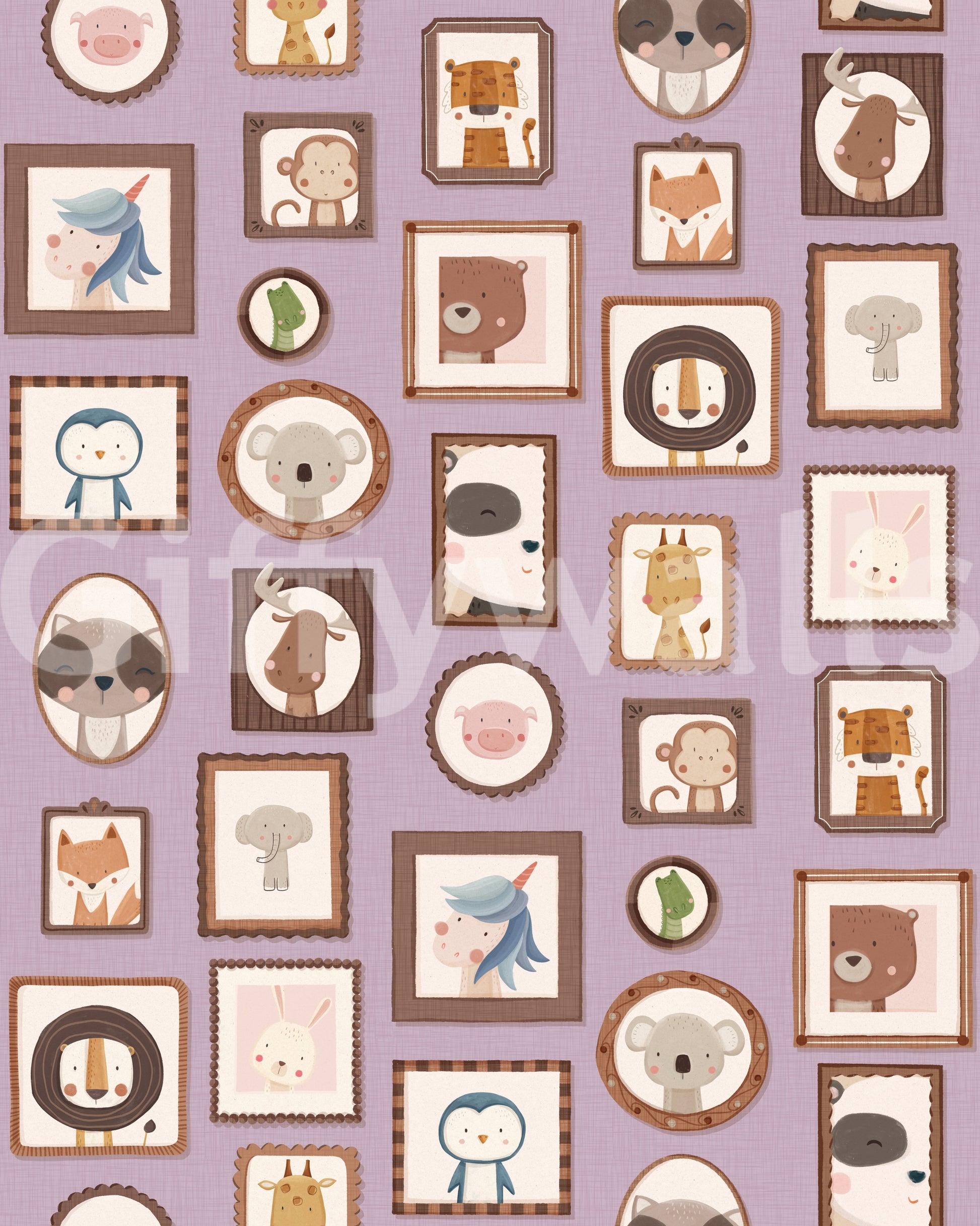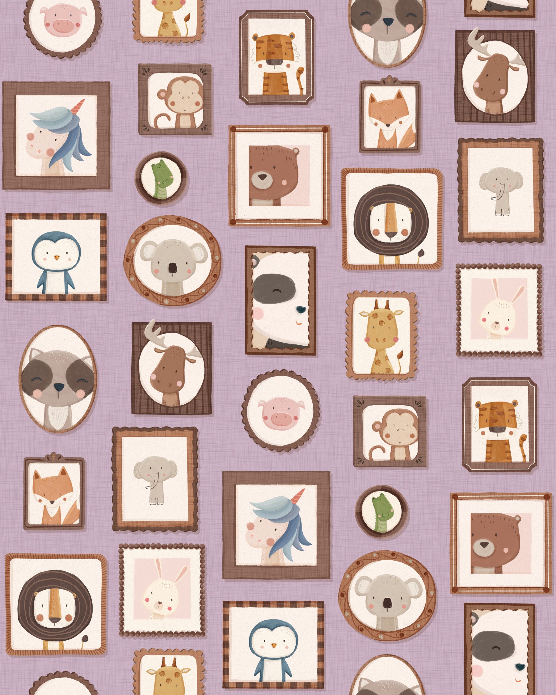 Transform your walls with this charming collection of framed animal portraits. The design showcases a variety of cute creatures, including lions, bears, penguins, and unicorns, each presented in a unique, decorative frame. The soft color palette of lilac, beige, and brown creates a calming and inviting atmosphere. This wallpaper for walls is ideal for kids' rooms, nurseries, or playrooms. It adds a touch of whimsy and sophistication while enhancing the overall décor with its adorable characters and delightful arrangement. Instantly create a cozy and playful space.