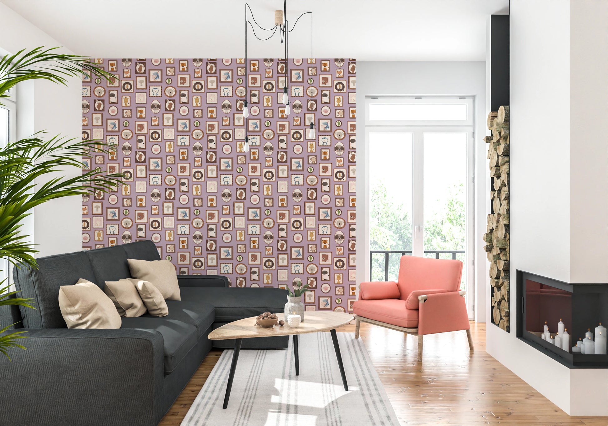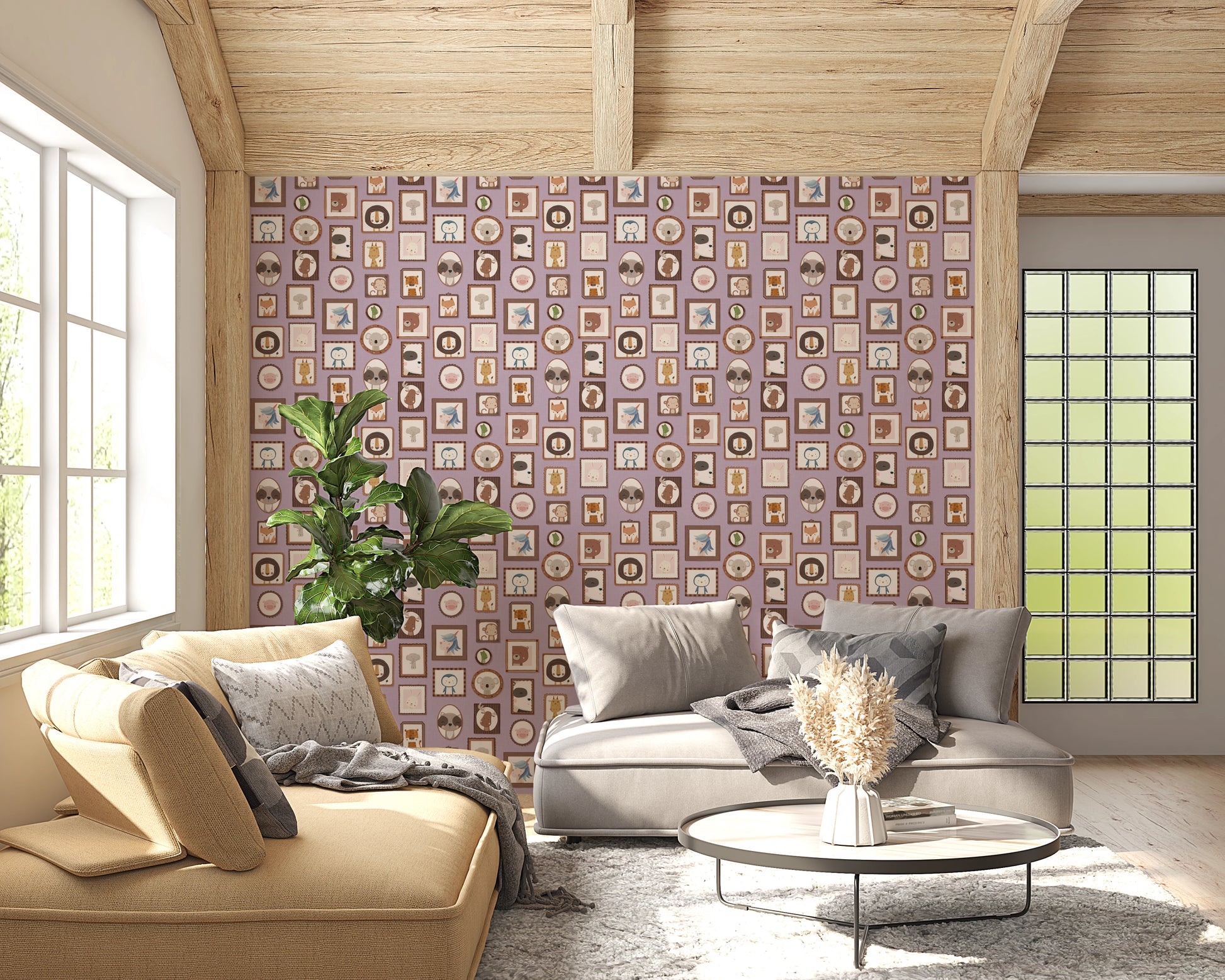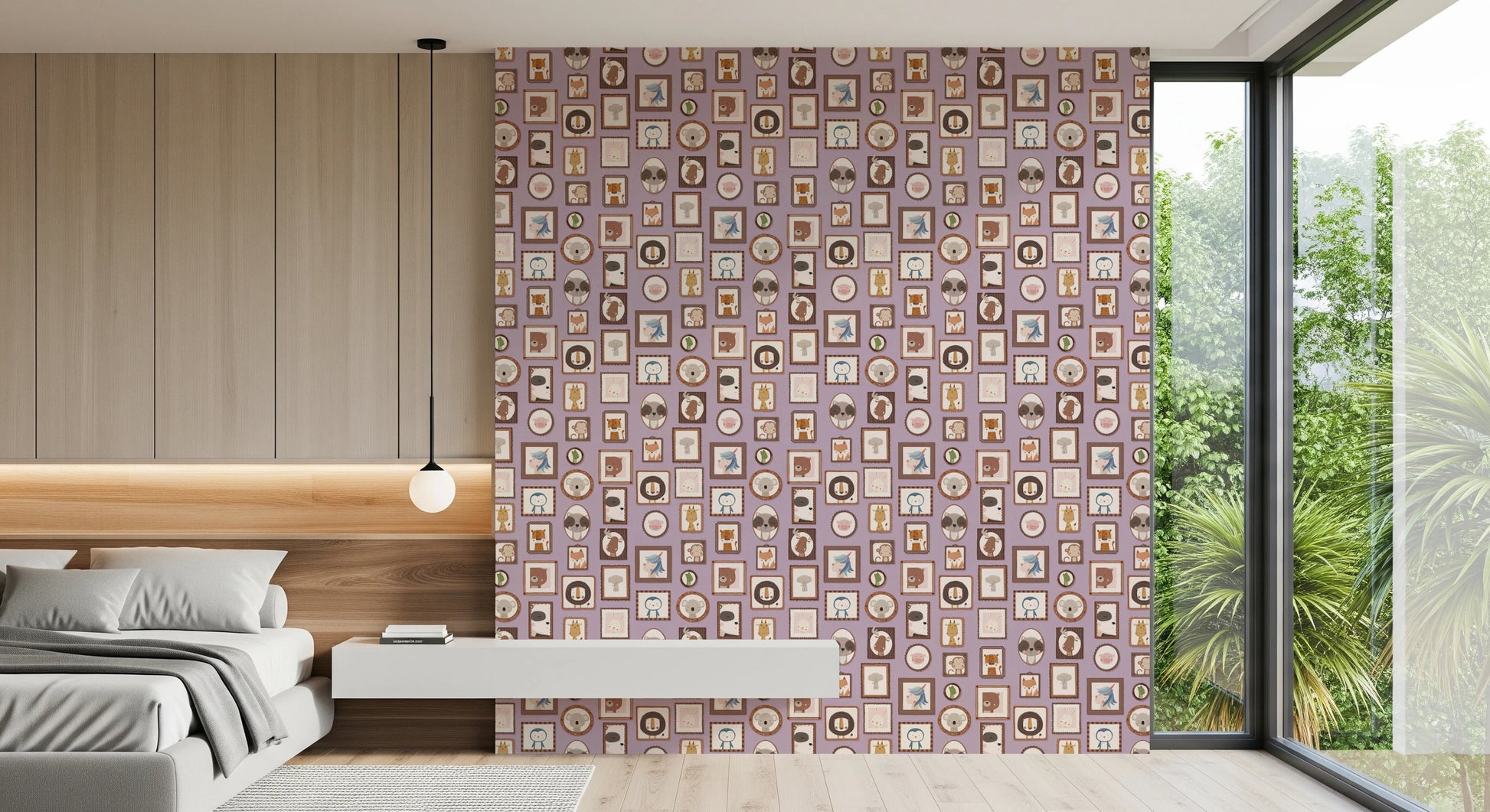 Transform your walls with this charming collection of framed animal portraits. The design showcases a variety of cute creatures, including lions, bears, penguins, and unicorns, each presented in a unique, decorative frame. The soft color palette of lilac, beige, and brown creates a calming and inviting atmosphere. This wallpaper for walls is ideal for kids' rooms, nurseries, or playrooms. It adds a touch of whimsy and sophistication while enhancing the overall décor with its adorable characters and delightful arrangement. Instantly create a cozy and playful space.