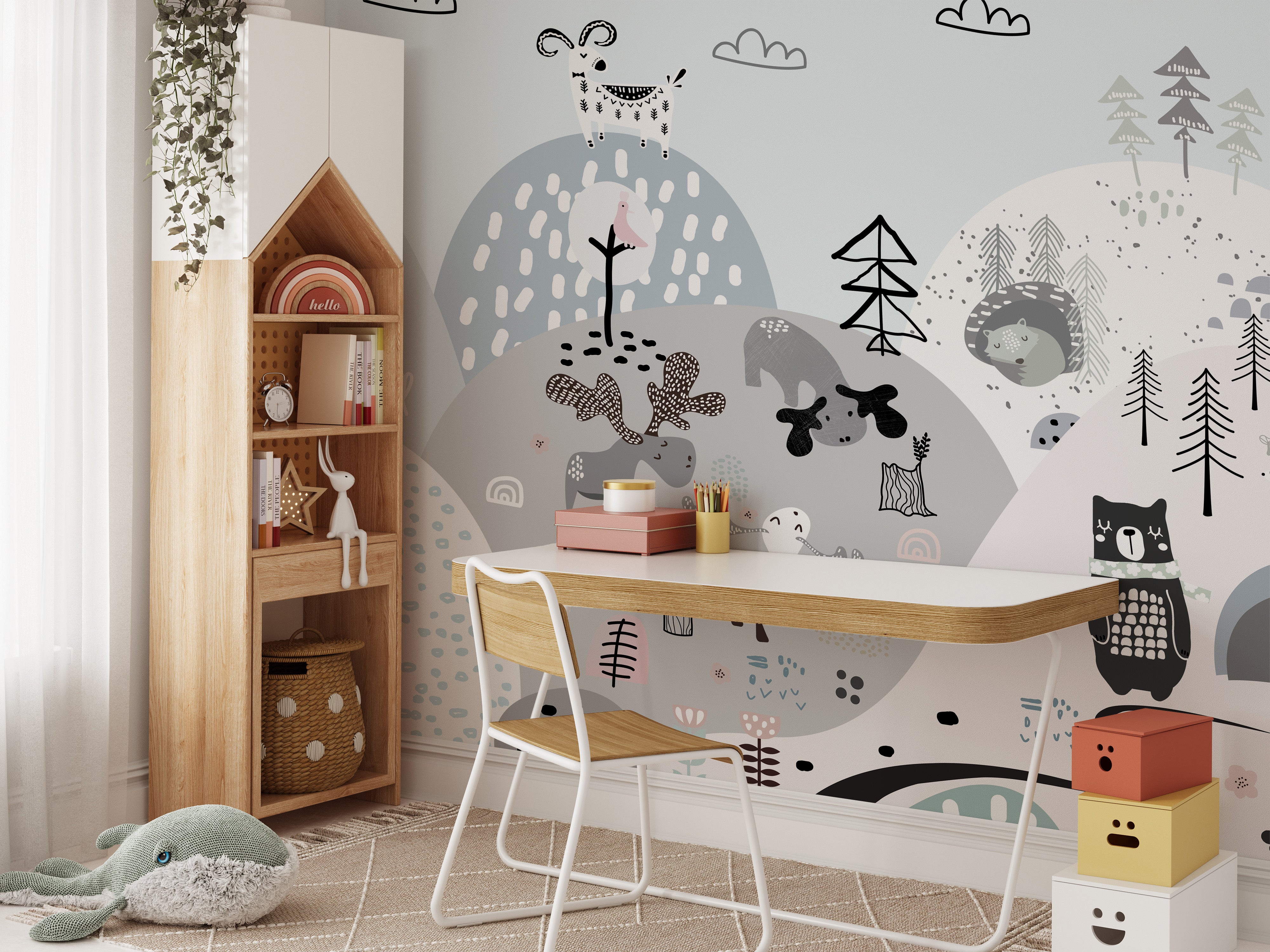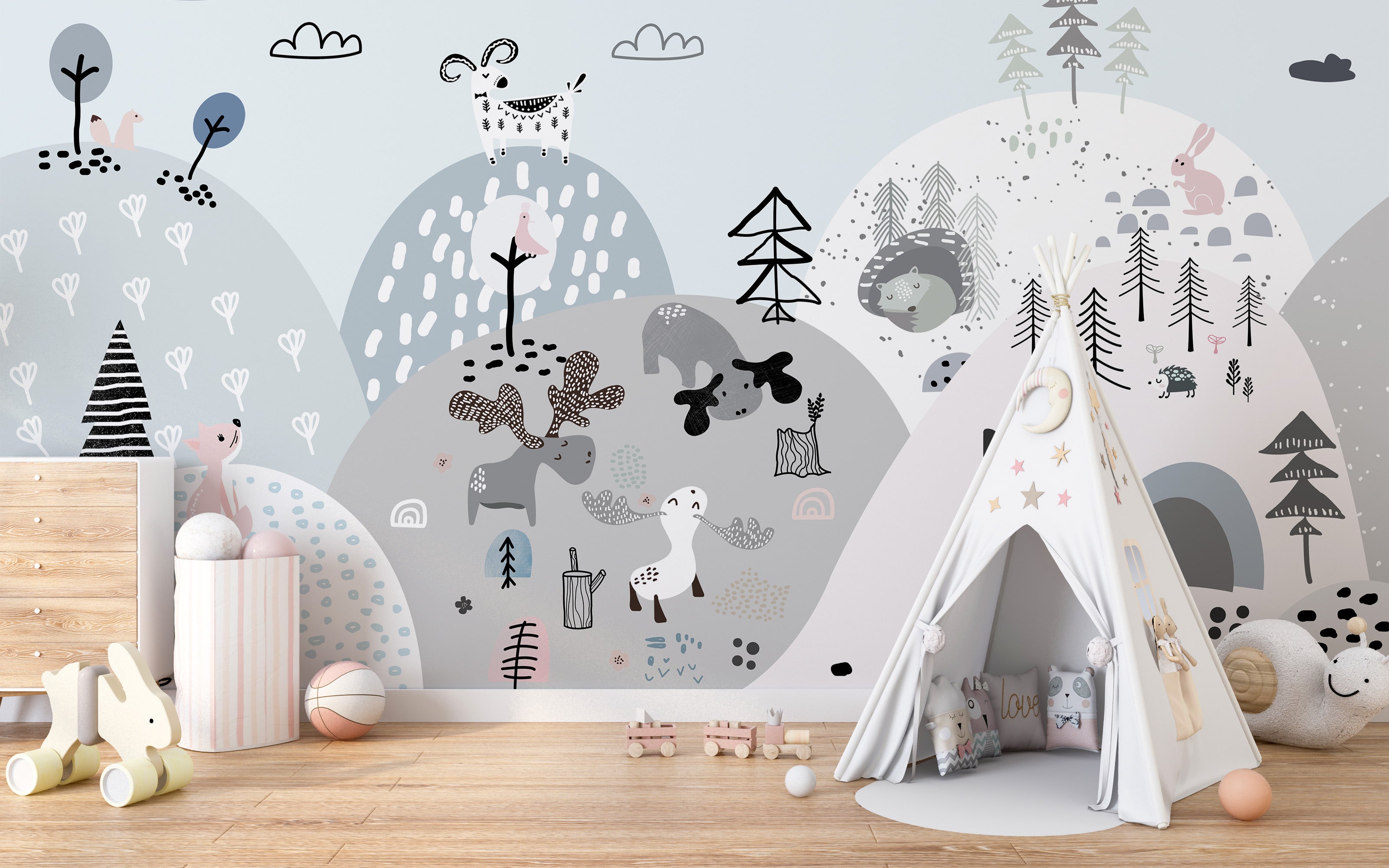 Playful woodland creatures on hills wallpaper mural.