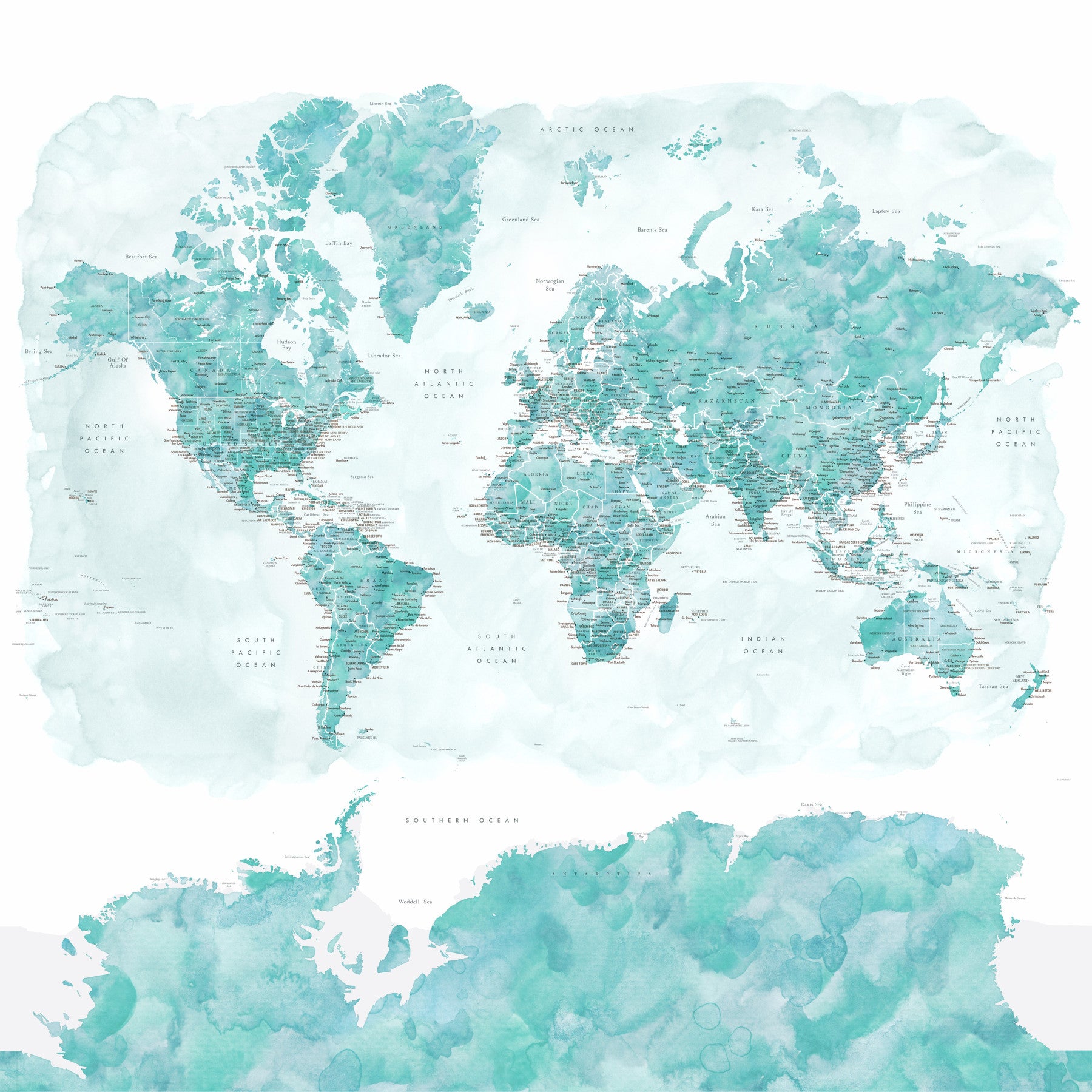 Vibrant aqua world map for travel-inspired rooms
