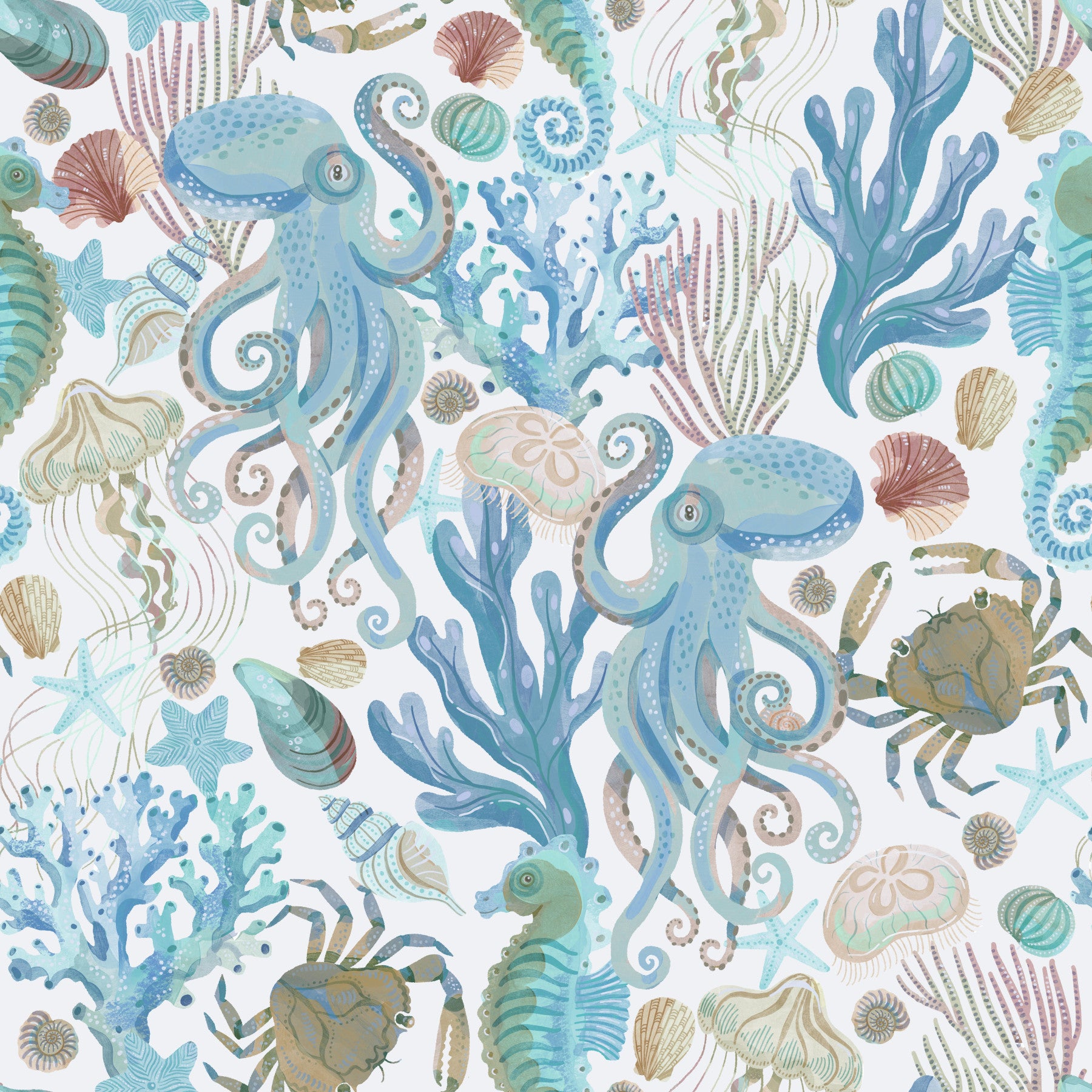 Dive into tranquility with this 'Aqua Coastal Cabin Sea Creatures' wallpaper. A serene palette of blues and greens showcases a whimsical underwater scene teeming with life. Elegant octopuses gracefully intertwine with delicate seahorses, playful crabs, and vibrant coral formations. Shells and starfish add a touch of coastal charm, creating a harmonious blend of ocean beauty and cozy cabin vibes. Perfect for adding a touch of seaside serenity to any digital device.