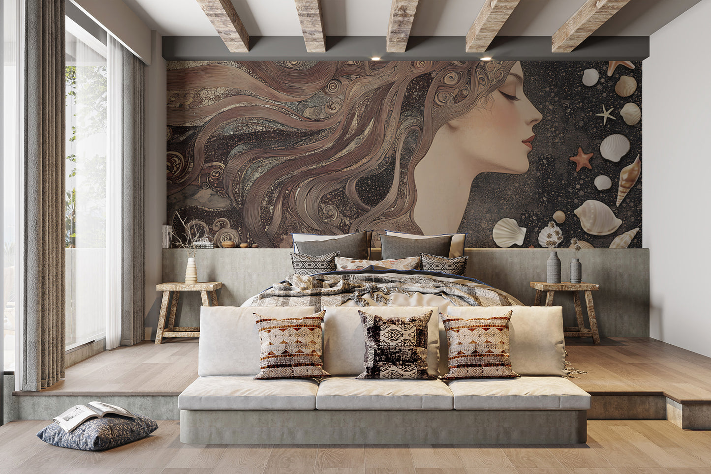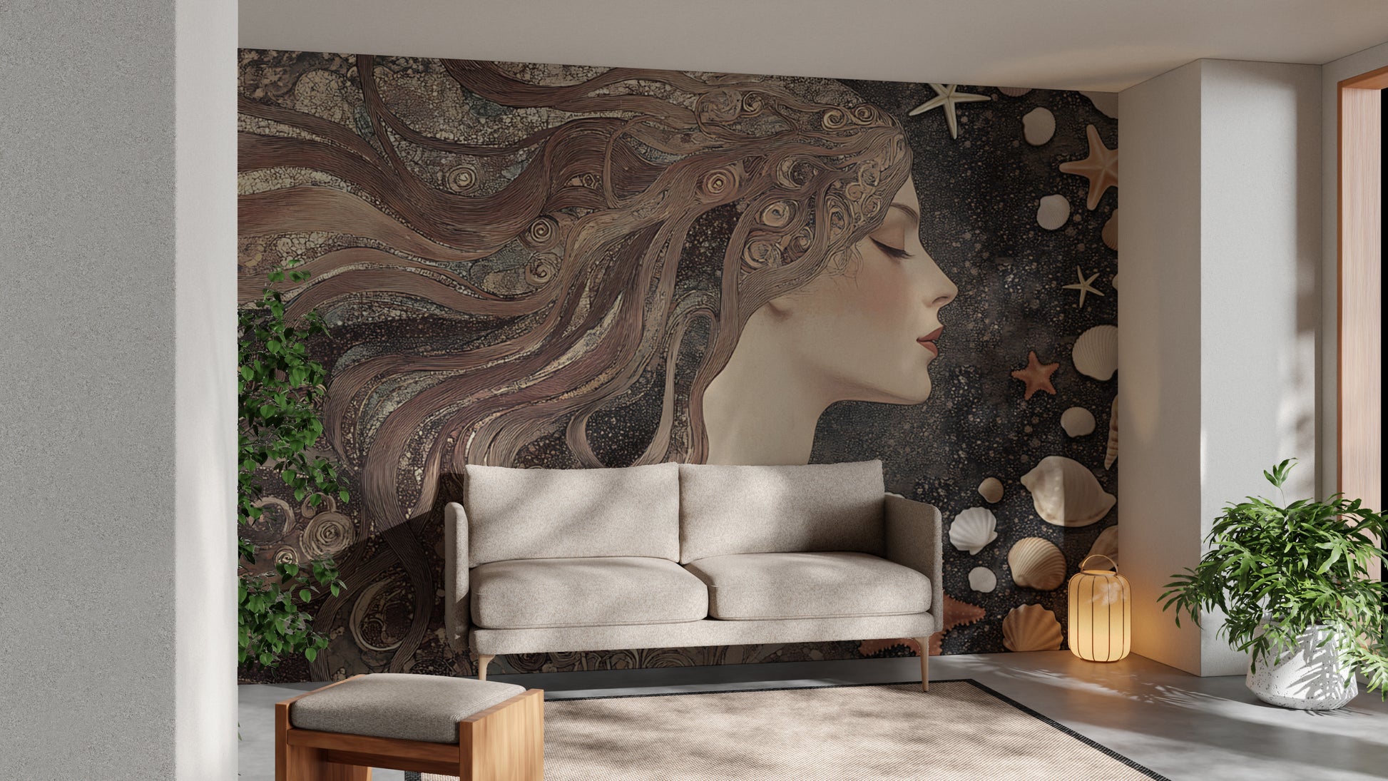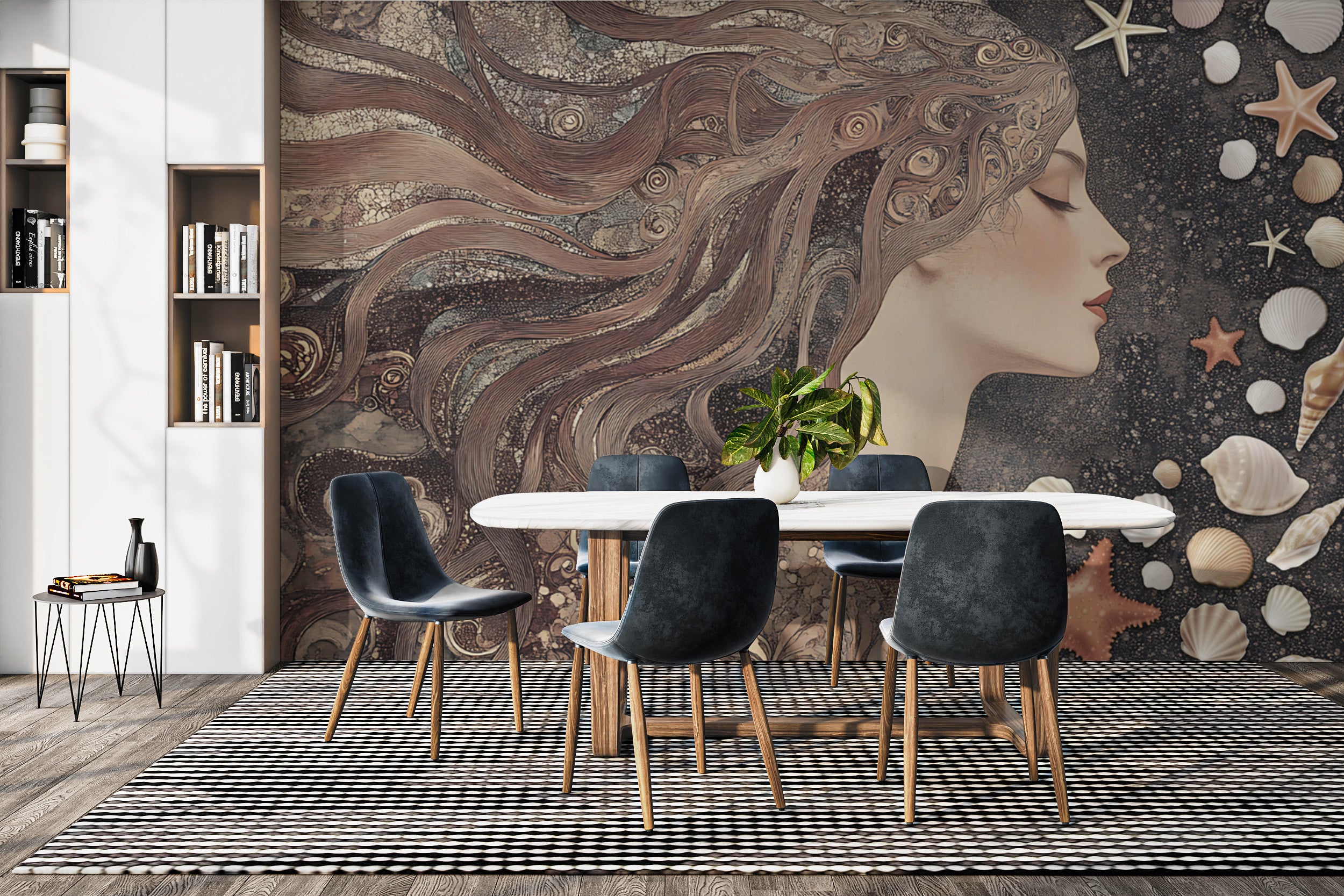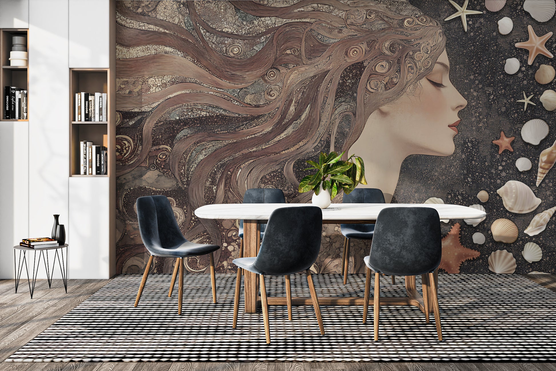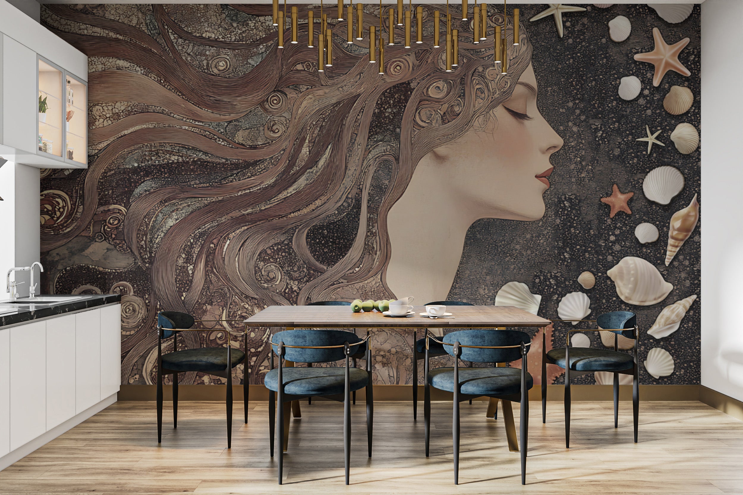 The Art Nouveau Sea Goddess Portrait captures ethereal beauty with flowing hair inspired by ocean waves. Intricate swirls blend seamlessly with seashells and starfish, creating a mesmerizing composition. The soft, earthy tones and delicate details bring an enchanting presence. The fantasy female portrait showcases an elegant fusion of ocean-themed artwork and surreal elements. The graceful expression and rich textures add a captivating touch. This piece highlights timeless sophistication, ideal for those who appreciate Art Nouveau painting with a mythical essence. The sea goddess art theme perfectly balances fluidity and intricate patterns, making it a stunning focal point.