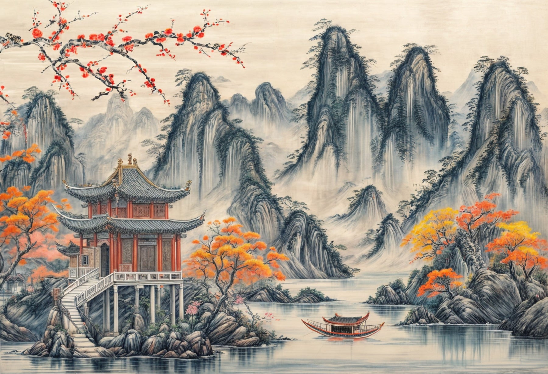 Transform your living spaces with this serene landscape featuring a traditional Asian building, misty mountains, and vibrant autumn foliage. The watercolor effect creates a calming, artistic ambiance. Its rich color palette brings warmth and sophistication to any room. This wallpaper for walls works beautifully in living rooms, dining rooms, bedrooms, and even hallways, adding a touch of tranquil elegance. The detailed brushstrokes and balanced composition enhance interiors, creating an inviting and harmonious atmosphere. Immerse yourself in this beautiful, calming vista that blends nature and architecture seamlessly.