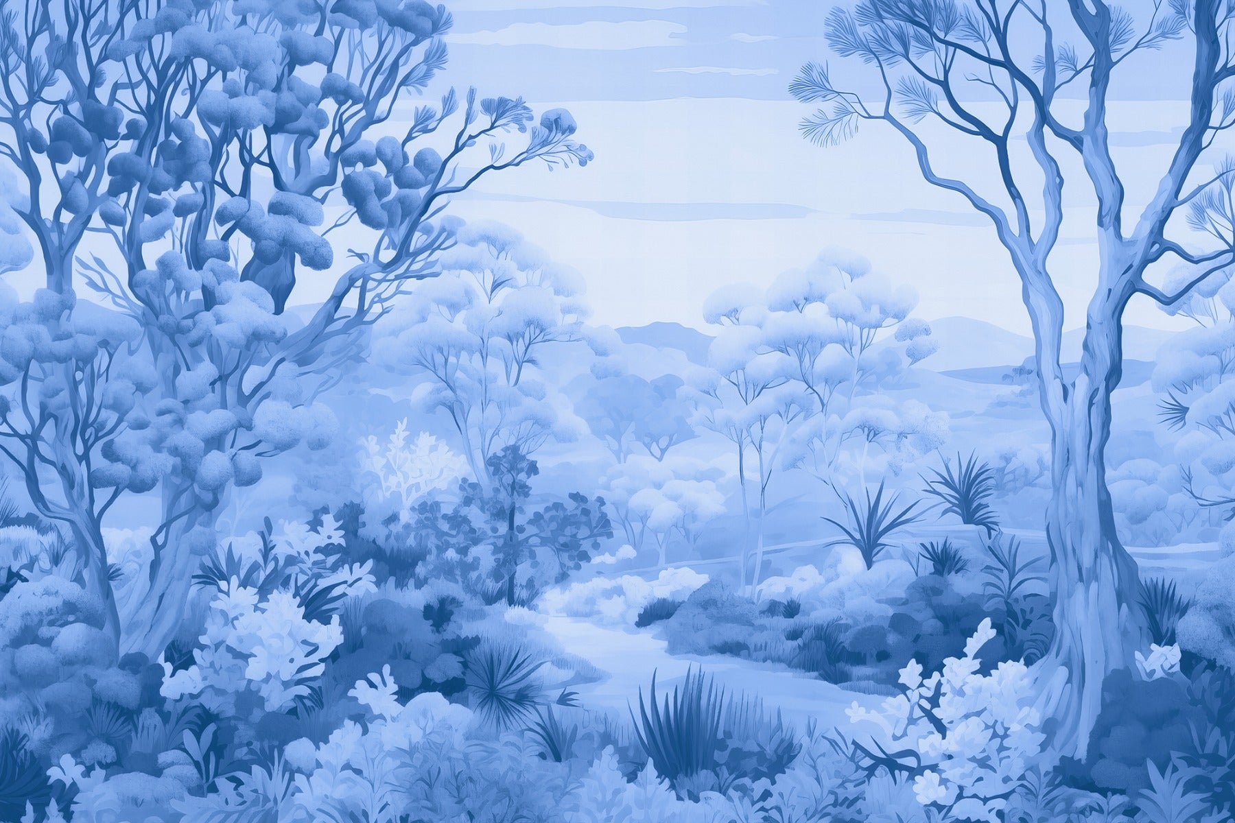 Elegant autumn forest blue color wallpaper mural for a calming atmosphere.