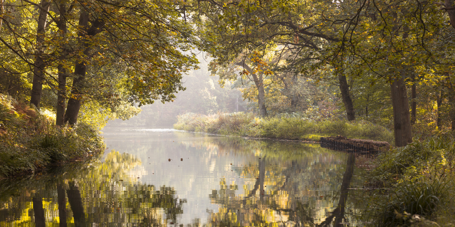 Basingstoke canal. Immerse yourself in the beauty of fall with this captivating river scene. The detailed reflection of trees and golden foliage presents a unique wallpaper for walls. Soft light creates a calming ambiance, perfect for bedrooms or reading nooks. The color palette of browns, greens, and gold complements rustic or modern interiors. This design offers depth and interest to any room, fostering a connection with nature's serene beauty.