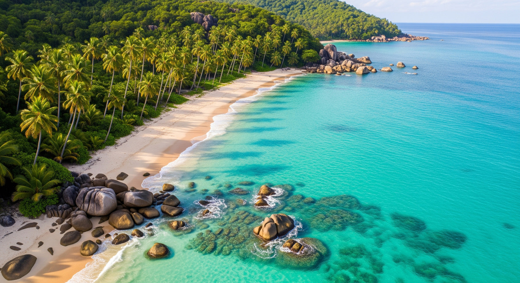 Bring the beauty of a sun-drenched coastline to your home with this radiant wallpaper for walls. The image captures a stunning beach scene with vibrant turquoise waters washing against a golden sandy shore. Towering palm trees cast shadows on the sand, creating a play of light and dark. The design evokes a sense of tranquility and adventure. Use this wallpaper in living rooms, dining rooms, or hallways to brighten spaces and add a touch of escapism. This stunning visual will transform interiors into an oasis of calm.