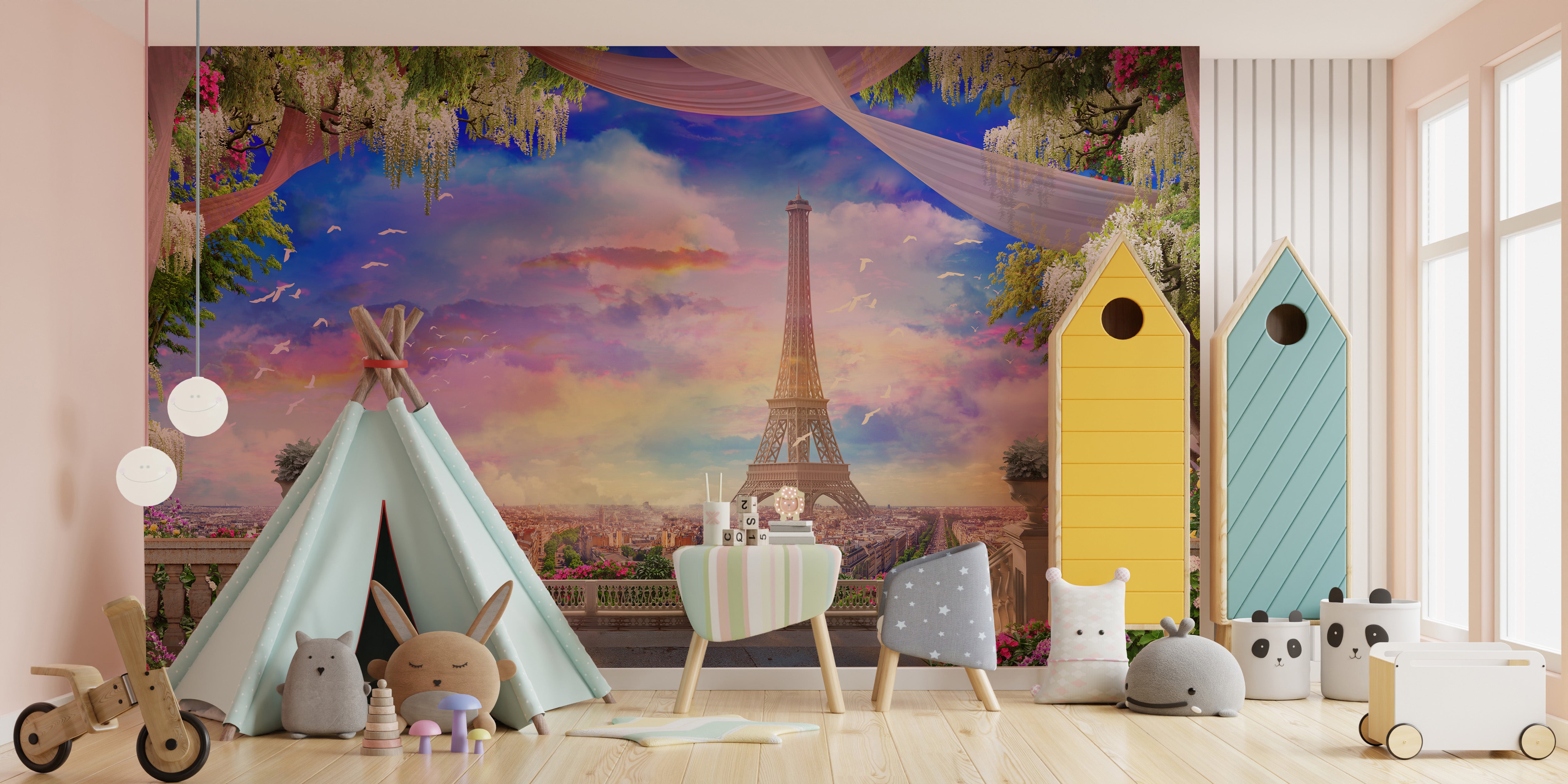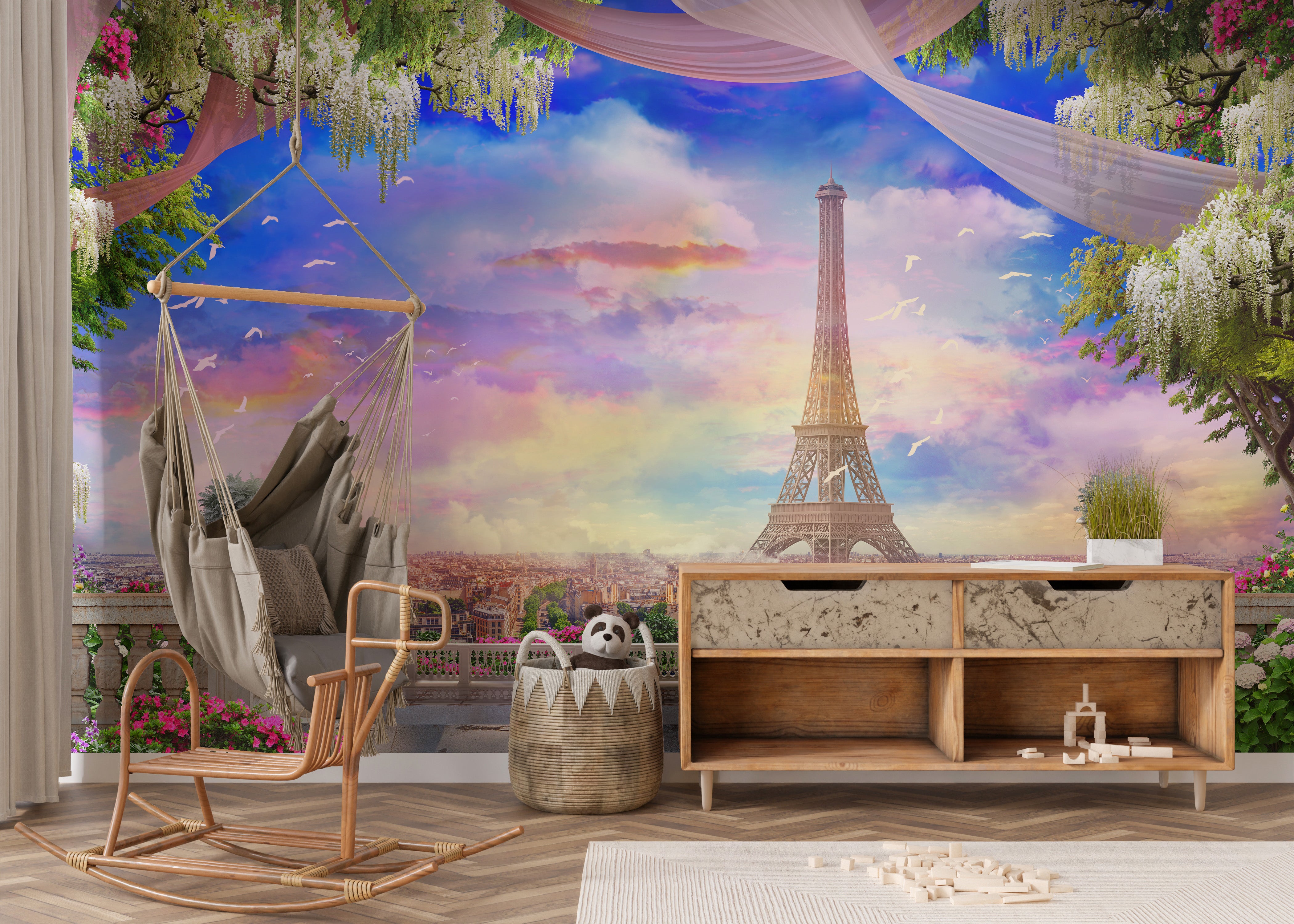 Experience the romance of Paris with our balcony Eiffel Tower pink sunset wallpaper mural. This enchanting design offers a picturesque view of the Eiffel Tower at sunset, as seen from a balcony draped with flowers. It's a dreamy addition to any room, bringing a touch of Parisian elegance and charm. Ideal for bedrooms, living areas, or any space that could benefit from a romantic ambiance, this wallpaper mural captivates homeowners, renters, and interior designers with its beauty and allure. The vibrant colors and detailed imagery provide an immersive experience, while the mural's easy application process makes it accessible for anyone looking to add a bit of Parisian flair to their decor.