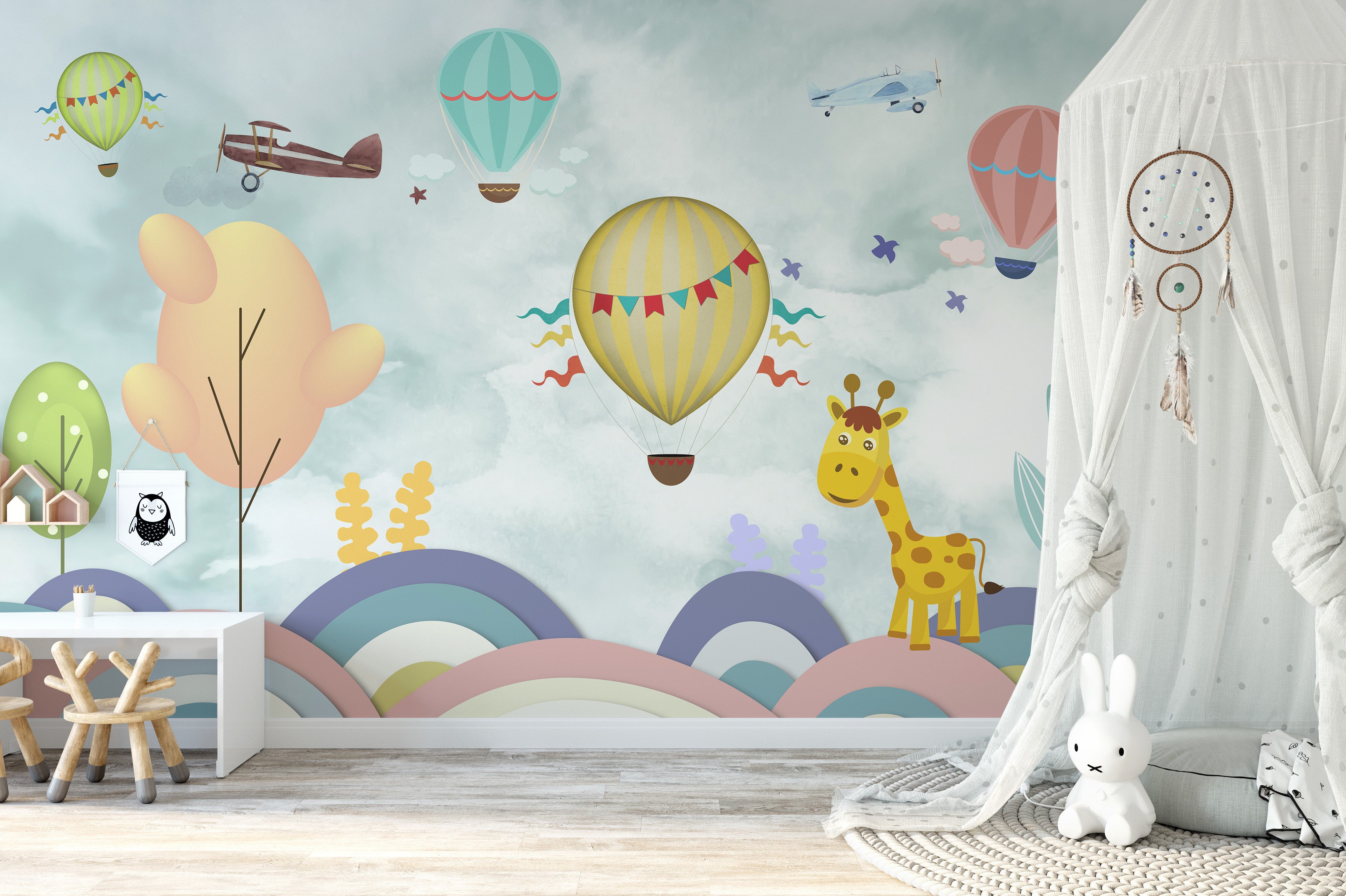Make your child's room a place where their imagination takes flight. Order our hot air balloon cartoon kids room wallpaper mural today and watch as their eyes light up with excitement. Turn their space into a haven of joy and inspiration with this charming and fun wallpaper. Buy now and embark on a colorful journey of creativity and joy!
