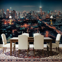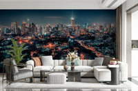 Transform your space with this captivating cityscape wallpaper for walls. The design showcases a sprawling metropolis at night, bathed in a vibrant array of orange and turquoise lights. Silhouetted buildings rise against the dark sky, creating a dynamic and urban feel. The deep colors and detailed architecture bring a sense of depth and sophistication. This wallpaper enhances interiors, making it perfect for a living room, office, or bedroom, adding a touch of modern elegance and urban charm.