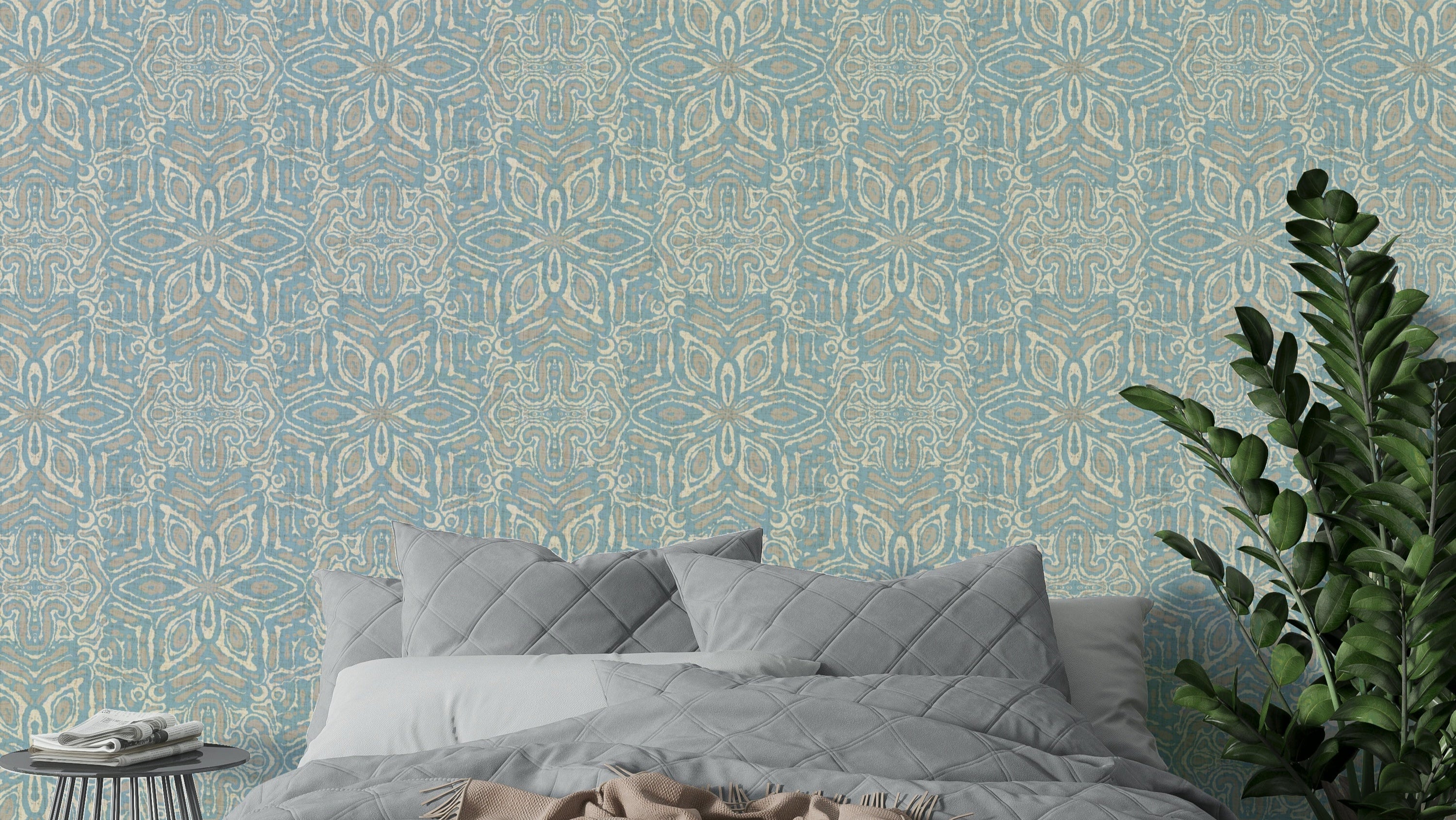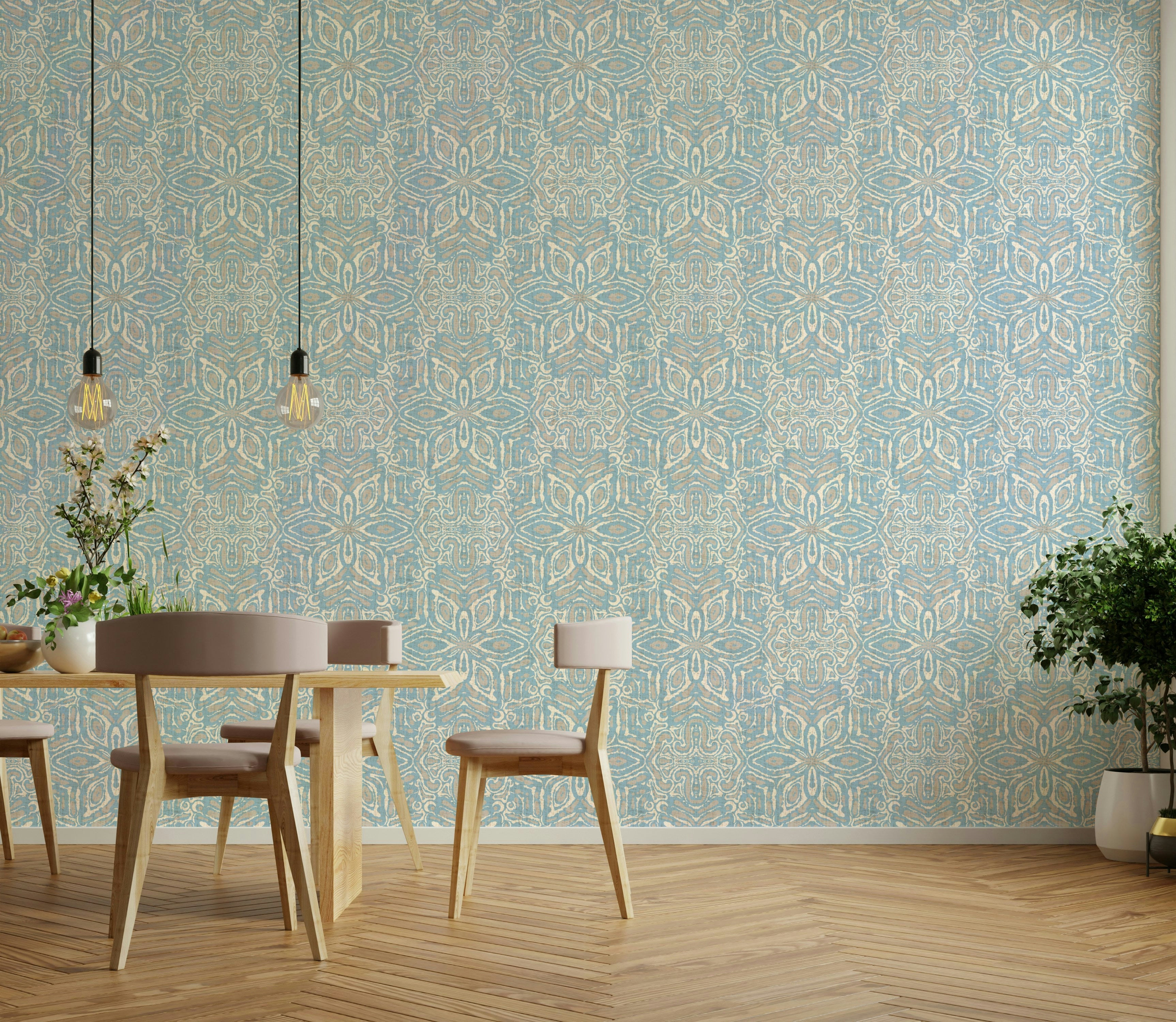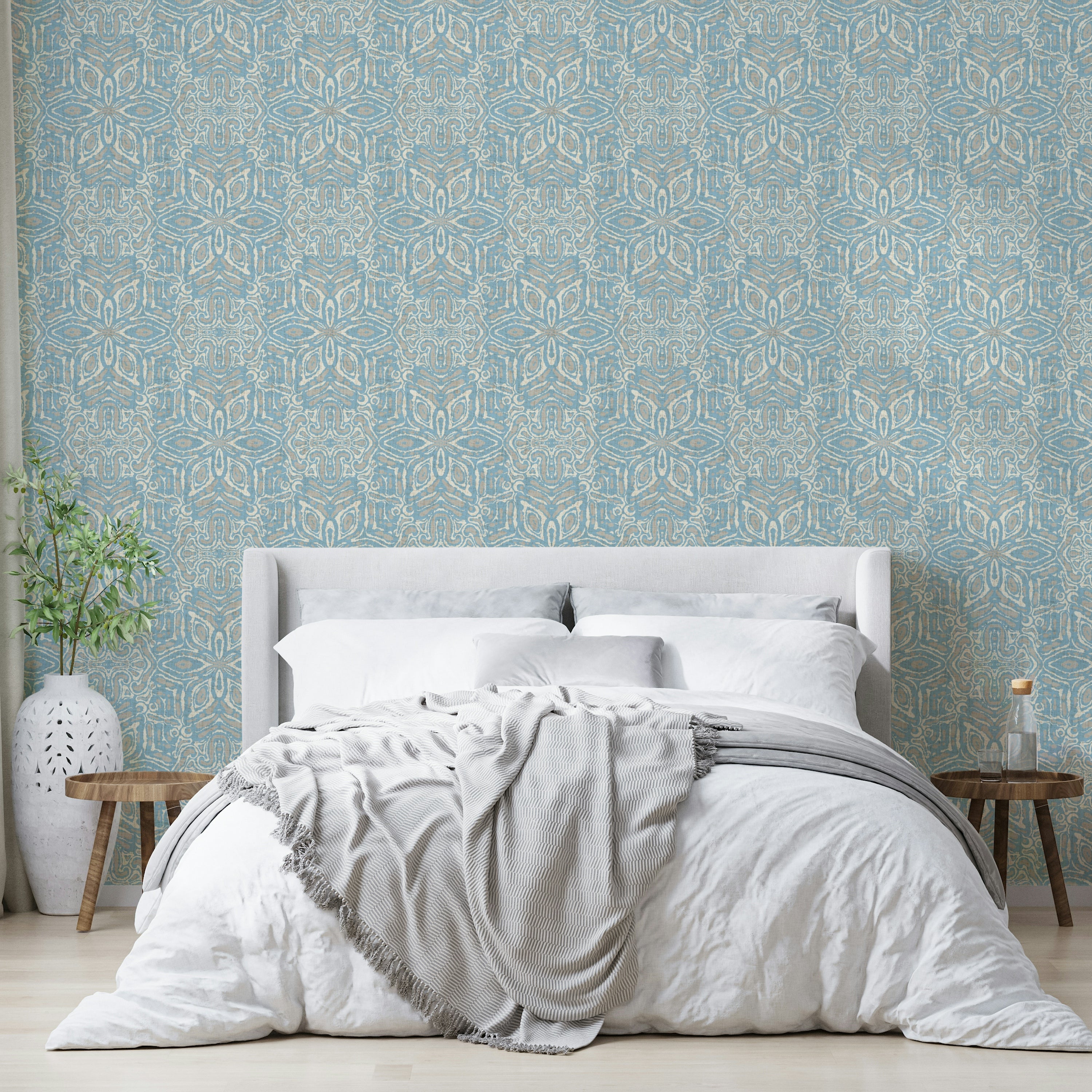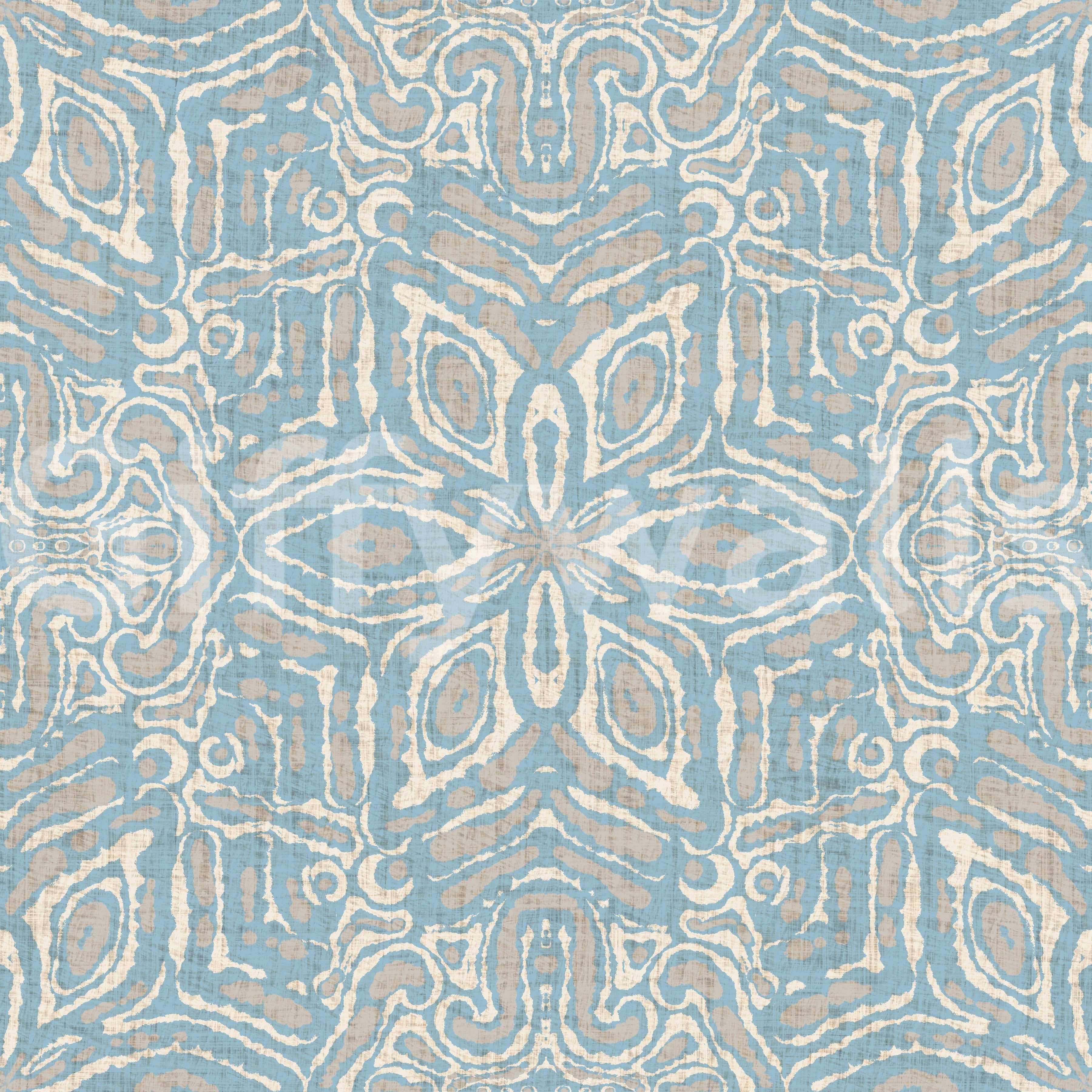 The design features a captivating interplay of muted blues, creams, and taupes, creating a calming and sophisticated aesthetic. Inspired by traditional batik techniques, the pattern showcases a geometric floral motif, with organically flowing lines and shapes forming a mesmerizing, symmetrical kaleidoscope. The subtle texture adds depth and visual interest, bringing a touch of artisanal charm to any l space.
