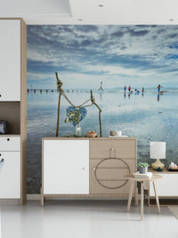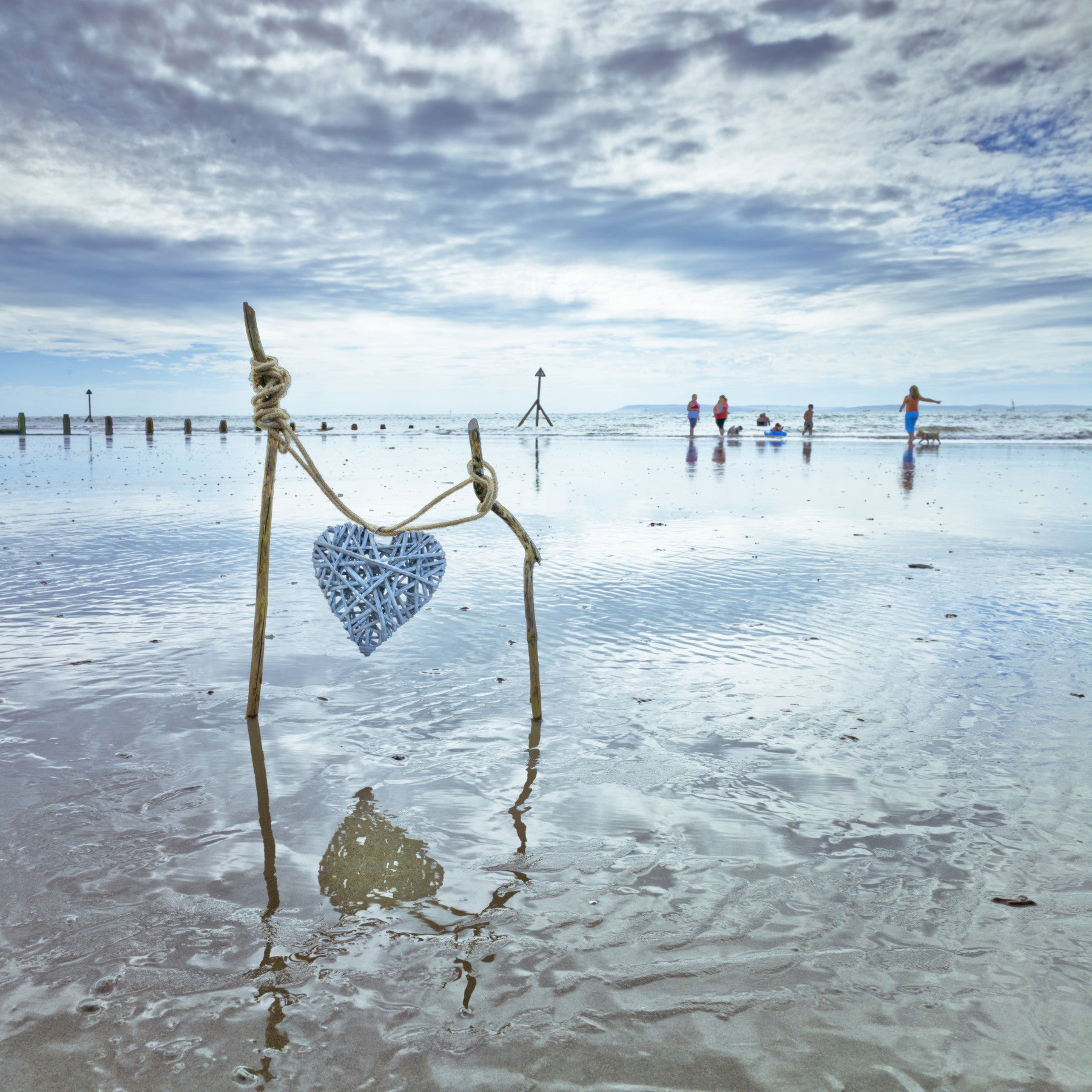 Heart tied up on wooden sticks at the beach. Immerse your space in the tender embrace of "Beach Love," a tranquil vista that captures the heart of coastal serenity. This image features a delicate woven heart, gently suspended between weathered driftwood posts, a poignant symbol of love grounded in nature's embrace. The receding tide creates a stunning mirror of the overcast sky, reflecting soft light and a sense of peaceful contemplation. Further along the shore, figures stroll and play in the distance, adding a subtle touch of life and warmth to the expansive scene. This artwork invokes a feeling of calm and contentment, making it a perfect addition to any room, bringing the gentle rhythm of the sea and the warmth of shared moments into your personal haven. Let this scene whisper of seaside memories and the quiet joys of connection, transforming your walls into a canvas of coastal charm.