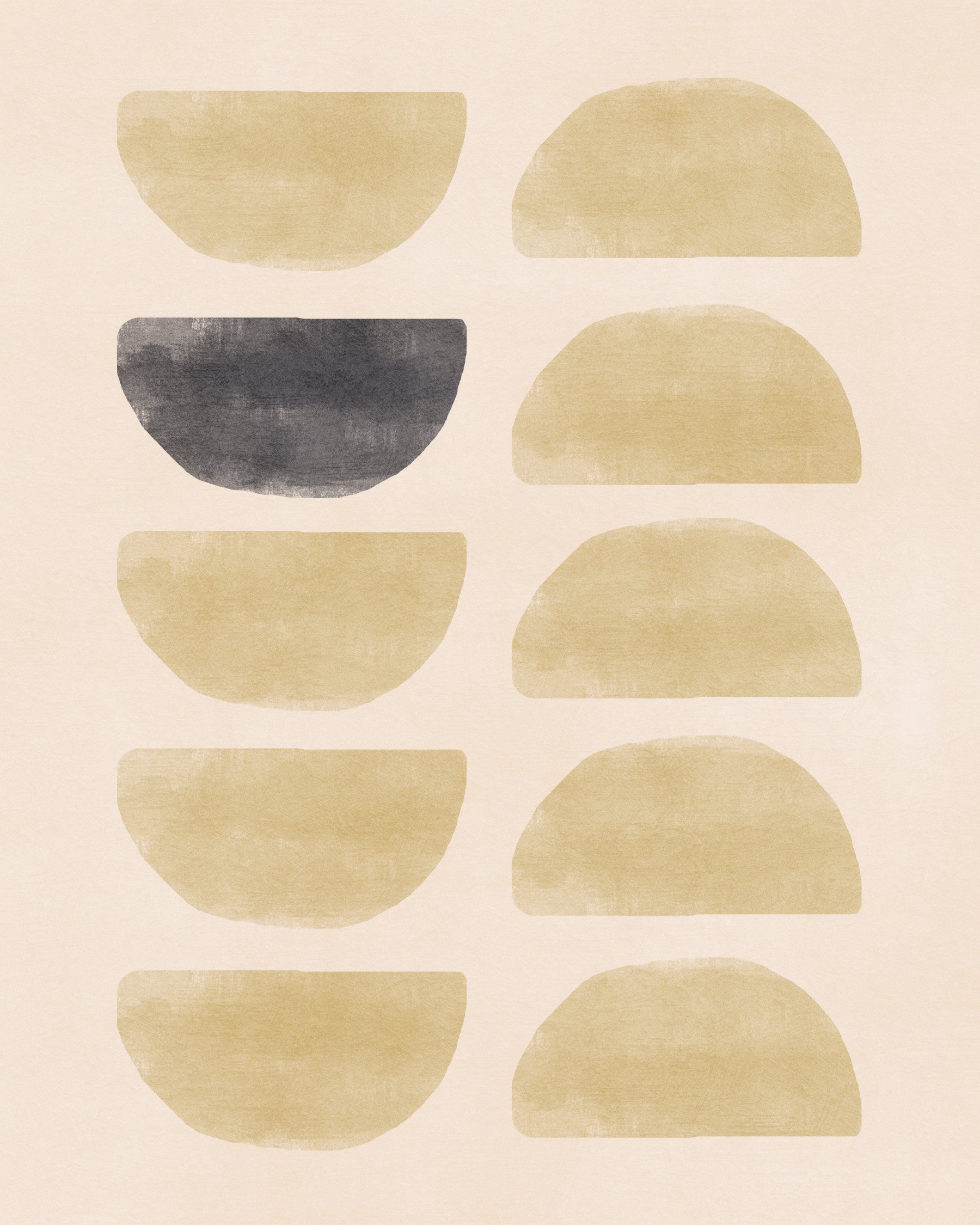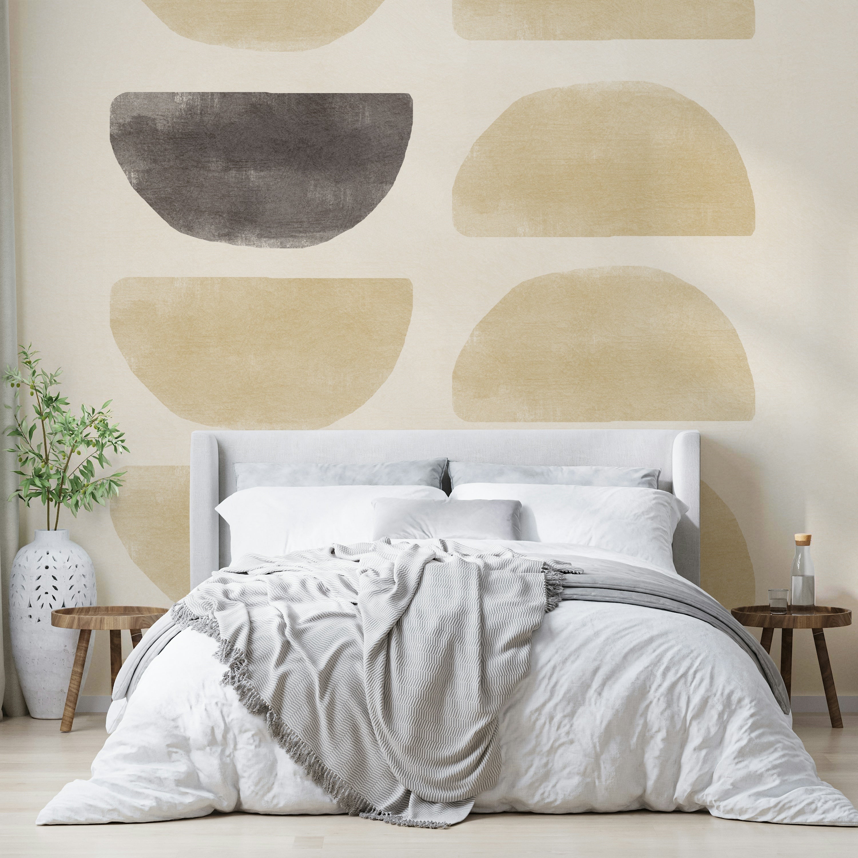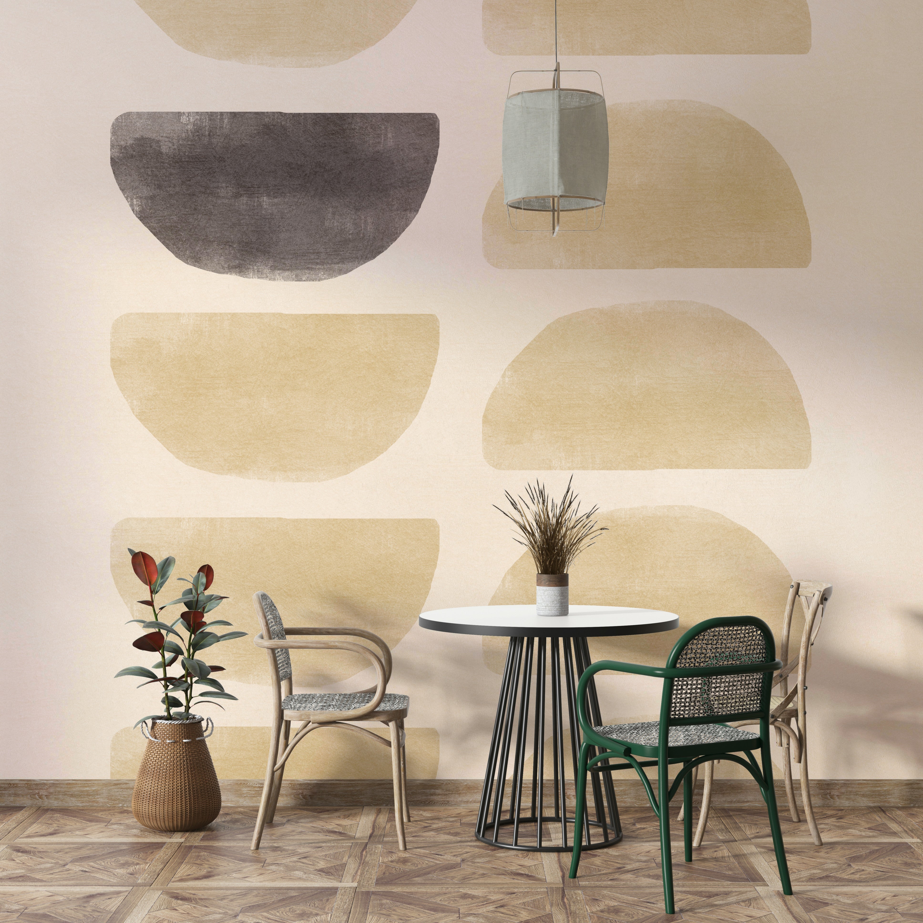 This wallpaper design showcases a captivating arrangement of semi-circular shapes in varying shades of beige and a muted grey. The subtle color palette creates a tranquil and calming atmosphere, perfect for modern and minimalist interiors. The organic, hand-painted aesthetic adds a touch of warmth and sophistication, making it ideal for bedrooms, living rooms, or any space where a serene and stylish backdrop is desired. The simplistic yet elegant design ensures it seamlessly complements various décor styles, from contemporary to bohemian.