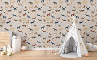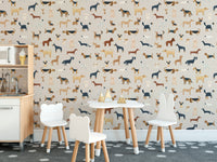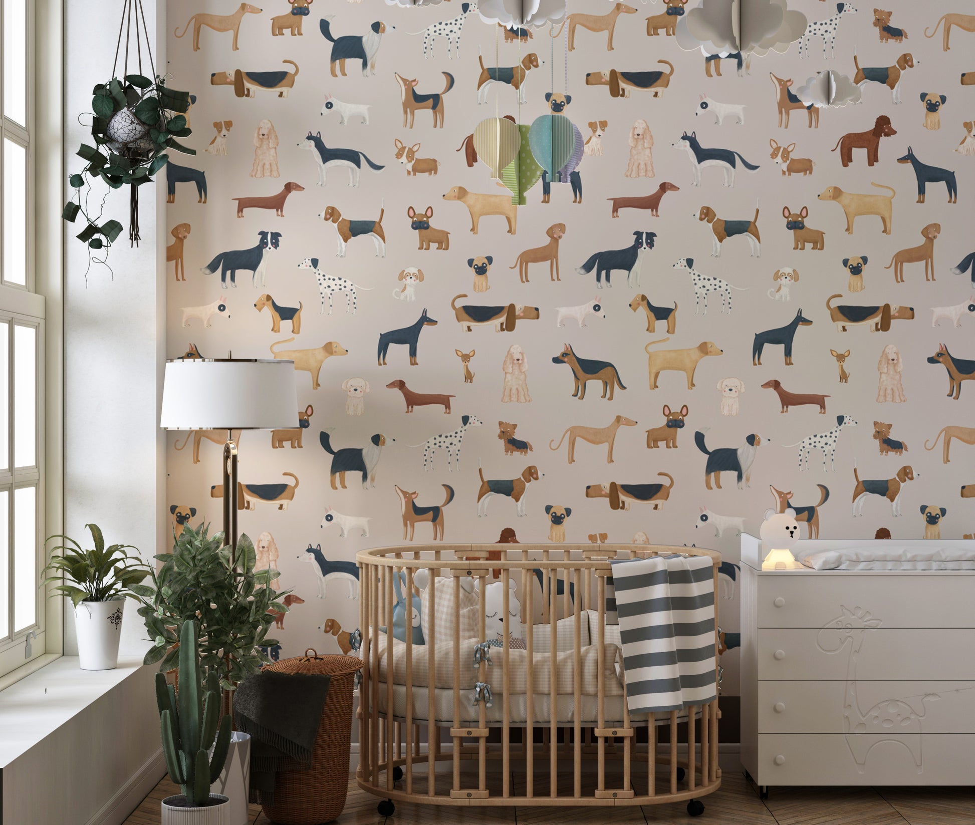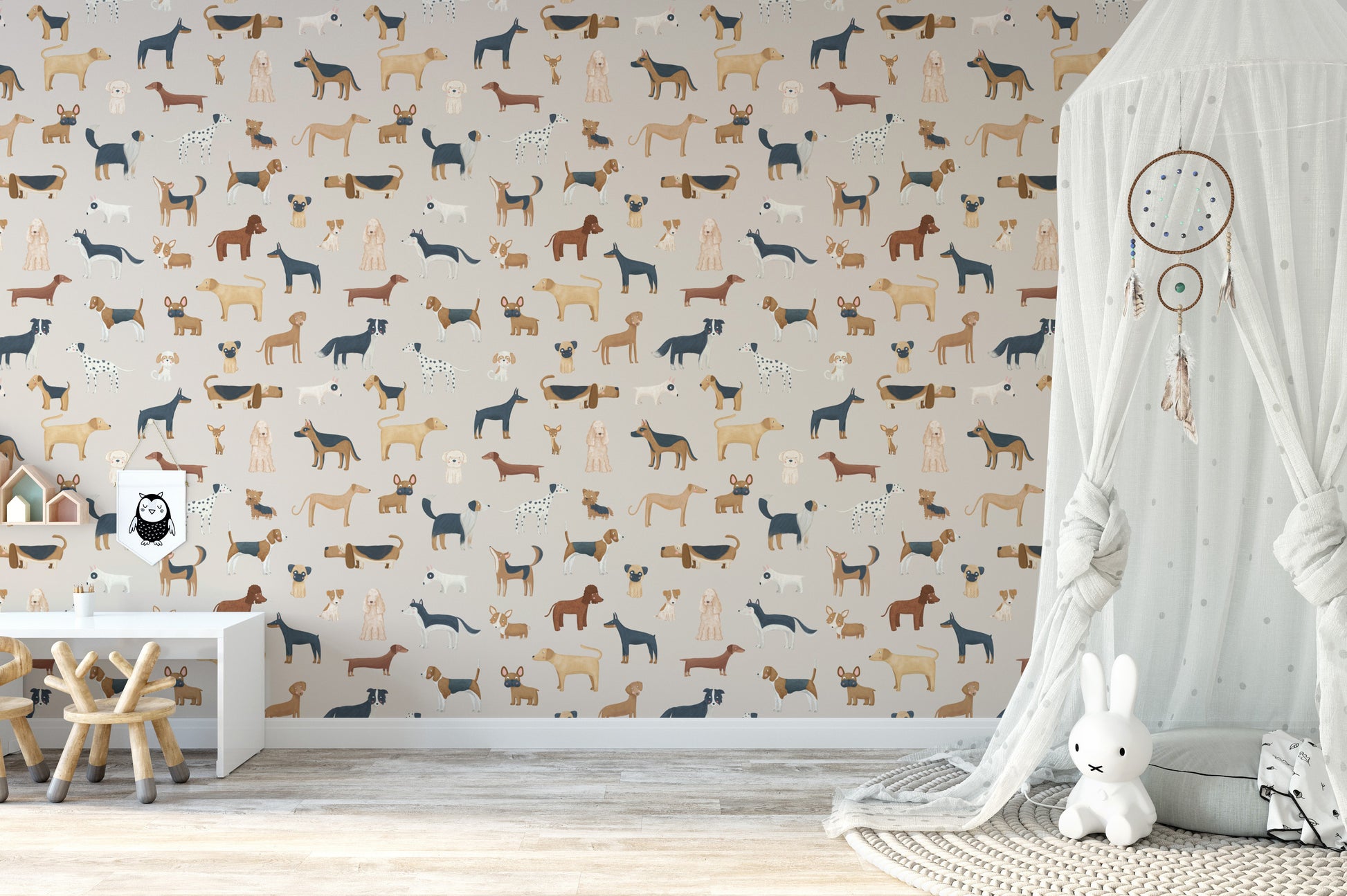 Elevate your child's bedroom or play area with the beige canine parade cute dogs wallpaper mural. This delightful wallpaper is a celebration of man's best friend, showcasing a variety of playful dog illustrations set against a warm beige backdrop. It's not just visually appealing but also sparks imagination and joy, making it an ideal choice for kids room wallpaper. Crafted with durability in mind, it withstands the energetic lifestyle of little ones. Easy to apply, this mural turns any room into a fun, canine-filled wonderland, perfect for the young and the young at heart.