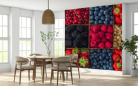 Variety of Berries on wooden box. Elevate your dining area or kitchen with this charming wallpaper for walls showcasing an array of fresh, vibrant berries. The design features strawberries, blueberries, raspberries, blackberries, and currants, neatly arranged in a wooden crate. This visually appealing wallpaper brings a touch of rustic charm and summer freshness into your space. The rich colors of the berries against the warm wood tones create a cozy and inviting atmosphere, ideal for breakfast nooks, pantries, or even a cheerful child's room. This wallpaper adds visual texture and interest, making it a delightful focal point that easily complements both modern and traditional decors.