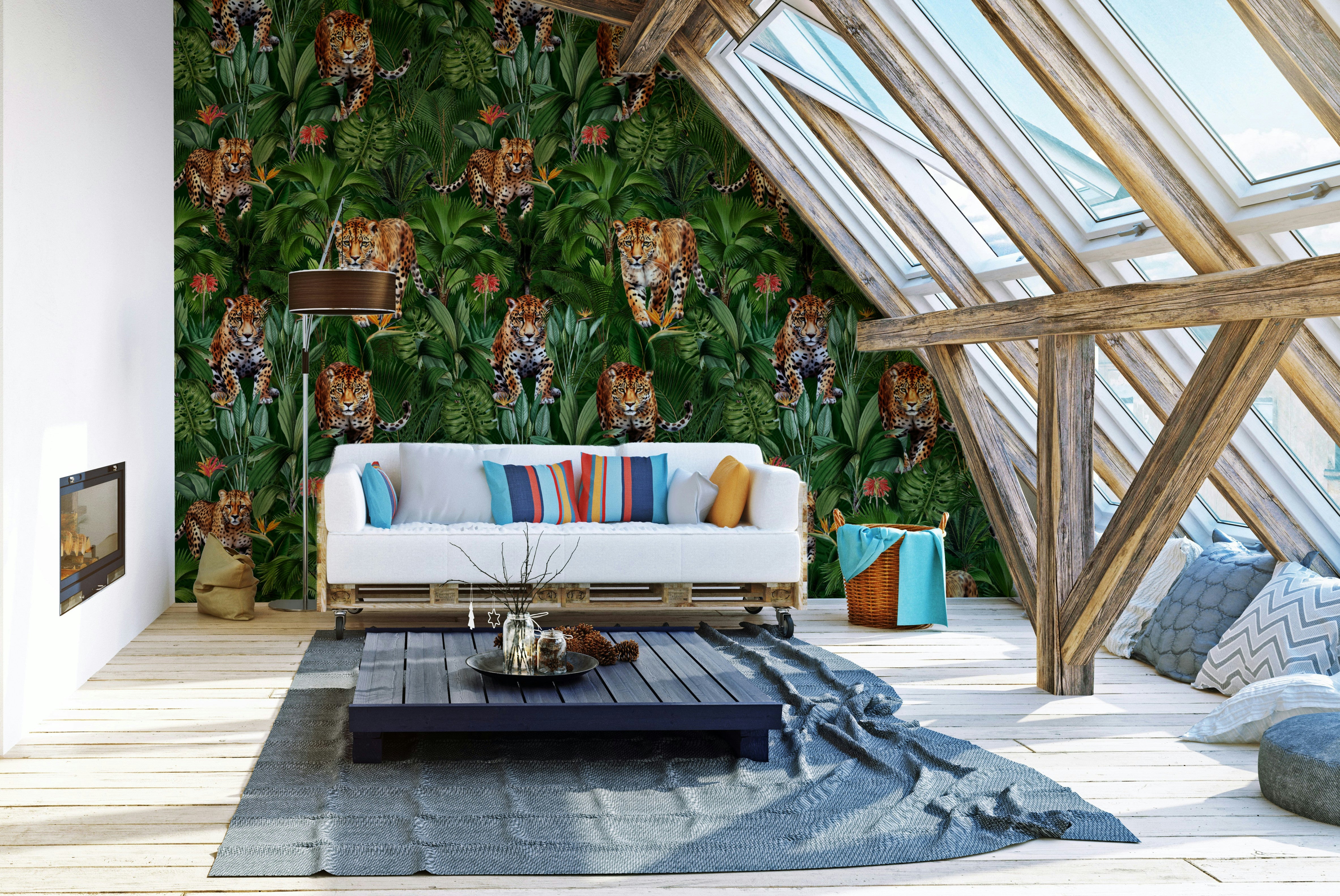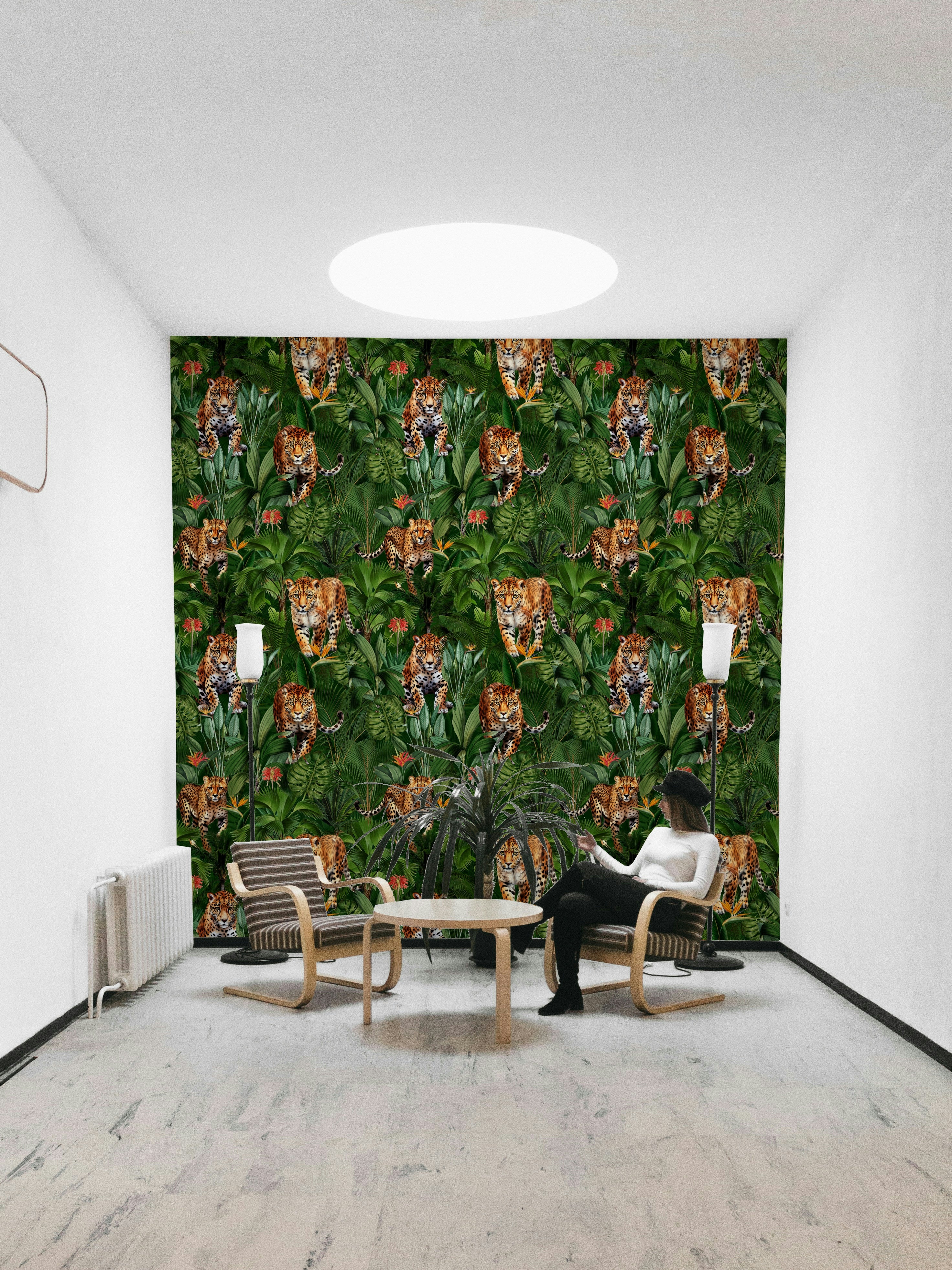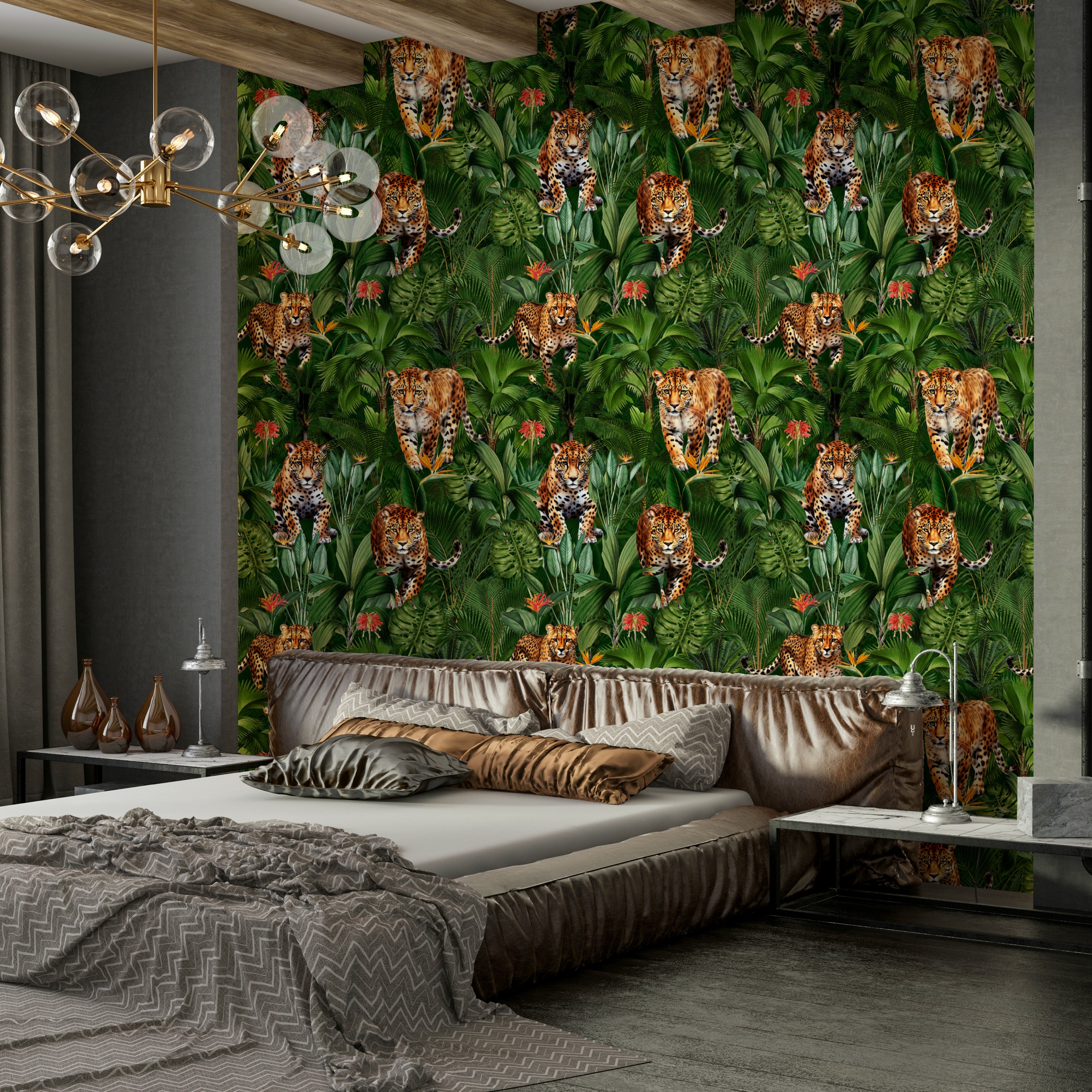 Bold, jungle-themed wallpaper with tigers, lions, and leopards