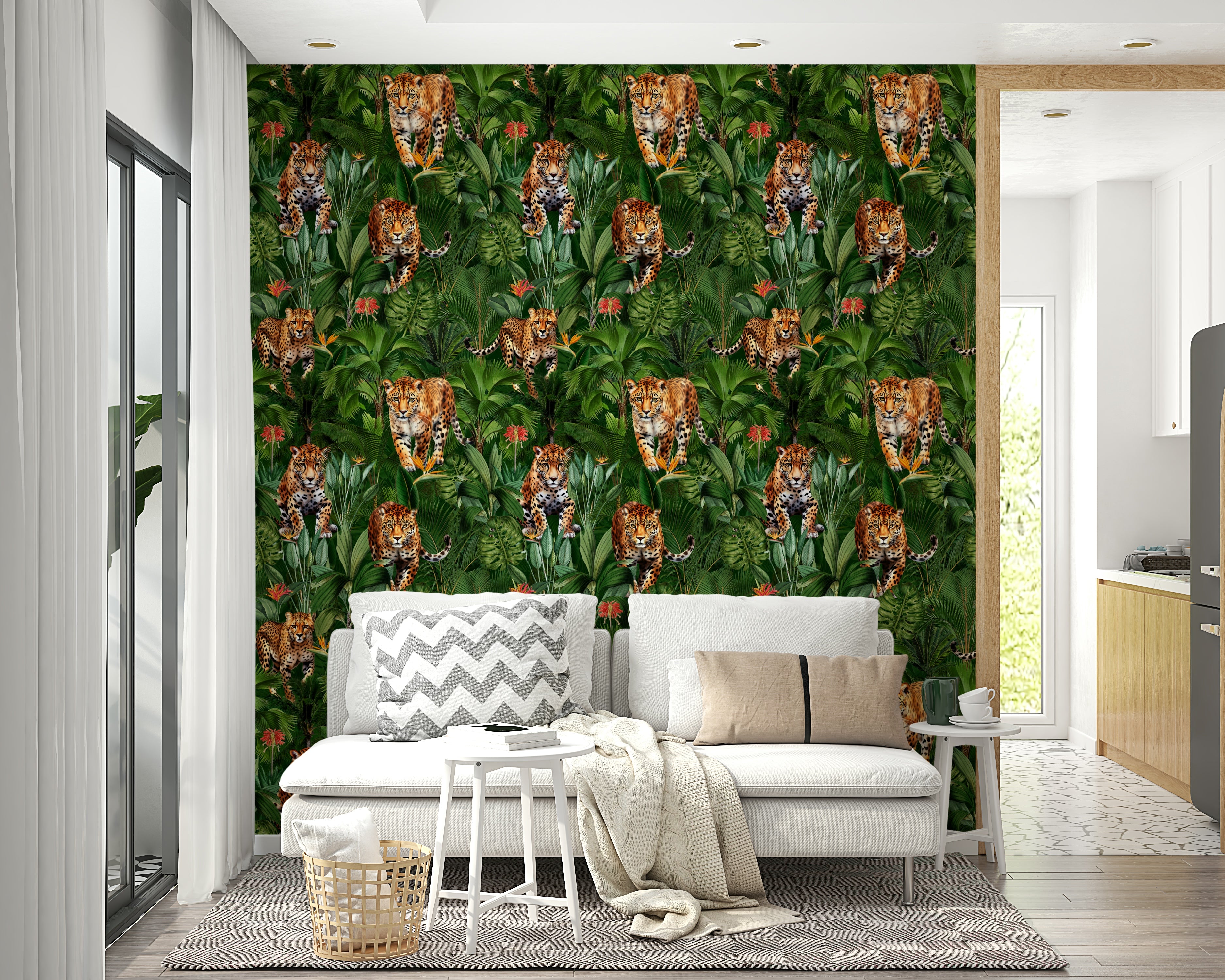 Animal-themed wallpaper with big cats and lush jungle foliage