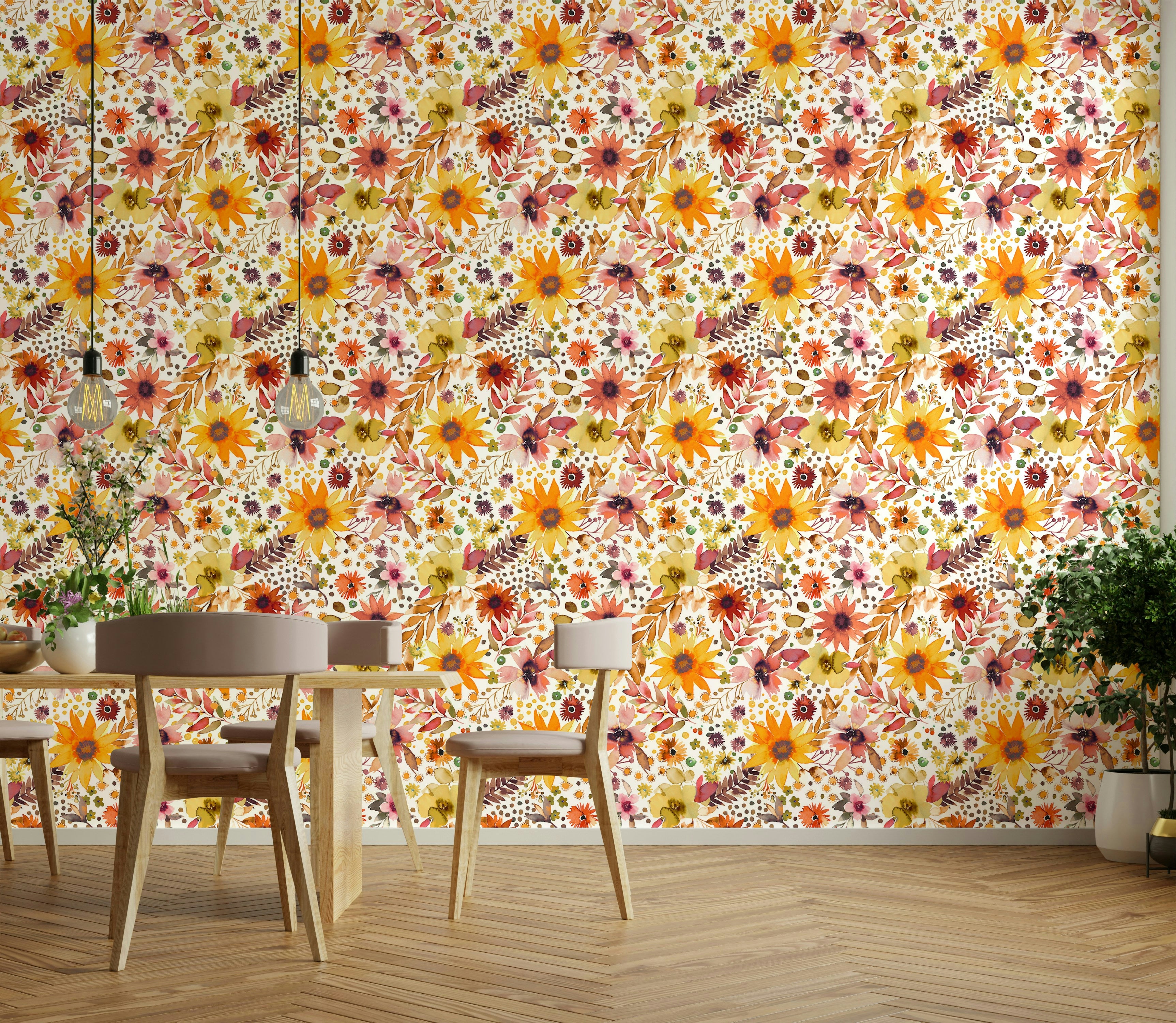 Embrace the warmth and vibrancy of autumn with this stunning wallpaper. 'Big Sunflowers Floral Gold' showcases a breathtaking watercolor design featuring large, bold sunflowers in rich golden hues, interspersed with a medley of smaller blossoms in earthy reds, oranges, and yellows. Delicate leaves and abstract gold accents complete the composition, creating a harmonious and sophisticated aesthetic. The design evokes a feeling of sunny optimism and rustic charm, perfect for adding a touch of nature's beauty to any digital device. The soft watercolor effect provides a calming and elegant atmosphere, ideal for a serene and stylish workspace or home screen.