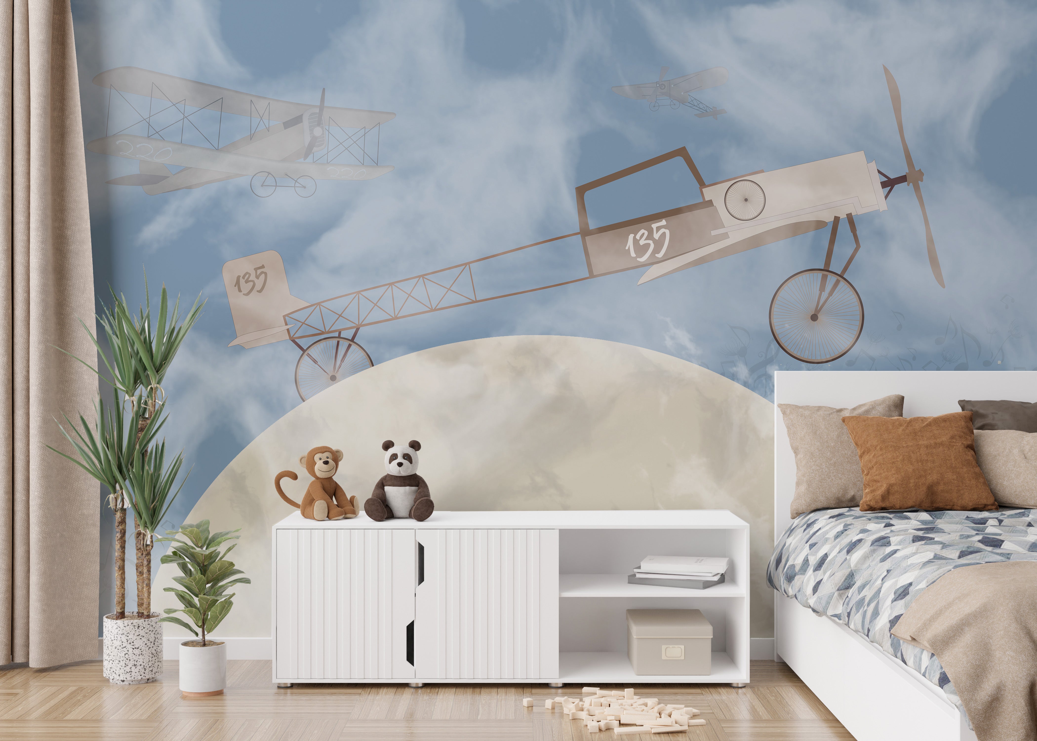 Elevate your child's bedroom to cosmic wonder with our enchanting Planes on the Moon wallpaper murals. Imagine the delight as they gaze upon real biplane planes, masterfully illustrated, soaring across a moonlit sky. Each mural captures the thrill of adventure against a backdrop of a detailed lunar landscape, bringing dreams of spaceflight and exploration right to their walls.