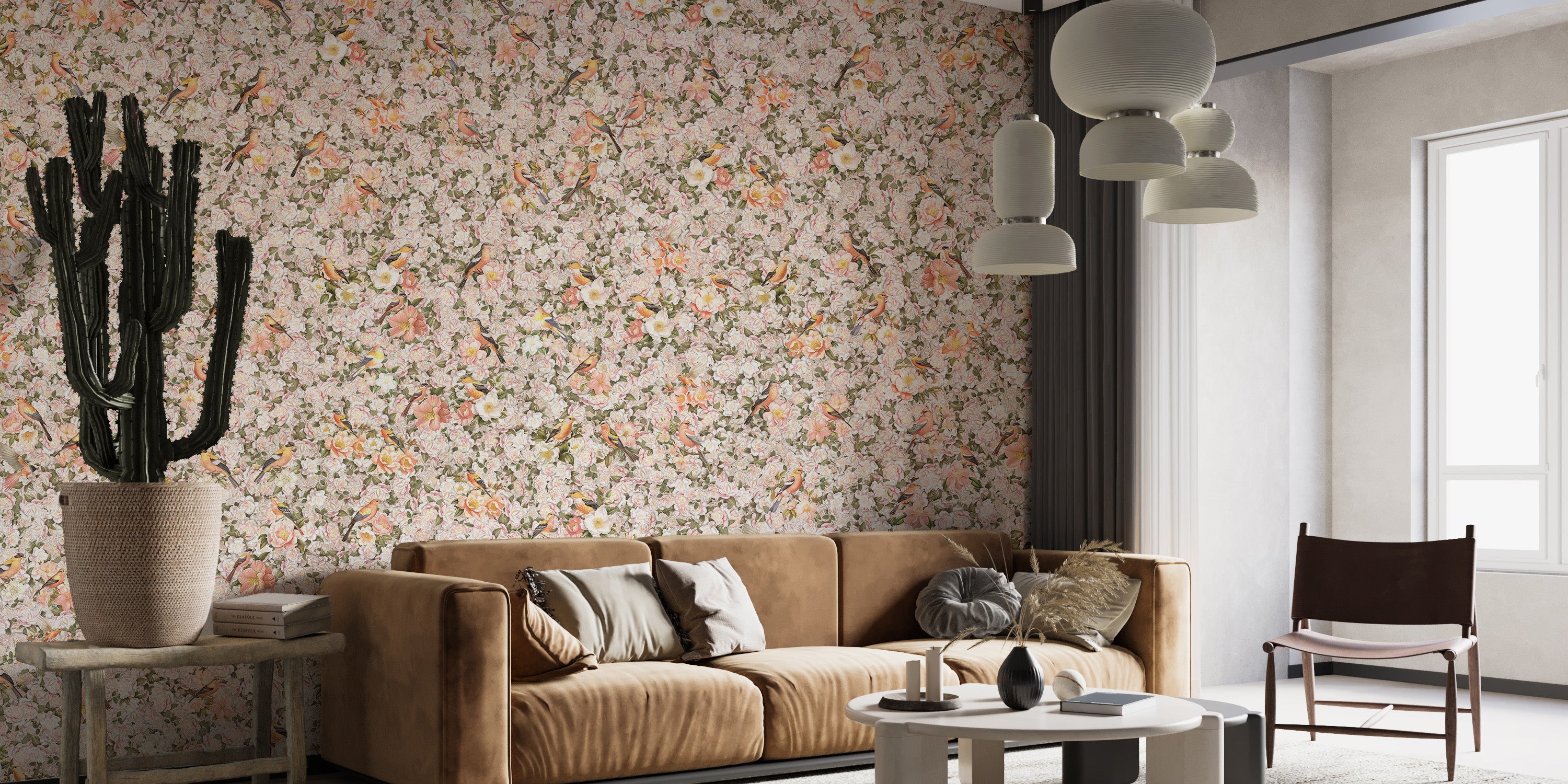 Birds and Florals Orange Color Wallpaper Mural - Giffywalls