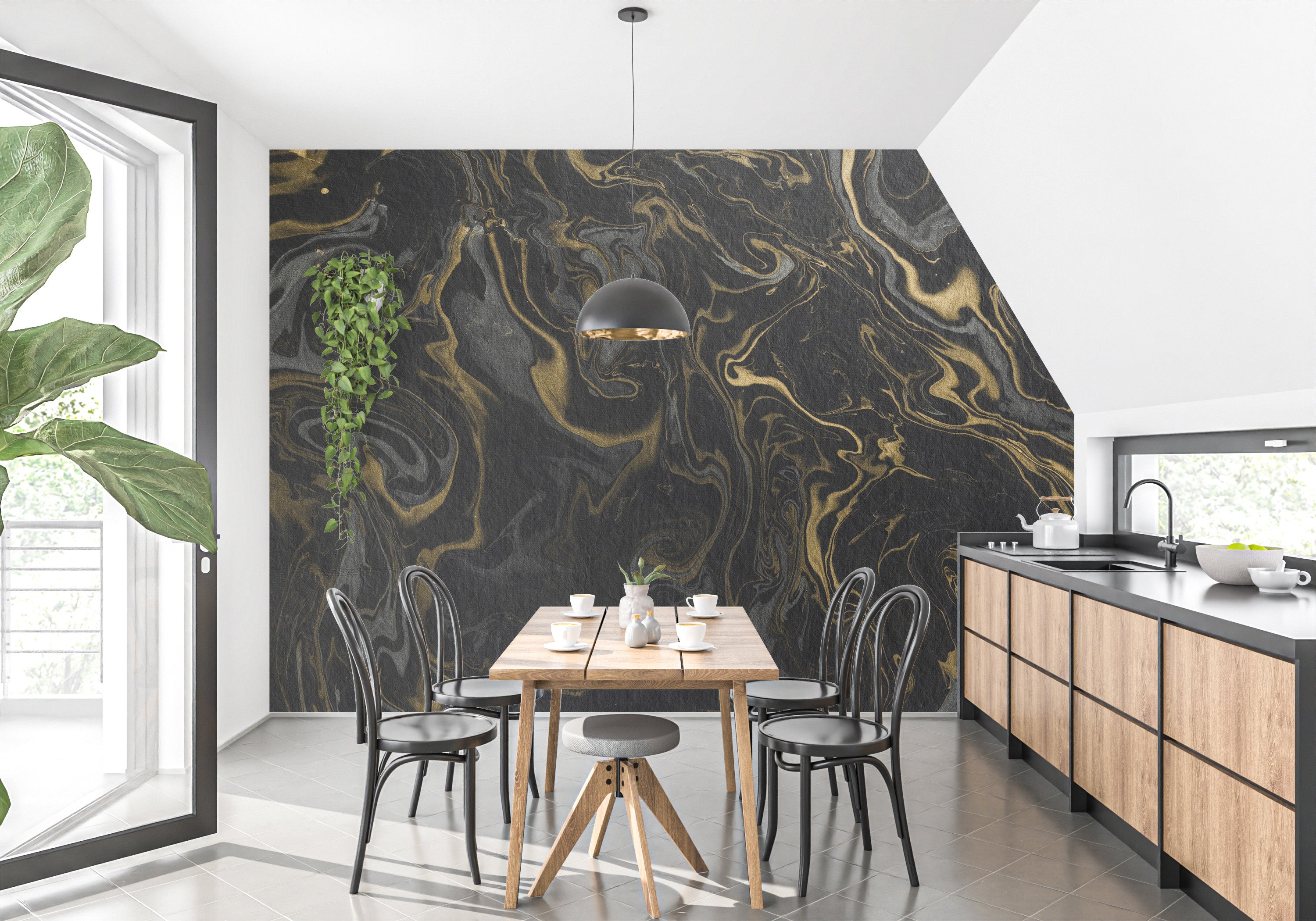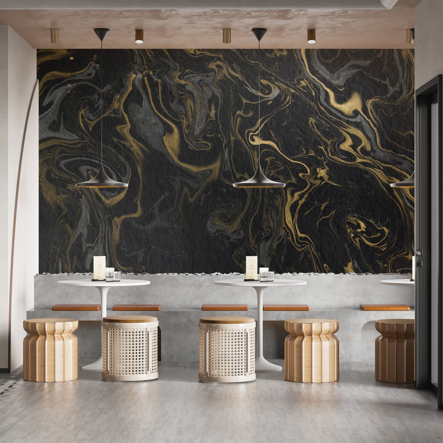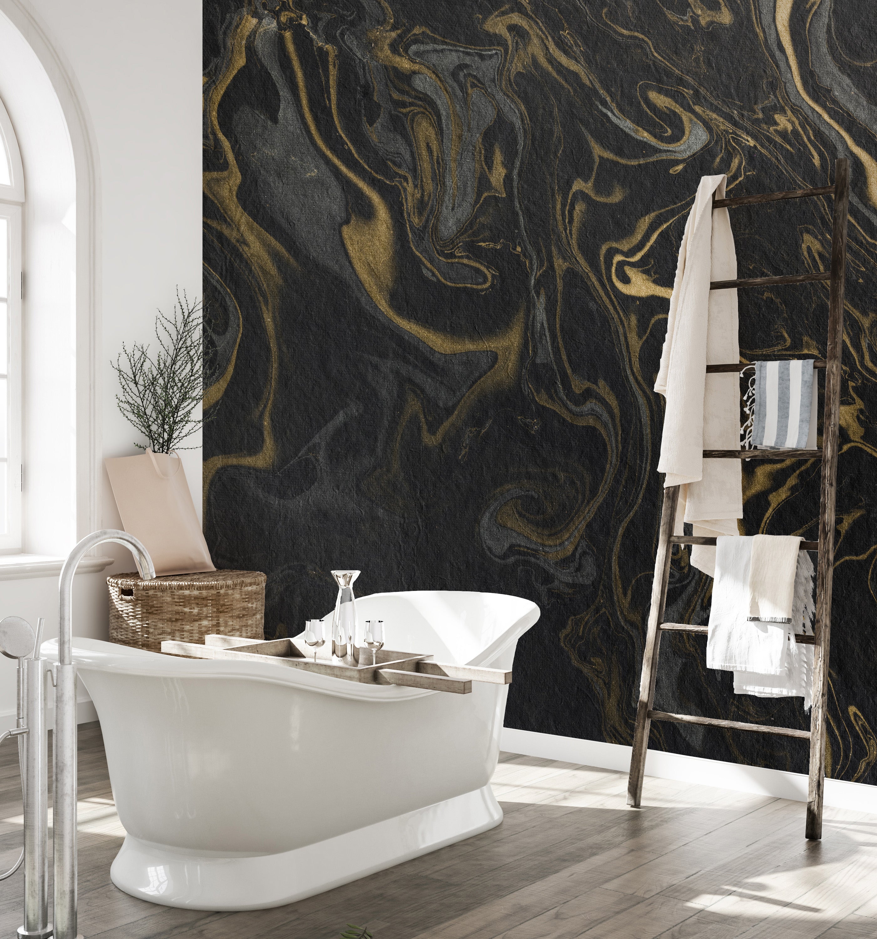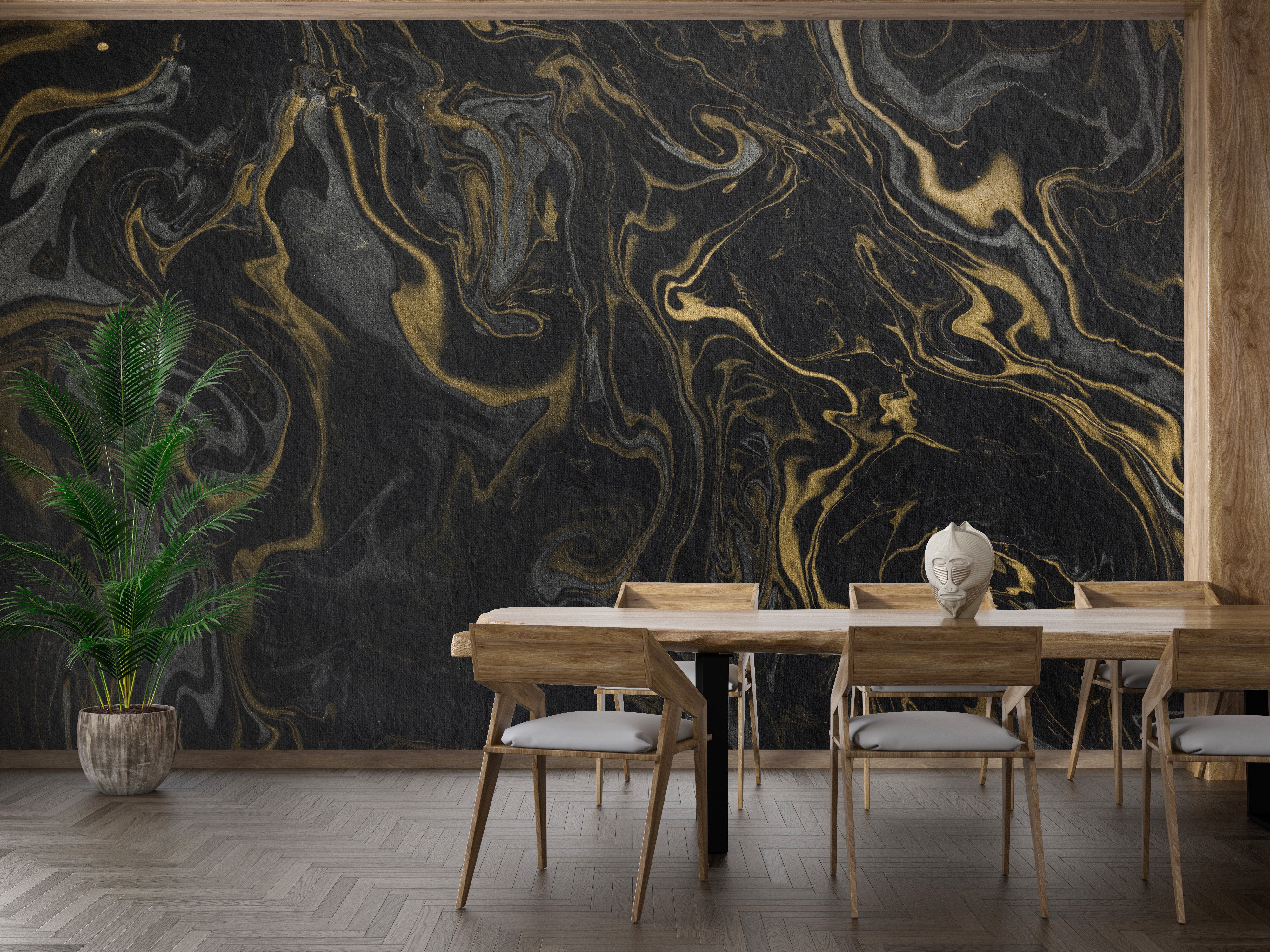 Enhance your room with this elegant black and gold marble wallpaper that emanates luxury and modernity. Create a striking statement in any room with this luxury marble wallpaper in dark marble tones and rich gold accents. Perfect for creating an elite look in living rooms, bedrooms, or offices, this wallpaper serves as both wall decor and an artful accent.