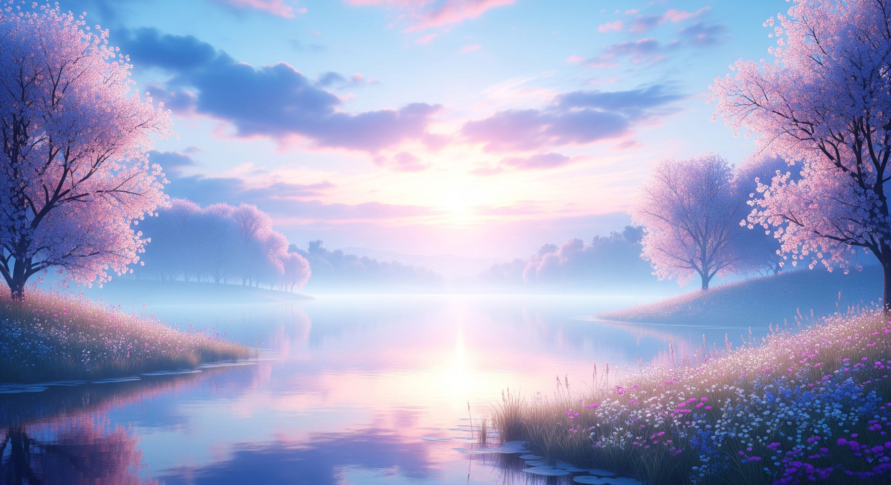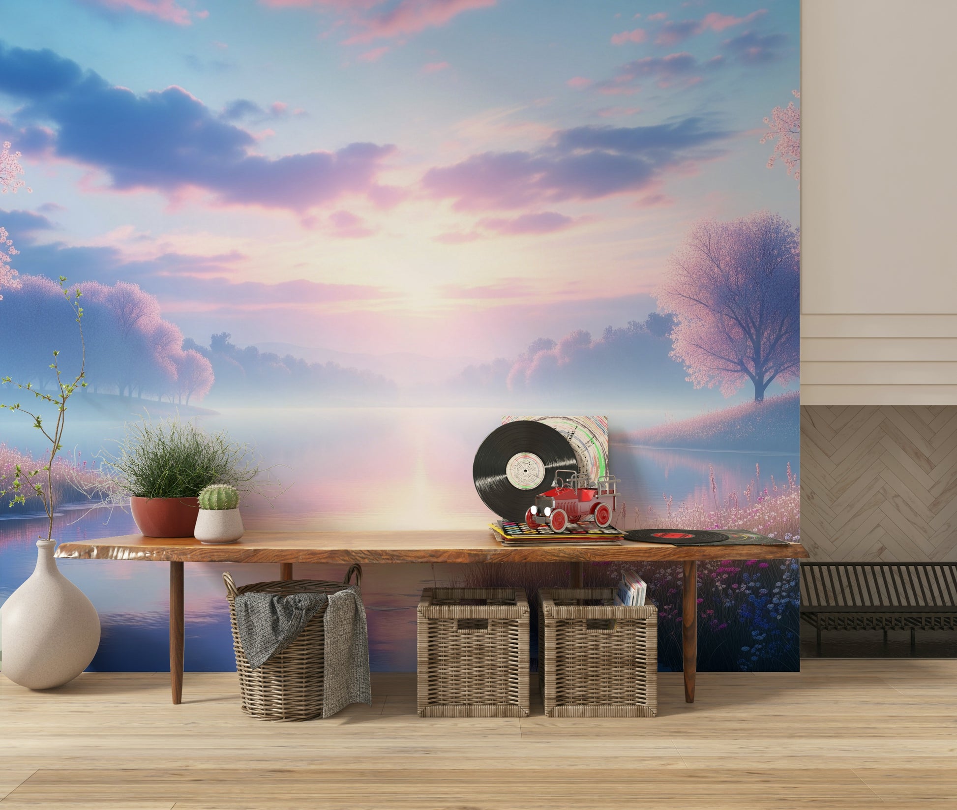 Infuse your rooms with the tranquility of a lakeside dawn with this beautiful wallpaper for walls. Delicate pink blossoms frame a serene lake, capturing a sense of calm and peacefulness. The design presents an ideal backdrop for bedrooms, living rooms, or reading nooks. The soft color scheme brings a touch of elegance and warmth, while the balanced composition evokes a soothing atmosphere. This wallpaper enhances your interior décor by creating a focal point that is both visually appealing and emotionally comforting, perfect for those seeking a peaceful retreat within their home.