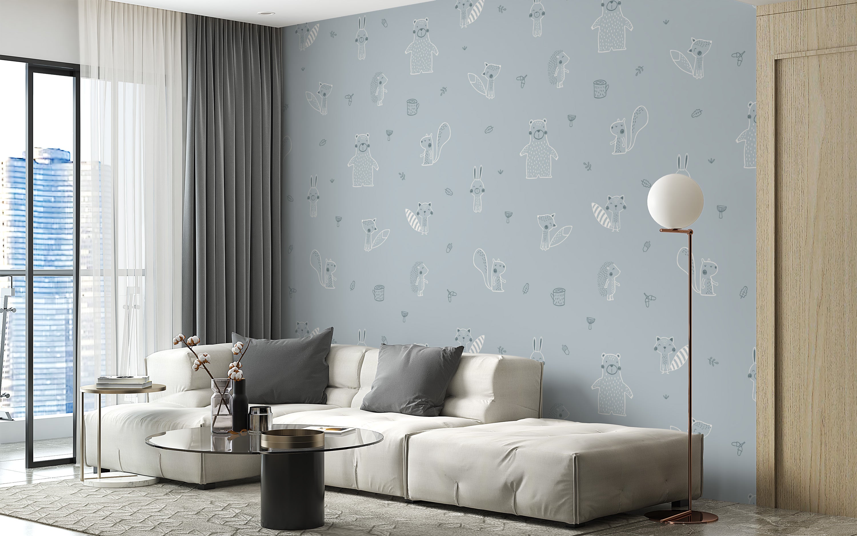 Cute blue woodland creatures wallpaper for kids' spaces.