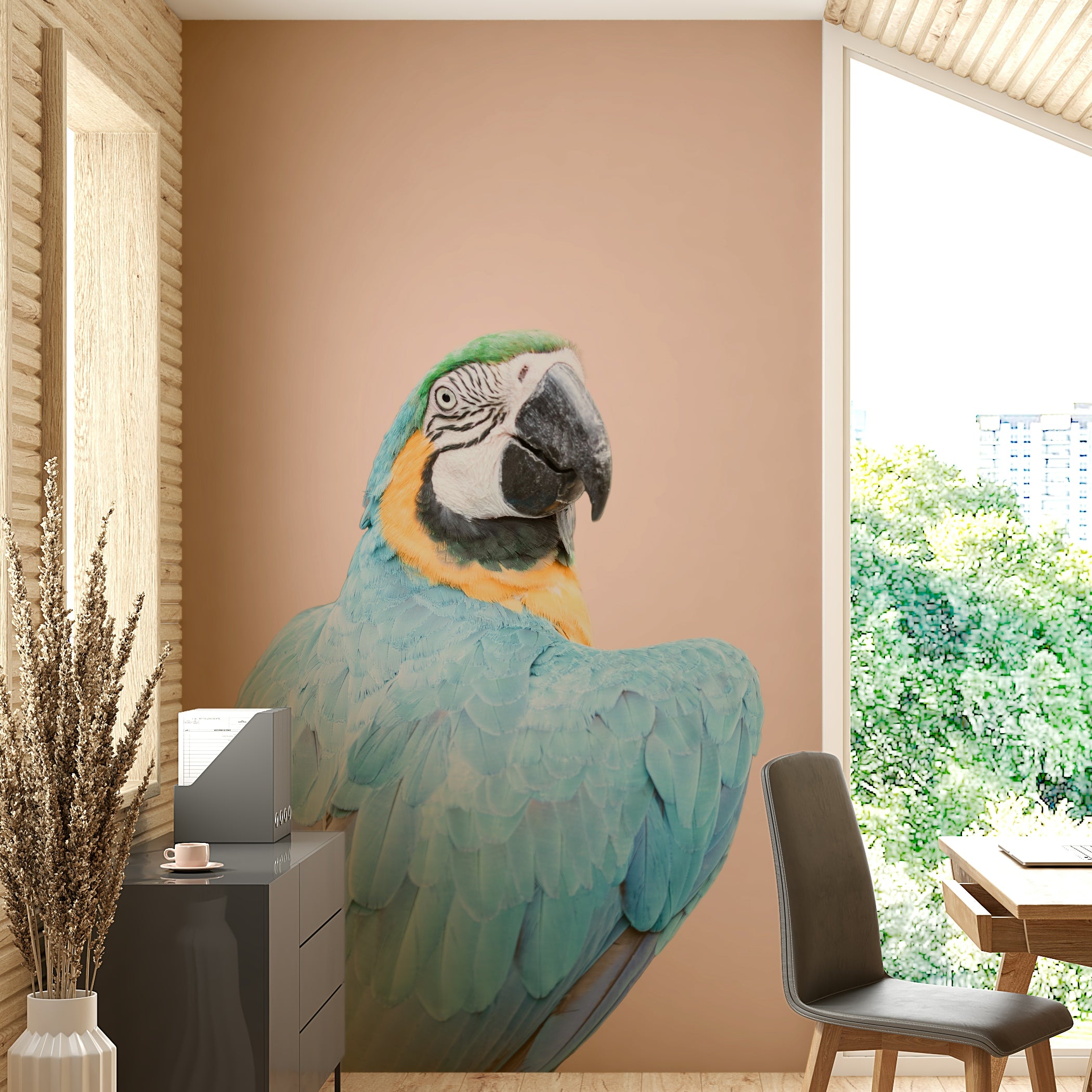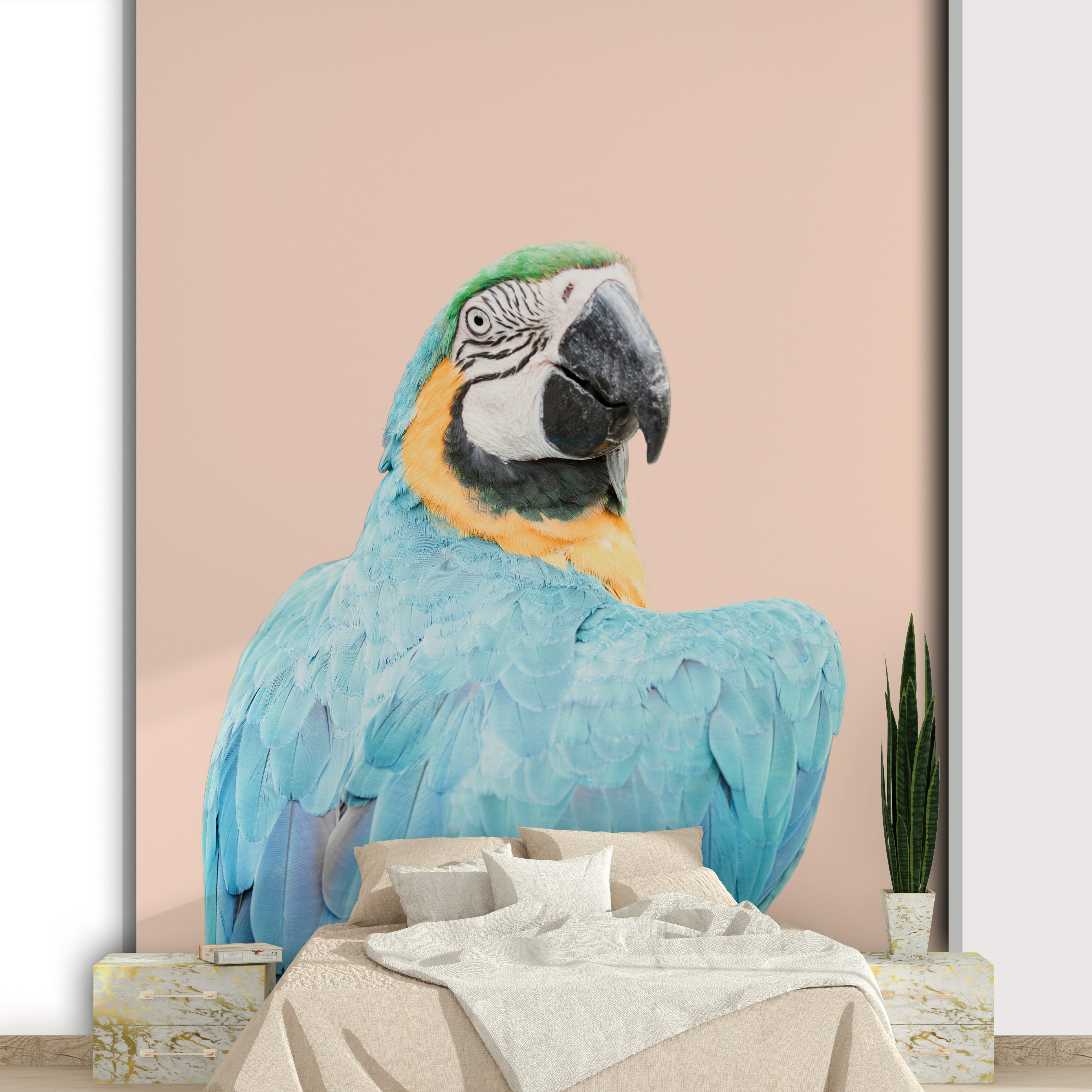 A stunning close-up of a vibrant Blue Macaw against a soft blush pink background. The image showcases the parrot's exquisitely detailed plumage; the rich blues, hints of yellow-gold, and contrasting green on its head create a captivating visual symphony. Its intelligent eye and slightly turned head suggest a moment of curious contemplation, adding a touch of personality to this elegant and serene wallpaper. Perfect for adding a touch of exotic beauty and tranquility to your digital space.