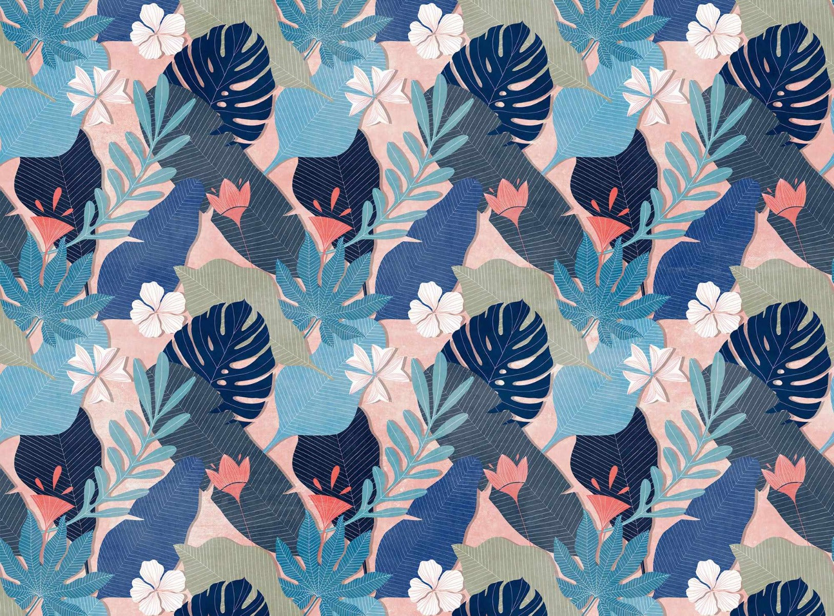 Tropical-inspired blue foliage wallpaper for soothing interiors.
