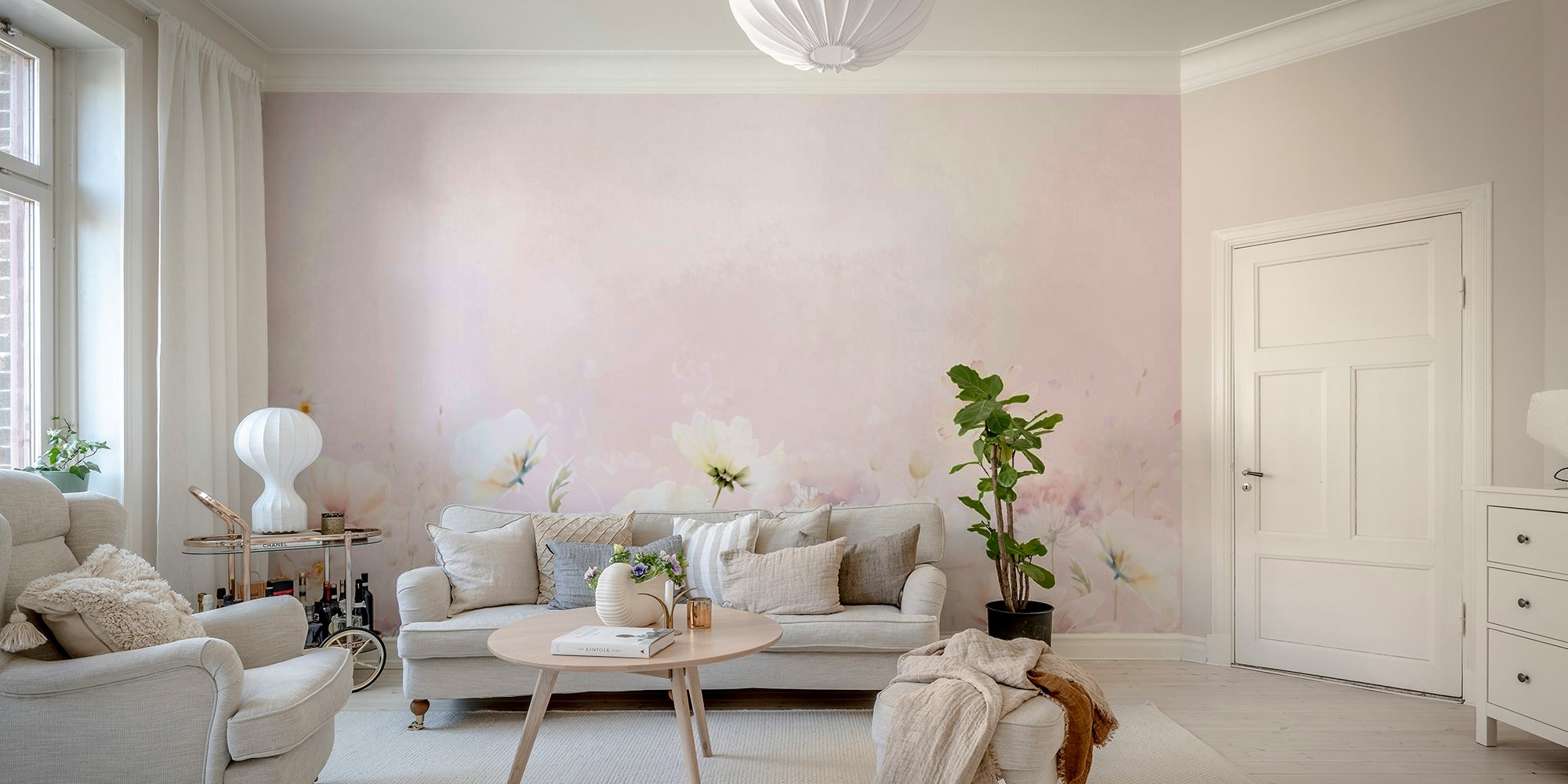 This wallpaper evokes a serene and romantic atmosphere with its delicate watercolor floral design. Soft blush pinks and creamy whites create a gentle color palette, perfect for bedrooms, nurseries, or any space needing a touch of calm. The flowers, rendered in a dreamy, slightly impressionistic style, appear to gently sway in a soft breeze. The light pink background enhances the overall feeling of tranquility, creating a soothing visual experience. The subtle details and naturalistic composition make it a versatile choice for various interior styles, from modern minimalist to classic romantic.