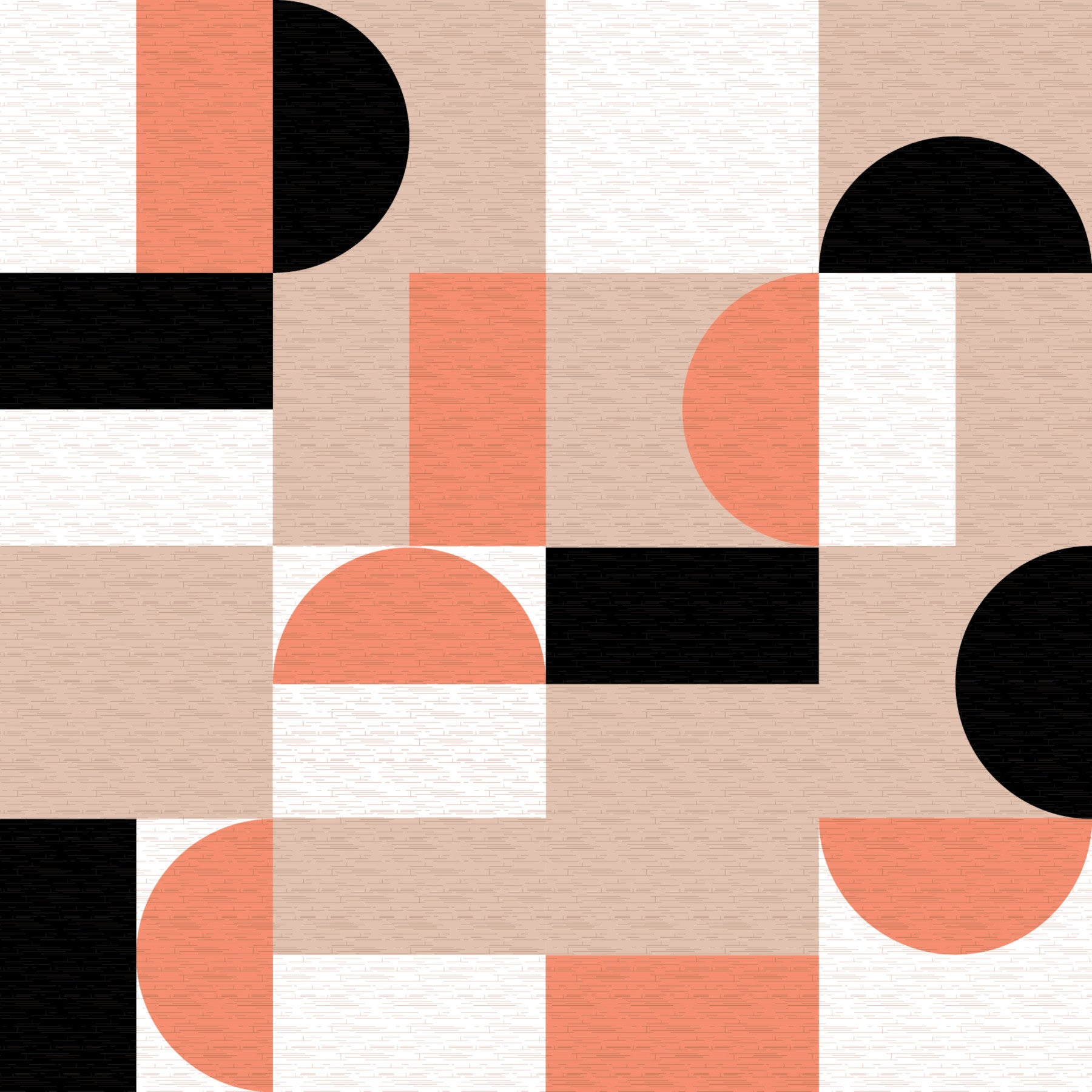 Blush Geometry celebrates the clean geometry of modernist design with soft curves and structured grids. The interplay of blush, coral, white, and black shapes gives it a warm yet graphic energy reminiscent of Bauhaus-inspired forms. This pattern feels architectural yet inviting, perfect for bold statement and modern walls.