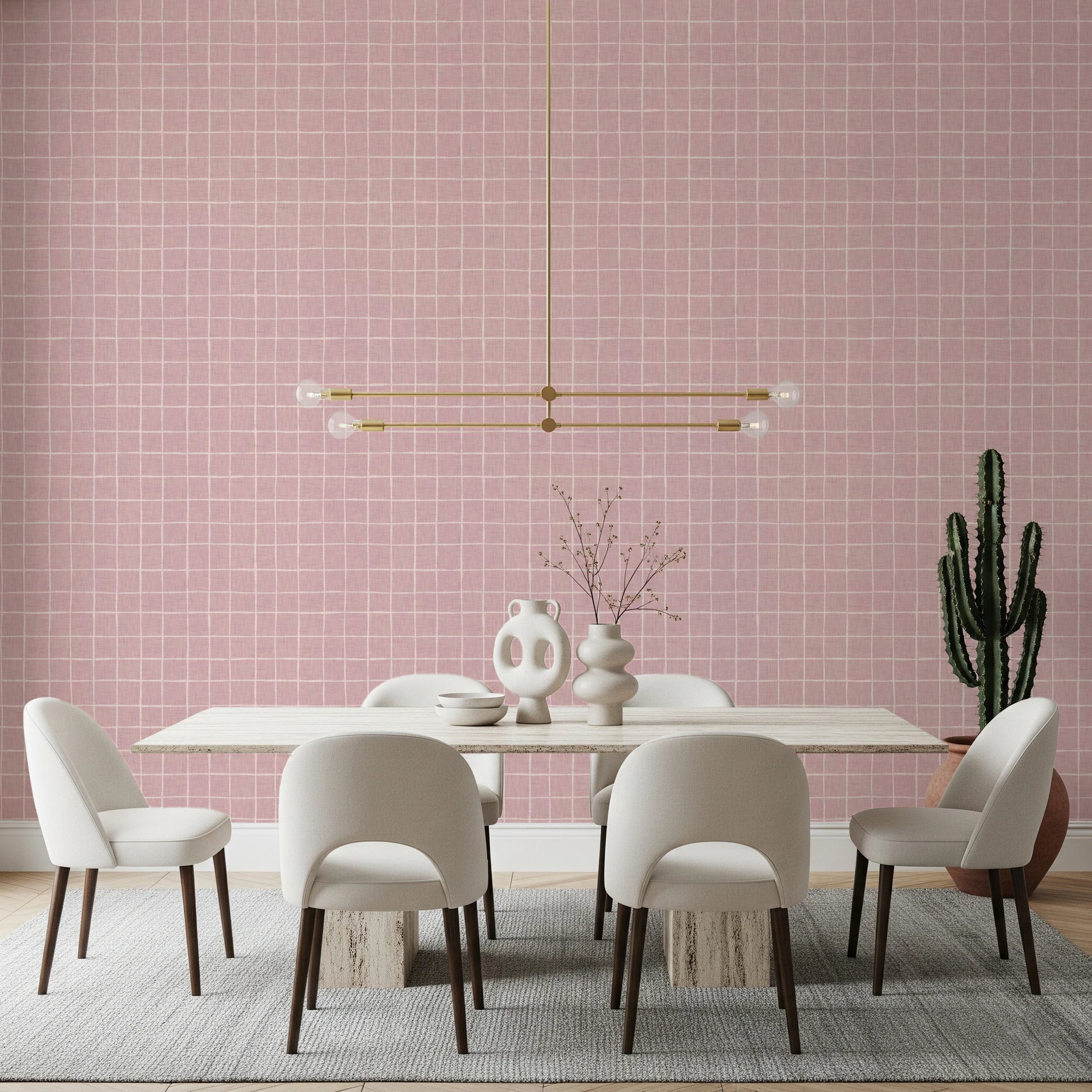 Introduce subtle sophistication with this Blush Linen Grid wallpaper for walls. Featuring a delicate blush pink base intersected by clean, creamy white lines, this design offers a refreshing take on classic grid patterns. The linen-like texture adds depth and dimension to your walls, creating a relaxed and inviting atmosphere. This versatile wallpaper serves as a sophisticated backdrop in living rooms, bedrooms, or home offices. It enhances any space with its light and airy feel, lending a touch of understated charm.