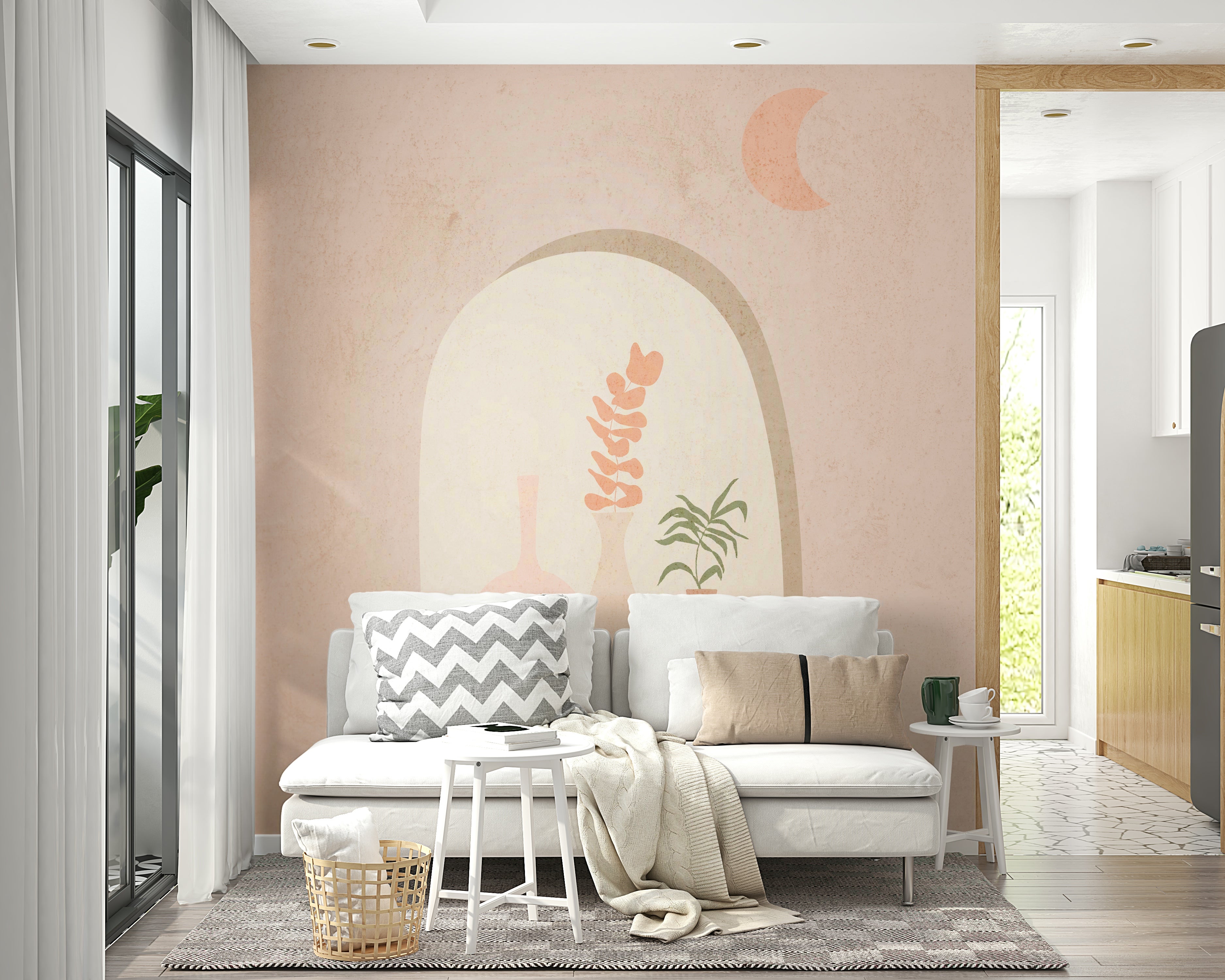 Bring a touch of bohemian charm to your space with this captivating wallpaper. The soft, earthy tones of blush pink, beige, and terracotta create a calming atmosphere, reminiscent of a sun-drenched desert oasis. The stylized illustration of plants and vessels adds a touch of modern artistry, while the crescent moon introduces a mystical element. Ideal for living rooms, bedrooms, or any space needing a dose of serene sophistication. This design effortlessly blends modern and traditional influences to create a stunning statement wall.