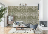 Boho Art Nouveau Scallop Butterfly Floral in Olive Drab Wallpaper⁠