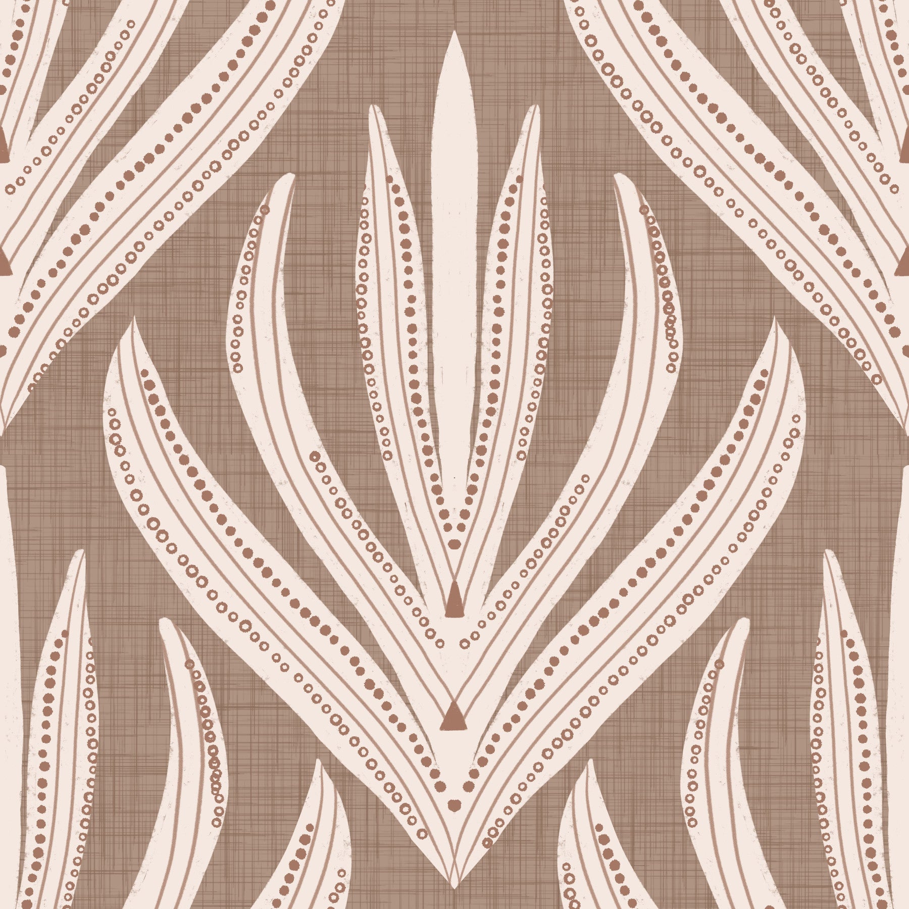 Bring an earthy calmness to your space with this unique pattern. The design features stylized botanical shapes on a linen-look backdrop. Soft beige and brown tones create a warm, inviting atmosphere. Imagine this wallpaper for walls gracing a living room, bedroom, or hallway. It effortlessly blends with boho, rustic, or minimalist interiors, offering a neutral yet intriguing backdrop that complements furniture and decor. Enhance your home with its simple elegance.