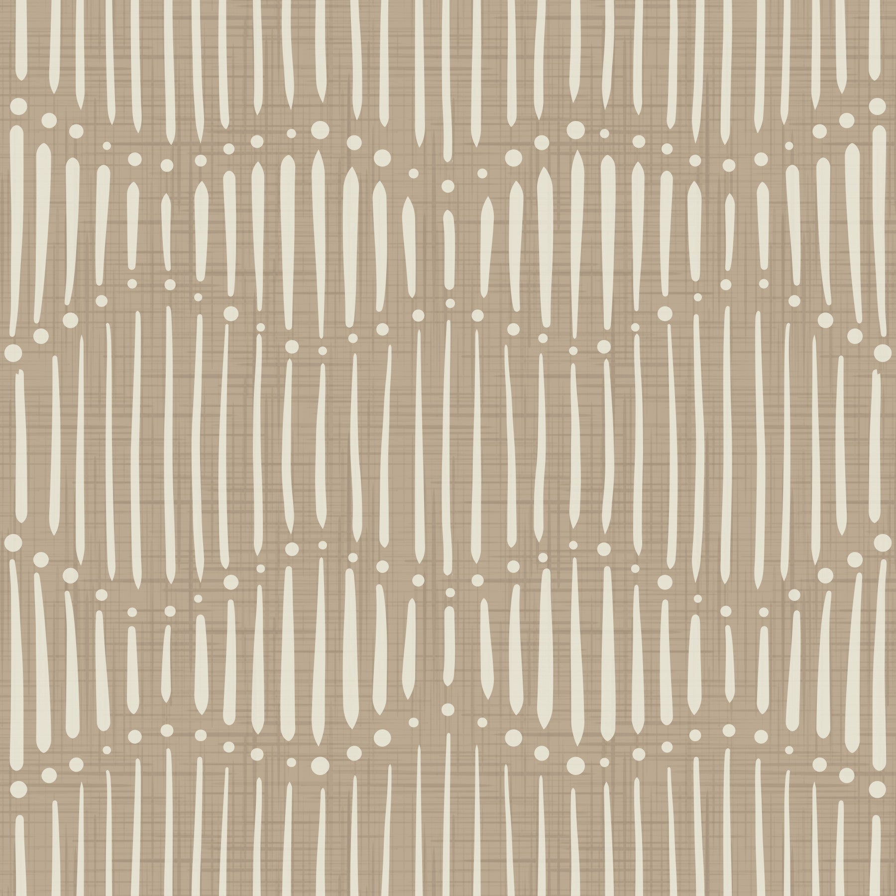 Embark on a visual journey with Boho Waves On Safari Canvas a wallpaper that fuses bohemian artistry with the untamed spirit of the African plains. This design showcases elongated, wave-like patterns reminiscent of sun-bleached grasses swaying in the safari breeze. The neutral, earth-toned canvas backdrop evokes the raw, natural texture of woven linen, lending a tactile depth to the design. Interspersed among the linear waves are whimsical polka dots, adding a playful, carefree touch that embodies the essence of boho chic. This wallpaper offers a sophisticated yet relaxed aesthetic, ideal for creating a serene and inviting atmosphere in any room. It brings the serenity of the natural world into your living space, blending earthy tones with geometric simplicity and organic inspiration. Embrace the freedom and tranquility of the safari lifestyle with this unique and captivating design.