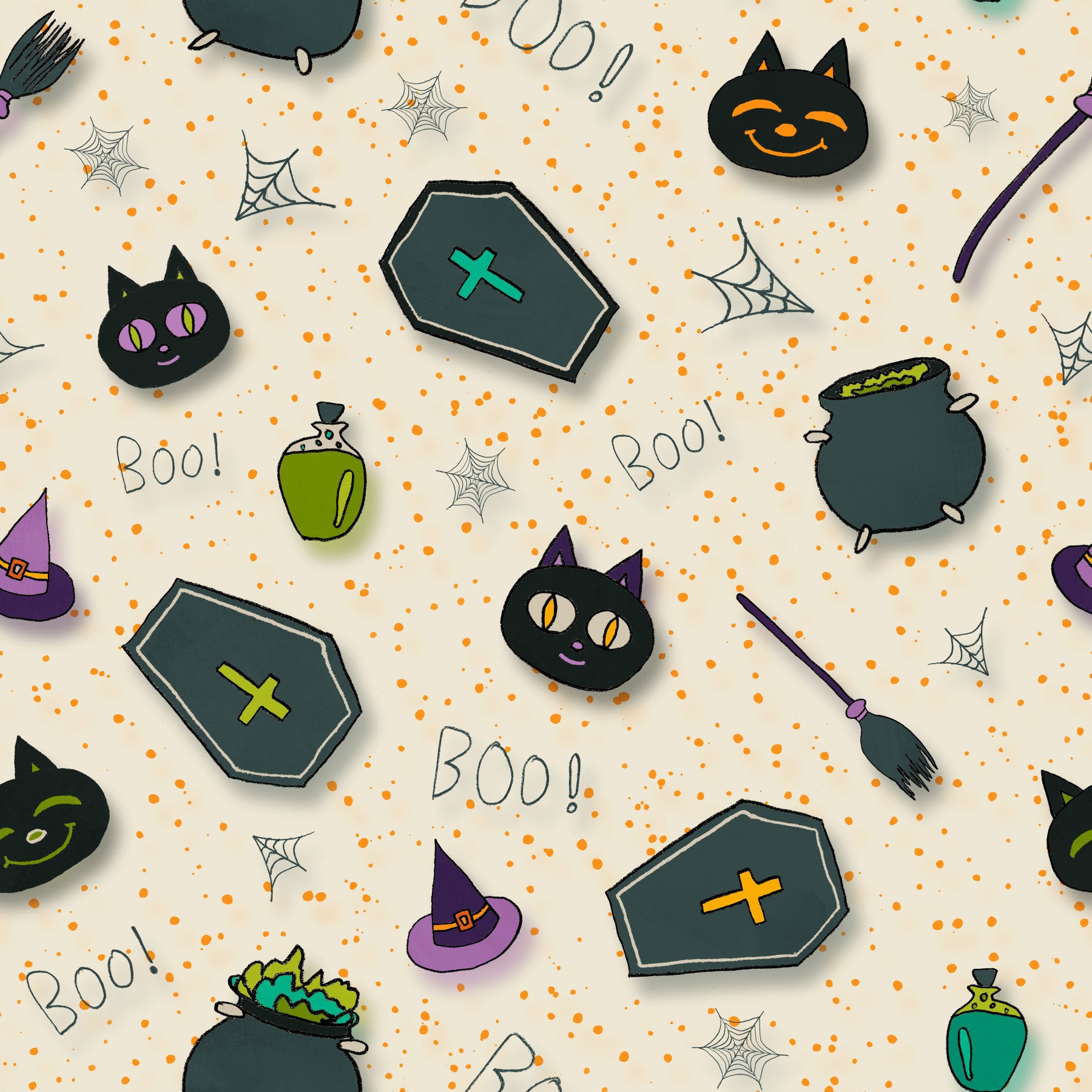 This cheerful Halloween wallpaper for walls features a fun pattern. Black cats, potion bottles, and spiderwebs sit against an off-white backdrop with orange dots. This design works best in kids' rooms, playrooms, or bathrooms. The cute cartoon art complements fun and playful decor. This wallpaper invites you to display the festive spirit of Halloween. Create a delightful spooky mood and bring some charm into every corner.