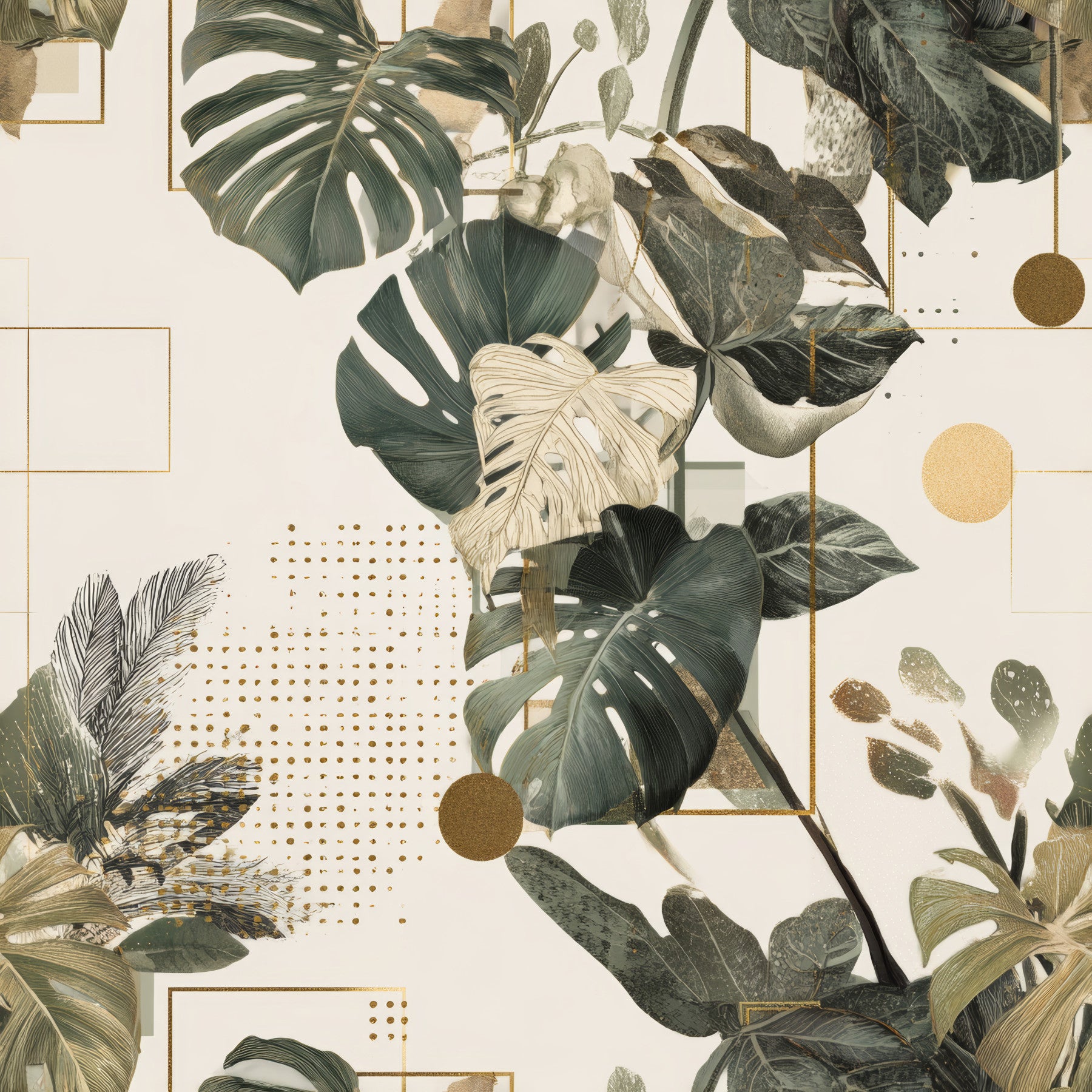 A sophisticated interplay of nature and design, 'Botanical Geometry' presents a stylized jungle of botanicals framed within minimalist geometric forms. Elegant golden squares and circles punctuate the composition, adding a touch of modern luxury to the organic textures of monstera leaves and other exotic foliage. The muted color palette, featuring shades of green, beige, and gold, creates a calm and refined atmosphere. This wallpaper is ideal for those seeking a balanced aesthetic that combines natural beauty with contemporary artistic elements.