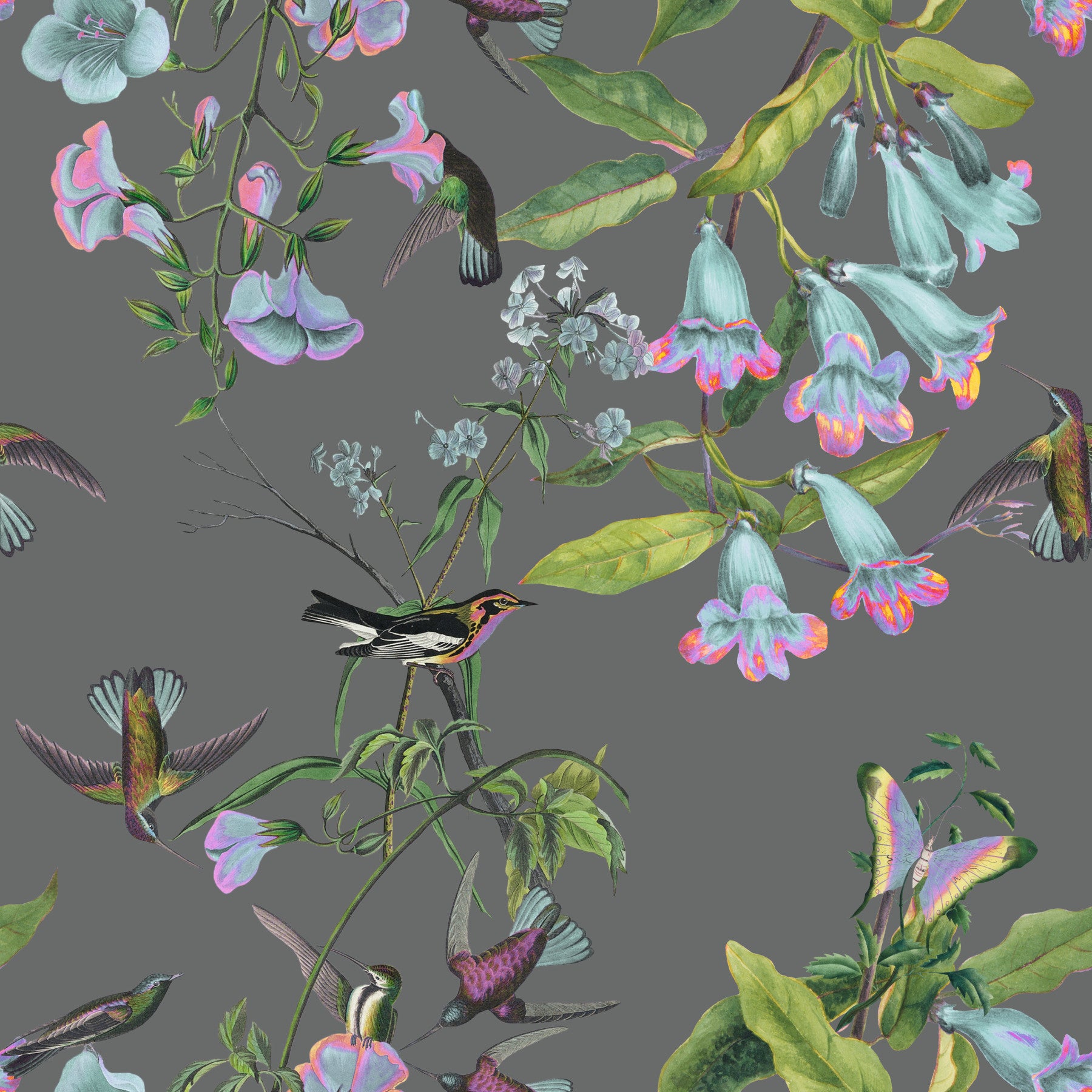 Transform your space with the enchanting design of this wallpaper for walls. Graceful hummingbirds dance amidst a tapestry of vibrant flowers and lush foliage. The grey backdrop allows the soft colors to create a soothing, inviting ambiance. Consider this wallpaper in bedrooms to evoke a sense of serenity. Living rooms and studies also benefit from the calming influence of nature. The detailed brushwork complements traditional and contemporary interiors, crafting an environment brimming with natural artistry and quiet beauty.